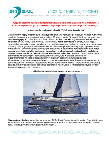 Rejs żeglarski na powitanie/pożegnanie lata pod żaglami w Chorwacji ! Oferta rejsów turystyczno-stażowych po wodach Adriatyku - Dalmacja ! w terminach: maj – październik (7 dni, sobota-sobota) Organizujemy rejsy tygodniowe i dwutygodniowe w Chorwacji po ciepłych wodach Adriatyku (średnia temperatura powietrza we wrześniu 28 stopni, wody 24 stopni) żeglując i odwiedzając urokliwe wyspy (Kornaty, Korcula, Brać, Solta) , ciche zatoczki, najciekawsze zabytkowe miasta (Sibenik, Hvar, Split, Korcula, Dubrownik) , Parki Narodowe (Kornaty, Krka, Mljet). Korzystając z uroków morza nurkujemy w krystalicznie czystej wodzie, pływamy na windsurfingu, opalamy ciała w gorących promieniach słońca. Gwarantujemy doskonały wypoczynek w miłym towarzystwie i pod opieką doświadczonych skipperów. Codziennie odwiedzamy nowe porty i mariny, urokliwe knajpki, nurkujemy w zacisznych, bezludnych zatoczkach, żeglujemy pomiędzy wyspami i na pełnym morzu, zarówno w dzień jak i w nocy. Zwiedzamy miasta z zabytkami architektury jak i podwodne jaskinie czy wykute w skałach bunkry armii jugosłowiańskiej. W czasie rejsów szkolimy chętnych poznania sztuki żeglarskiej i windsurfingu oraz zaliczamy godziny stażu na stopnie żeglarskie. Zapewniamy super ekipę, doświadczonych sterników, niesamowite widoki, rewelacyjne zdjęcia i wspomnienia, słoneczną pogodę, brązową opaleniznę, szkolenie żeglarskie, nurkowanie w krystalicznie czystej wodzie, doskonały wypoczynek i relaks … … widok jachtu Bavaria 44 pod żaglami na pełnym morzu … Wyposażenie jachtu: autopilot, echosonda, GPS, Chart Ploter, log, roller grota i foka, elektryczna winda kotwiczna, ponton, kompletne wyposażenie kuchni, kuchenka gazowa, lodówka, pościel, koce, toaleta, prysznic wewnętrzny i zewnętrzny … Dane techniczne czarterowanego jachtu Bawaria 44: Rok budowy – 2007/2008 Długość całkowita – 13,95 m Szerokość całkowita – 4,25 m Zanurzenie – 1,95 m Wyporność – 8900 kg Silnik – Volvo 55 KM Zbiornik wody – 380 l Zbiornik paliwa – 230 l Powierzchnia żagli – grot 39,50; Genua 45,50 : spinaker 110,00 Kabiny – 4 kabiny dwuosobowe + dwie toalety z WC Koje – 8 +1 (salon) rzut wnętrza jachtu … 4 kabiny 2 osobowe, salon z kuchnią , 2 x łazienki z wc … … widok na salon, kuchnię i kabinę dziobową … Planowana trasa* wariant A (7dni, sobota-sobota): środkowa i południowa Dalmacja Trogir – Miljet - Dubrovnik – Korczula – Hvar – wyspa Św. Klementa - Brać – Trogir - 294 Mm Planowana trasa* wariant B (7dni sobota-sobota): środkowa i północna Dalmacja Zadar- Sali- Zirje –Sibenik – Skradin (wodospady Krka)–Vodice-Betina–Iż Veli – Zadar – 150 Mm Koszty i warunki płatności za rejs tygodniowy na osobę od: 300,00 Euro + 150,00 Euro zwrotnej kaucji za jacht Cena zawiera: koszt 7-mio dniowego jachtu Bavaria 44 lub innego tej samej klasy, 3-4 kabiny dwuosobowe + salon, 2 łazienki, usługi pilota, sternika, przewodnika, opłaty klimatyczne, ubezpieczenie NNW, KL, OC/R i OC/O – Allianz … Cena nie zawiera: opłat jachtowych (pościel, ręczniki – dla chętnych 15 Euro od osoby, sprzątania końcowego – obligatoryjnie 100 Euro za jacht, paliwo i woda – obligatoryjnie około 100 Euro za jacht, silnika do pontonu – opcjonalnie około 100 Euro), portowych (zależne od ilości odwiedzanych portów), wyżywienia (załoga składa się po około 50 Euro), dojazdu … Rezerwacje/zaliczka: 200,00 Euro od osoby płatna przy dokonaniu rezerwacji … Dojazd: indywidualnie (kompletujemy 4-ro osobowe składy do samochodów) lub autobus (koszt 350,00 PLN od osoby w obie strony, Wrocław - Zadar 1065 km) lub przelot samolotem Prześlijcie proszę tą ofertę wszystkim Waszym znajomym aby powiększyć liczbę ewentualnych chętnych - możecie sami kompletować 6-8 osobowe załogi i dobrać dowolne terminy rejsów ! Pytania i zgłoszenia prosimy kierować: Biuro Turystyki Aktywnej i Obsługi Biznesu „Ski and Sail” Grzegorz Krawczyk Aleja Marcina Kromera 69/3 51-163 Wrocław Konto bankowe: BPH S.A. o/Wrocław 81 1060 0076 0000 3260 0089 5711 [email protected] telefon: 0 601-710-602 * trasa rejsu może ulec zmienia ze względu na warunki pogodowe i żeglarskie, powyższa oferta nie stanowi oferty w rozumieniu art. 66 i następnych Kodeksu Cywilnego,