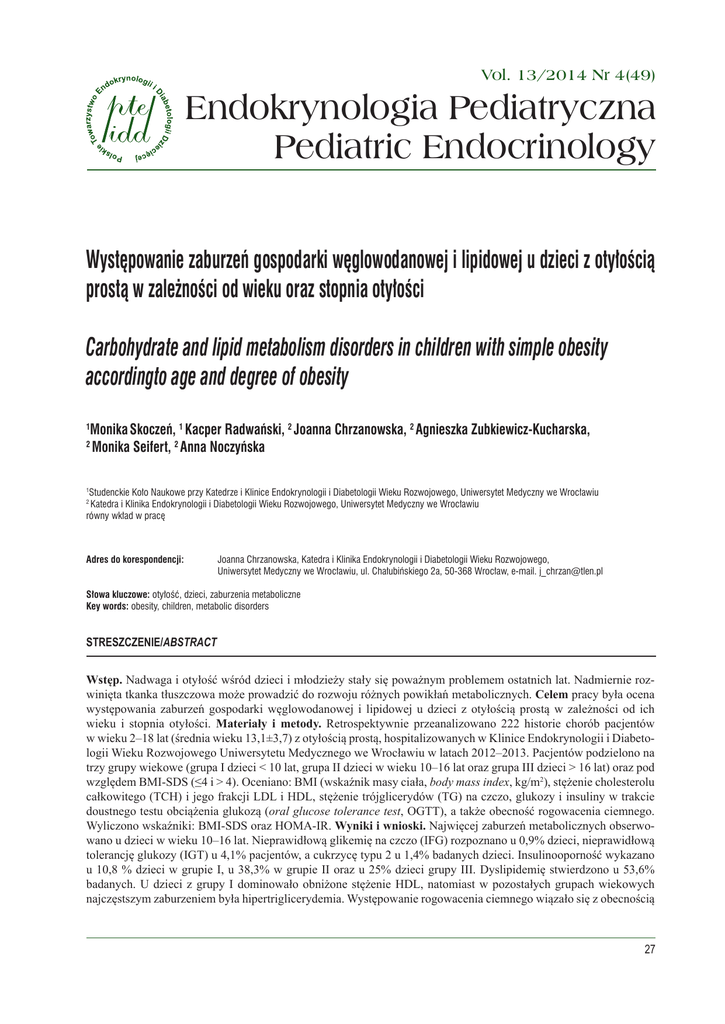 Skoczeń M. i inni: Występowanie zaburzeń gospodarki węglowodanowej i lipidowej u dzieci z otyłością prostą w zależności od wieku oraz stopnia otyłości Vol. 13/2014 Nr 4(49) Endokrynologia Pediatryczna Pediatric Endocrinology Występowanie zaburzeń gospodarki węglowodanowej i lipidowej u dzieci z otyłością prostą w zależności od wieku oraz stopnia otyłości Carbohydrate and lipid metabolism disorders in children with simple obesity accordingto age and degree of obesity Monika Skoczeń, 1 Kacper Radwański, 2 Joanna Chrzanowska, 2 Agnieszka Zubkiewicz-Kucharska, Monika Seifert, 2 Anna Noczyńska 1 2 Studenckie Koło Naukowe przy Katedrze i Klinice Endokrynologii i Diabetologii Wieku Rozwojowego, Uniwersytet Medyczny we Wrocławiu Katedra i Klinika Endokrynologii i Diabetologii Wieku Rozwojowego, Uniwersytet Medyczny we Wrocławiu równy wkład w pracę 1 2 Adres do korespondencji: Joanna Chrzanowska, Katedra i Klinika Endokrynologii i Diabetologii Wieku Rozwojowego, Uniwersytet Medyczny we Wrocławiu, ul. Chałubińskiego 2a, 50-368 Wrocław, e-mail. [email protected] Słowa kluczowe: otyłość, dzieci, zaburzenia metaboliczne Key words: obesity, children, metabolic disorders STRESZCZENIE/ABSTRACT Wstęp. Nadwaga i otyłość wśród dzieci i młodzieży stały się poważnym problemem ostatnich lat. Nadmiernie rozwinięta tkanka tłuszczowa może prowadzić do rozwoju różnych powikłań metabolicznych. Celem pracy była ocena występowania zaburzeń gospodarki węglowodanowej i lipidowej u dzieci z otyłością prostą w zależności od ich wieku i stopnia otyłości. Materiały i metody. Retrospektywnie przeanalizowano 222 historie chorób pacjentów w wieku 2–18 lat (średnia wieku 13,1±3,7) z otyłością prostą, hospitalizowanych w Klinice Endokrynologii i Diabetologii Wieku Rozwojowego Uniwersytetu Medycznego we Wrocławiu w latach 2012–2013. Pacjentów podzielono na trzy grupy wiekowe (grupa I dzieci < 10 lat, grupa II dzieci w wieku 10–16 lat oraz grupa III dzieci > 16 lat) oraz pod względem BMI-SDS (≤4 i > 4). Oceniano: BMI (wskaźnik masy ciała, body mass index, kg/m2), stężenie cholesterolu całkowitego (TCH) i jego frakcji LDL i HDL, stężenie trójglicerydów (TG) na czczo, glukozy i insuliny w trakcie doustnego testu obciążenia glukozą (oral glucose tolerance test, OGTT), a także obecność rogowacenia ciemnego. Wyliczono wskaźniki: BMI-SDS oraz HOMA-IR. Wyniki i wnioski. Najwięcej zaburzeń metabolicznych obserwowano u dzieci w wieku 10–16 lat. Nieprawidłową glikemię na czczo (IFG) rozpoznano u 0,9% dzieci, nieprawidłową tolerancję glukozy (IGT) u 4,1% pacjentów, a cukrzycę typu 2 u 1,4% badanych dzieci. Insulinooporność wykazano u 10,8 % dzieci w grupie I, u 38,3% w grupie II oraz u 25% dzieci grupy III. Dyslipidemię stwierdzono u 53,6% badanych. U dzieci z grupy I dominowało obniżone stężenie HDL, natomiast w pozostałych grupach wiekowych najczęstszym zaburzeniem była hipertriglicerydemia. Występowanie rogowacenia ciemnego wiązało się z obecnością 27 Praca oryginalna Endokrynol. Ped., 13/2014;4(49):27-36 insulinooporności i hiperinsulinemii. Istotną zależność pomiędzy stopniem otyłości a zaburzeniami metabolicznymi wykazano jedynie u dzieci w grupie II. Endokrynol. Ped. 13/2014;4(49):27-36. Introduction. Childhood overweight and obesity has become a serious problem in recent years. Overly-developed fat tissue may lead to the development of various metabolic complications. The aim of our study was to evaluate the prevalence of carbohydrate and lipid metabolism disorders in obese children, according to their age and degree of obesity. Materials and methods. Retrospective analysis of 222 medical records of children aged between 2 and 18 years with simple obesity, hospitalized in the Department of Endocrinology and Diabetology for Children and Adolescents, Wrocław Medical University in 2012-2013 was done. Children were divided by age (<10 years old, 1016 years old and >16 years old) and by BMI-SDS (≤4 and >4). Analyzed parameters were: BMI (body mass index, kg/ m2), levels of total cholesterol, LDL-cholesterol, HDL-cholesterol, as well asfasting triglycerides, levels of glucose and insulin fasting and during OGTT (oral glucose tolerance test) and the presence of acanthosis nigricans. BMI-SDS (BMI-standard deviation score,) and HOMA-IR (homeostatic model assessment- insulin resistance) were calculated. Results and conclusions. Metabolic disorders were most frequent in the group of children aged 10–16 years. Impaired fasting glycaemia (IFG) was diagnosed in 0.9% patients, impaired glucose tolerance (IGT) in 4.1%, and diabetes type 2 in 1.4% of all studied children. Insulin resistance were present in 10,8% of children aged<10 years, 38,3% children aged 10–16 years and 25%>16 years old children. Incidence of acanthosis nigricans was associated with the insulin resistance and hyperinsulinemia. Lipid disorders were present in 53.6% of patients. It was noticed that in children below <10 years old, level of HDL cholesterol was decreased and for the remaining age-groups hypertriglyceridemia was the most common lipid disorder. Significant correlation between the degree of obesity and metabolic disorders was present only in children 10–16 years of age. Pediatr. Endocrinol. 13/2014;4(49):27-36. Wstęp Częstość występowania otyłości i nadwagi wśród dzieci i młodzieży przybrała rozmiary epidemii [1]. Badania dowodzą, że otyłość dotyczy 4–5% polskich dziewczynek i 3,5–5% chłopców, a z nadwagą boryka się odpowiednio 7–11% dziewczynek i 8–16% chłopców [2,3]. Naukowcy potwierdzają, że otyłość występująca w dzieciństwie jest czynnikiem ryzyka choroby niedokrwiennej serca oraz otyłości w wieku dorosłym [4–7]. U otyłych pacjentów istotne jest wyjaśnienie przyczyny otyłości, a następnie przeprowadzenie badań mających na celu ocenę zaburzeń gospodarki węglowod