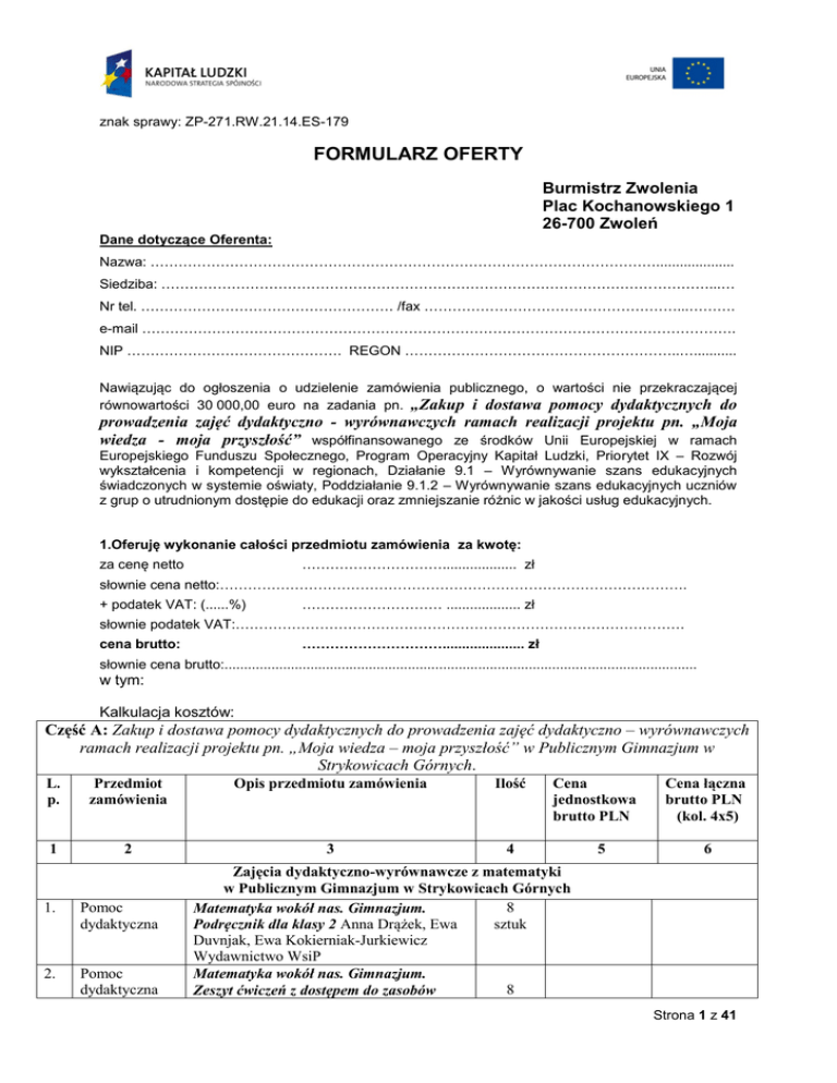 znak sprawy: ZP-271.RW.21.14.ES-179 FORMULARZ OFERTY Burmistrz Zwolenia Plac Kochanowskiego 1 26-700 Zwoleń Dane dotyczące Oferenta: Nazwa: ……………………………………………………………………………………………….................... Siedziba: ………………………………………………………………………………………………………...… Nr tel. ……………………………………………… /fax ………………………………………………...………. e-mail ………………………………………………………………………………………………………………. NIP ………………………………………. REGON …………………………………………………..…........... Nawiązując do ogłoszenia o udzielenie zamówienia publicznego, o wartości nie przekraczającej równowartości 30 000,00 euro na zadania pn. „Zakup i dostawa pomocy dydaktycznych do prowadzenia zajęć dydaktyczno - wyrównawczych ramach realizacji projektu pn. „Moja wiedza - moja przyszłość” współfinansowanego ze środków Unii Europejskiej w ramach Europejskiego Funduszu Społecznego, Program Operacyjny Kapitał Ludzki, Priorytet IX – Rozwój wykształcenia i kompetencji w regionach, Działanie 9.1 – Wyrównywanie szans edukacyjnych świadczonych w systemie oświaty, Poddziałanie 9.1.2 – Wyrównywanie szans edukacyjnych uczniów z grup o utrudnionym dostępie do edukacji oraz zmniejszanie różnic w jakości usług edukacyjnych. 1.Oferuję wykonanie całości przedmiotu zamówienia za kwotę: …………………………................... zł za cenę netto słownie cena netto:………………………………………………………………………………………. + podatek VAT: (......%) ………………………… ................... zł słownie podatek VAT:…………………………………………………………………………………… …………………………..................... zł cena brutto: słownie cena brutto:......................................................................................................................... w tym: Kalkulacja kosztów: Część A: Zakup i dostawa pomocy dydaktycznych do prowadzenia zajęć dydaktyczno – wyrównawczych ramach realizacji projektu pn. „Moja wiedza – moja przyszłość” w Publicznym Gimnazjum w Strykowicach Górnych. L. p. Przedmiot zamówienia Opis przedmiotu zamówienia Ilość 1 2 3 4 1. Pomoc dydaktyczna 2. Pomoc dydaktyczna Cena jednostkowa brutto PLN 5 Cena łączna brutto PLN (kol. 4x5) 6 Zajęcia dydaktyczno-wyrównawcze z matematyki w Publicznym Gimnazjum w Strykowicach Górnych 8 Matematyka wokół nas. Gimnazjum. Podręcznik dla klasy 2 Anna Drążek, Ewa sztuk Duvnjak, Ewa Kokierniak-Jurkiewicz Wydawnictwo WsiP Matematyka wokół nas. Gimnazjum. 8 Zeszyt ćwiczeń z dostępem do zasobów Strona 1 z 41 3. Pomoc dydaktyczna 4. Pomoc dydaktyczna Pomoc dydaktyczna 5. WsiPnet.pl Gimnazjum klasa 2, część I, Barbara Podobińska, Teresa Przetacznik – Dąbrowa, Wydawnictwo WsiP Matematyka wokół nas. Gimnazjum. Zeszyt ćwiczeń z dostępem do zasobów WsiPnet.pl Gimnazjum klasa 2, część II, Barbara Podobińska, Teresa Przetacznik – Dąbrowa, Wydawnictwo WsiP Zeszyt w kratkę 80 kartkowy w formacie A5 Długopis o przezroczystej budowie z wymiennym wkładem czarnym lub niebieskim, ze skuwką, cienka końcówka – min. 0,7 mm wykonana z niklowanego srebra, grubość linii pisania to min. 0,27 mm 6. Pomoc dydaktyczna Ołówek z gumką wykonany z żywicy syntetycznej charakteryzujący się wysoką elastycznością, super trwały grafit, który nie łamie się, gdy ołówek spadnie na podłogę, doskonale się ostrzy. 7. Pomoc dydaktyczna Matematyka wokół nas. Gimnazjum. Podręcznik dla klasy 3 Anna Drążek, Ewa Duvnjak, Ewa Kokierniak-Jurkiewicz Wydawnictwo WsiP Pomoc dydaktyczna Matematyka wokół nas. Gimnazjum. Zeszyt ćwiczeń z dostępem do zasobów WsiPnet.pl Gimnazjum klasa 3, część I, Barbara Podobińska, Teresa Przetacznik – Dąbrowa, Wydawnictwo WsiP Pomoc dydaktyczna Matematyka wokół nas. Gimnazjum. Zeszyt ćwiczeń z dostępem do zasobów WsiPnet.pl Gimnazjum klasa 3, część II, Barbara Podobińska, Teresa Przetacznik – Dąbrowa, Wydawnictwo WsiP Pomoc dydaktyczna Matma? OK! Nowa formuła egzaminu gimnazjalnego z matematyki od 2012, Włodzimierz Obremski, Wydawnictwo TUTOR 8. 9. 10. sztuk 8 sztuk 8 sztuk 13 sztuka 13 sztuka 5 sztuk 5 sztuk 5 sztuk 5 sztuk Razem: Zajęcia dydaktyczno-wyrównawcze z ICT w Publicznym Gimnazjum w Strykowicach Górnych 1. Pomoc dydaktyczna Informatyka. Plansze interaktywne 2.0. Gimnazjum to program komputerowy składający się z kilkudziesięciu plansz interaktywnych. Zawarte w nim treści edukacyjne zostały przygotowane zgodnie z podstawą programową do nauczania 1 Zestaw Strona 2 z 41 2. Pomoc dydaktyczna informatyki w gimnazjum Materiał podzielono na następujące działy tematyczne: - "Komputer kiedyś i dzisiaj", - "Z czego składa się komputer", - "Komputer a prawo", - "System operacyjny a dane w komputerze", - "Bezpieczny komputer", - "Sieci komputerowe", - "Internet", - "Wyszukiwanie informacji", - "Komunikacja w sieci", - "Język HTML i budowa stron WWW", - "Tworzenie dokumentów tekstowych", - "Arkusze kalkulacyjne", - "Bazy danych", - "Grafika komputerowa", - "Multimedia w komputerze", - "Algorytmy i symulacje komputerowe". Plansze składają się z animacji, dźwiękowych komentarzy oraz z testów. Towarzyszą im także dodatkowe narzędzia multimedialne. Dopisywanie komentarzy, możliwość podkreślania wybranych treści oraz zaznaczania lub zakrywania dowolnych elementów znajdujących się na planszy, umożliwia nauczycielowi przeprowadzenie ciekawej i interaktywnej lekcji. Do pakietu dołączony jest opis poszczególnych tematów lekcji, przy których plansza może stanowić po