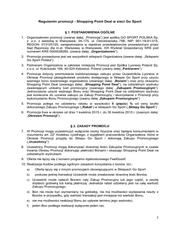 Regulamin promocji - Shopping Point Deal w sieci Go Sport § 1. POSTANOWIENIA OGÓLNE 1. Organizatorem promocji (zwanej dalej: „Promocją”) jest spółka GO SPORT POLSKA Sp. z .o.o. z siedzibą w Warszawie, 04-175, ul. Ostrobramska 75B, NIP: 951-18-61-015, REGON: 013125125, zarejestrowana w rejestrze przedsiębiorców prowadzonym przez Sąd Rejonowy dla m.st. Warszawy w Warszawie, XIII Wydział Gospodarczy KRS pod numerem KRS 0000028260, (zwana dalej: „Organizatorem“). 2. Promocja prowadzona jest we wszystkich sklepach Organizatora (zwane dalej: „Sklepami Go Sport Polska“). 3. Partnerem Organizatora w zakresie niniejszej Promocji jest Spółka Lyoness Poland Sp. z.o.o. ul. Kościuszki 169, 40-524 Katowice, Poland (zwany dalej „Partnerem”). 4. Promocja dotyczy premiowania każdorazowego zakupu przez Uczestników Lyoness w Okresie Promocji jakiegokolwiek produktu dostępnego w Sklepie Go Sport przy użyciu ważnego bonu towarowego organizatora (zwanego dalej: „Bonem”) oraz przy okazaniu Shopping Point Deal (zwanego dalej: „Shopping Point Deal”), na oddzielnym wydruku zawierającym unikalny kod promocyjny (zwanego dalej: „Zakupem Promocyjnym“). Jednoczesne użycie ważnego Bonu oraz Shopping Point Deal na oddzielnym wydruku jest konieczne do uznania zakupu za Zakup Promocyjny i skorzystania z Promocji przy wykorzystaniu Bonu Promocyjnego (zwany dalej „Zakupem Promocyjnym”) 5. Promocja polega na udzieleniu rabatu w wysokości 5 (pięciu) % od ceny brutto dokonanego Zakupu Promocyjnego („Rabat”) w sklepach Go Sport („Sklepy Go Sport”). 6. Promocja trwa w okresie od dnia 1 kwietnia 2015 r. do 30 kwietnia 2015 r. (zwanym dalej: „Okresem Promocji”). § 2. ZASADY PROMOCJI 7. W Promocji mogą uczestniczyć wyłącznie osoby fizyczne oraz będące konsumentami w rozumieniu art. 22¹ Kodeksu cywilnego, z wyjątkiem pracowników Organizatora, które w Okresie Promocji przyjdą do Sklepu Go Sport i dokonają Zakupu Promocyjnego („Uczestnicy”). 8. Uczestnicy Promocji mogą dokonywać dowolnej ilości Zakupów Promocyjnych w czasie trwania Okresu Promocji dokonując płatności Bonami i okazując Shopping Point Deal na oddzielnych wydrukach. 9. Oferta nie łączy się z bonami programu lojalnościowego FeelGood!. 10. Realizacja Kodów podlega ogólnym zasadom korzystania z bonów, tzn.: a) Oferta łączy się z innymi promocjami obowiązującymi w Sklepach Go Sport b) podczas jednej transakcji Uczestnik może zrealizować dowolną ilość Bonów, c) Uczestnik może opłacić Bonem cały Zakup Promocyjny lub jego część, a resztę dopłacić gotówką lub kartą płatniczą. Jednakże rabat udzielany jest na całą wartość Zakupu Promocyjnego. d) Bon nie może być wymieniany na gotówkę, nie ma możliwości wydawania reszty z Bonów w przypadku, gdy wartość transakcji jest mniejsza niż wartość Bonu, e) nie ma możliwości realizacji Bonu po upływie terminu jego ważności, f) jeden Bon podlega realizacji wyłącznie jeden raz. 1 § 3. REKLAMACJE I ZWROTY PRODUKTÓW PROMOCYJNYCH 1. Produkty zakupione w Sklepie Go Sport przy wykorzystaniu Bonu nie podlegają zwrotom. Jeśli zwrot towaru nastapi wskutek skutecznego odstąpienia przez Użytkownika od umowy sprzedaży zgodnie z obowiązującymi przepisami prawa – Organizator wyda Użytkownikowi nowy Bon o wartości nominalnej równej wartości nominalnej Bonu zrealizowanego na zakup zwracanego towaru. W przypadku gdy przy nabyciu zwracanego towaru Użytkownik dopłacił Organizatorowi różnicę jego wartości, Wydawca zwróci Użytkownikowi w/w kwotę bez zbędnej zwłoki 2. Reklamacje dotyczące Zakupu Promocyjnego należy zgłaszać do Sklepów Go Sport zgodnie z zasadami składania reklamacji przyjętymi w tych Sklepach, które rozpatrywane są przez Organizatora na ogólnych zasadach wynikających z obowiązujących przepisów prawa. 3. Dane osobowe Uczestników Promocji będą wykorzystywane zgodnie z ustawą o ochronie danych osobowych z dnia 29 sierpnia 1997 r. (Dz. U. z 2002 r. Nr 101, poz. 926 z późn. zm.), wyłącznie w celach związanych przedmiotowo z przeprowadzeniem Promocji tj. z rozpoznaniem reklamacji. Administratorem danych osobowych Uczestników Promocji jest Organizator. Każdy Uczestnik Promocji ma prawo wglądu do swoich danych, do ich poprawiania oraz usunięcia. Podanie danych osobowych jest dobrowolne jednak niezbędne dla rozpatrzenia reklamacji. § 4. POSTANOWIENIA KOŃCOWE 1. W sprawach nieuregulowanych niniejszym Regulaminem zastosowanie mają odpowiednie przepisy kodeksu cywilnego. Wszelkie spory wynikłe z tytułu wykonania zobowiązań związanych z niniejszą Promocją będą rozstrzygane przez sąd właściwy dla siedziby Organizatora. 2. Niniejszy Regulamin nie stanowi wzorca umowy w rozumieniu art. 384 §1 Kodeksu cywilnego. Określa on zasady prowadzenia Promocji. 3. Uczestnik nie może się powoływać na nieznajomość niniejszego Regulaminu, jeżeli bierze lub brał udział w Promocji. 4. Zasady Promocji określa wyłącznie niniejszy Regulamin. Wszelkie materiały reklamowe i promocyjne dotyczące Promocji mają charakter wyłącznie informacyjny. 5. Organizator zastrzega sobie prawo zmiany Regulaminu lub warunków Promocji, jeżeli jest to uzasadnione celem Promocji. Organizator zastrzega sobie również prawo przerwania Promocji w razie zaistnienia ważnych przyczyn po stronie Organizatora. Zmiany w Regulaminie nie mogą naruszać praw nabytych przez Uczestników Promocji przed dokonaniem zmiany. 6. Niniejszy Regulamin dostępny jest dla Uczestników w siedzibie Partnera, na stronie internetowej Partnera: www.lyoness.com/pl, w Sklepach Go Sport oraz w siedzibie Organizatora. 7. W razie pytań prosimy kierować je drogą mailową na adres Partnera [email protected]. 8. W wypadku jakichkolwiek wątpliwości związanych ze stosowaniem Regulaminu Organizator zastrzega sobie prawo do ostatecznej interpretacji jego postanowień. W przypadku wątpliwości, co 