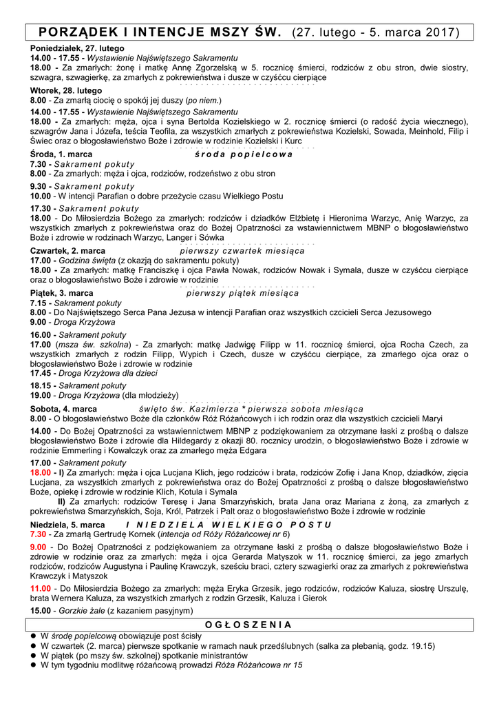 P O R Z ĄD E K I IN TE N C J E M S ZY ŚW . (27. lutego - 5. marca 2017) Poniedziałek, 27. lutego 14.00 - 17.55 - Wystawienie Najświętszego Sakramentu 18.00 - Za zmarłych: żonę i matkę Annę Zgorzelską w 5. rocznicę śmierci, rodziców z obu stron, dwie siostry, szwagra, szwagierkę, za zmarłych z pokrewieństwa i dusze w czyśćcu cierpiące - - - - - - - - - - - - - - - - - - - - - - - - - - Wtorek, 28. lutego 8.00 - Za zmarłą ciocię o spokój jej duszy (po niem.) 14.00 - 17.55 - Wystawienie Najświętszego Sakramentu 18.00 - Za zmarłych: męża, ojca i syna Bertolda Kozielskiego w 2. rocznicę śmierci (o radość życia wiecznego), szwagrów Jana i Józefa, teścia Teofila, za wszystkich zmarłych z pokrewieństwa Kozielski, Sowada, Meinhold, Filip i Świec oraz o błogosławieństwo Boże i zdrowie w rodzinie Kozielski i Kurc - - - - - - - - - - - - - - - - - - - - - - Środa, 1. marca środa popielcowa 7.30 - S ak r am e nt p ok ut y 8.00 - Za zmarłych: męża i ojca, rodziców, rodzeństwo z obu stron - - - - 9.30 - S ak r am e nt p ok ut y 10.00 - W intencji Parafian o dobre przeżycie czasu Wielkiego Postu 17.30 - Sak r a me n t pok u ty 18.00 - Do Miłosierdzia Bożego za zmarłych: rodziców i dziadków Elżbietę i Hieronima Warzyc, Anię Warzyc, za wszystkich zmarłych z pokrewieństwa oraz do Bożej Opatrzności za wstawiennictwem MBNP o błogosławieństwo Boże i zdrowie w rodzinach Warzyc, Langer i Sówka - - - - - - - - - - - - - - - - - - - - - - - - - - - - - - - - - - - - - - - - - - - - - - - - - - - - Czwartek, 2. marca p ie r ws zy c z war tek m ies i ąc a 17.00 - Godzina święta (z okazją do sakramentu pokuty) 18.00 - Za zmarłych: matkę Franciszkę i ojca Pawła Nowak, rodziców Nowak i Symala, dusze w czyśćcu cierpiące oraz o błogosławieństwo Boże i zdrowie w rodzinie Piątek, 3. marca p i er ws zy p ią tek mi es i ąc a 7.15 - Sakrament pokuty 8.00 - Do Najświętszego Serca Pana Jezusa w intencji Parafian oraz wszystkich czcicieli Serca Jezusowego 9.00 - Droga Krzyżowa 16.00 - Sakrament pokuty 17.00 (msza św. szkolna) - Za zmarłych: matkę Jadwigę Filipp w 11. rocznicę śmierci, ojca Rocha Czech, za wszystkich zmarłych z rodzin Filipp, Wypich i Czech, dusze w czyśćcu cierpiące, za zmarłego ojca oraz o błogosławieństwo Boże i zdrowie w rodzinie 17.45 - Droga Krzyżowa dla dzieci 18.15 - Sakrament pokuty 19.00 - Droga Krzyżowa (dla młodzieży) - - - - - - - - - - - - - - - - - - - - - - - - - - Sobota, 4. marca ś w i ęt o ś w. Ka zi m i e r z a * p i er ws za s o b ot a m i es iąc a 8.00 - O błogosławieństwo Boże dla członków Róż Różańcowych i ich rodzin oraz dla wszystkich czcicieli Maryi 14.00 - Do Bożej Opatrzności za wstawiennictwem MBNP z podziękowaniem za otrzymane łaski z prośbą o dalsze błogosławieństwo Boże i zdrowie dla Hildegardy z okazji 80. rocznicy urodzin, o błogosławieństwo Boże i zdrowie w rodzinie Emmerling i Kowalczyk oraz za zmarłego męża Edgara 17.00 - Sakrament pokuty 18.00 - I) Za zmarłych: męża i ojca Lucjana Klich, jego rodziców i brata, rodziców Zofię i Jana Knop, dziadków, zięcia Lucjana, za wszystkich zmarłych z pokrewieństwa oraz do Bożej Opatrzności z prośbą o dalsze błogosławieństwo Boże, opiekę i zdrowie w rodzinie Klich, Kotula i Symala II) Za zmarłych: rodziców Teresę i Jana Smarzyńskich, brata Jana oraz Mariana z żoną, za zmarłych z pokrewieństwa Smarzyńskich, Soja, Król, Patrzek i Palt oraz o błogosławieństwo Boże i zdrowie w rodzinie - - - - - - - - - - - - - - - - - - - - - - - - - - Niedziela, 5. marca I NIEDZIELA WIELKIEGO POSTU 7.30 - Za zmarłą Gertrudę Kornek (intencja od Róży Różańcowej nr 6) 9.00 - Do Bożej Opatrzności z podziękowaniem za otrzymane łaski z prośbą o dalsze błogosławieństwo Boże i zdrowie w rodzinie oraz za zmarłych: męża i ojca Gerarda Matyszok w 11. rocznicę śmierci, za jego zmarłych rodziców, rodziców Augustyna i Paulinę Krawczyk, sześciu braci, cztery szwagierki oraz za zmarłych z pokrewieństwa Krawczyk i Matyszok 11.00 - Do Miłosierdzia Bożego za zmarłych: męża Eryka Grzesik, jego rodziców, rodziców Kaluza, siostrę Urszulę, brata Wernera Kaluza, za wszystkich zmarłych z rodzin Grzesik, Kaluza i Gierok 15.00 - Gorzkie żale (z kazaniem pasyjnym) OGŁOSZENIA W W W W środę popielcową obowiązuje post ścisły czwartek (2. marca) pierwsze spotkanie w ramach nauk przedślubnych (salka za plebanią, godz. 19.15) piątek (po mszy św. szkolnej) spotkanie ministrantów tym tygodniu modlitwę różańcową prowadzi Róża Różańcowa nr 15 Paraf ia Rzymskokatolicka św. Piotra i Pawła w Łubnianach telefon: 77 / 421-50-37 www.parafia-lubniany.org PORZ ĄDEK I INTENCJE MSZY ŚW . (6 - 12. marca 2017) Poniedziałek, 6. marca 18.00 - Za zmarłych: męża Ryszarda Plewa, jego rodziców Hildegardę i Stanisława, Renatę Plewa, dziadków Franciszkę i Michała Matyszok, Agnieszkę i Aleksandra Koziol, wujków Antoniego Matyszok, Wilhelma z żoną, Jerzego, Elfrydę z mężem, za wszystkich zmarłych z pokrewieństwa oraz o błogosławieństwo Boże i zdrowie w rodzinie - - - - - - - - - - - - - - - - - - - - - - - - - - Wtorek, 7. marca 18.00 - Do Bożej Opatrzności i Miłosierdzia Bożego za zmarłych: rodziców Elżbietę i Konrada Świentek, brata Ryszarda, rodziców Marię i Jacka Kinder, ojca Ryszarda Puscz, Annę i Albinę Świentek oraz o błogosławieństwo Boże i zdrowie w rodzinie Kinder i Puscz, - - - - - - - - - - - - - - - - - - - - - - - - - - Środa, 8. marca 8.00 - Do Najświętszego Serca Pana Jezusa za wstawiennictwem MBNP za zmarłych: rodziców Viktorię i Ignatzego, Marię i Johana, brata Paula z żoną, siostrę Edith, szwagierkę Helenę, czterech szwagrów, ciotkę Agnes z mężem, sąsiadkę Paulinę, wszystkich zmarłych z rodzin oraz za żyjących w rodzinach o błogosławieństwo Boże i zdrowie z podziękowaniem za odebrane łaski