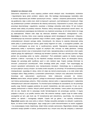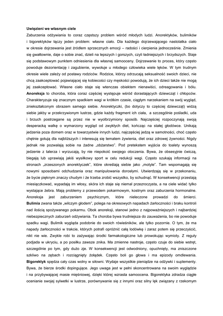 Uwięzieni we własnym ciele Zaburzenia odżywiania to coraz częstszy problem wśród młodych ludzi. Anorektyków, bulimików i bigorektyków łączy jeden problem: własne ciało. Dla każdego dojrzewającego nastolatka ciało w okresie dojrzewania jest źródłem sprzecznych emocji – radości i cierpienia jednocześnie. Zmienia się gwałtownie, daje o sobie znać, dzieli na lepszych i gorszych, czyli ładniejszych i brzydszych. Staje się podstawowym punktem odniesienia dla własnej samooceny. Dojrzewanie to proces, który często powoduje dezorientację i zagubienie, wywołuje u młodego człowieka wiele lęków. W tym trudnym okresie wiele zależy od postawy rodziców. Rodzice, którzy odrzucają seksualność swoich dzieci, nie chcą zaakceptować pojawiającej się kobiecości czy męskości powodują, że ich dzieci także nie mogą jej zaakceptować. Własne ciało staje się wtenczas obiektem nienawiści, odreagowania i bólu. Anoreksja to choroba, która coraz częściej występuje wśród dorastających dziewcząt i chłopców. Charakteryzuje się znacznym spadkiem wagi w krótkim czasie, ciągłym narzekaniem na swój wygląd, zniekształconym obrazem samego siebie. Anorektyczki, (bo dotyczy to częściej dziewcząt) widzą siebie jakby w przekrzywionym lustrze, gdzie każdy fragment ich ciała, a szczególnie pośladki, uda i brzuch postrzegane są przez nie w wyolbrzymiony sposób. Najczęściej rozpoczynają swoją desperacką walkę o wymarzony wygląd od zwykłych diet, kończąc na stałej głodówce. Unikają jedzenia poza domem oraz w towarzystwie innych ludzi, najczęściej jedzą w samotności, choć często chętnie gotują dla najbliższych i interesują się tematem żywienia, diet oraz zdrowej żywności. Nigdy jednak nie pozwalają sobie na żadne „obżarstwo”. Pod pretekstem wyjścia do toalety wynoszą jedzenie z talerza i wyrzucają, by nie niepokoić swojego otoczenia. Bywa, że obsesyjnie ćwiczą, biegają lub uprawiają jakiś wysiłkowy sport w celu redukcji wagi. Często szukają informacji na stronach „zrzeszonych anorektyczek”, które określają siebie jako „motyle”. Tam wspomagają się nowymi sposobami odchudzania oraz manipulowania dorosłymi. Utwierdzają się w przekonaniu, że bycie pięknym znaczy chudym i że trzeba zrobić wszystko, by schudnąć. W konsekwencji przestają miesiączkować, wypadają im włosy, skóra ich staje się niemal przezroczysta, a na ciele widać tylko wystające żebra. Mają problemy z przewodem pokarmowym, kostnym oraz zaburzenia hormonalne. Anoreksja jest zaburzeniem psychicznym, które nieleczone prowadzi do śmierci. Bulimia zwana także „wilczym głodem”, polega na okresowych napadach żarłoczności i braku kontroli nad ilością spożywanego pokarmu. Obok anoreksji, stanowi jedno z najpoważniejszych i najbardziej niebezpiecznych zaburzeń odżywiania. Ta choroba bywa trudniejsza do zauważenia, bo nie powoduje spadku wagi. Bulimik wygląda podobnie do swoich rówieśników, ale tylko pozornie. O tym, że ma napady żarłoczności w trakcie, których potrafi opróżnić całą lodówkę i zaraz potem się przeczyścić, nikt nie wie. Zwykle robi to zażywając środki farmakologiczne lub prowokując wymioty. Z reguły podjada w ukryciu, a po posiłku zawsze znika. Ma zmienne nastroje, często czuje do siebie wstręt, szczególnie po tym, gdy dużo zje. W konsekwencji jest odwodniony, opuchnięty, ma zniszczone szkliwo na zębach i rozciągnięty żołądek. Często boli go głowa i ma epizody omdlewania. Bigorektyk spędza cały czas wolny w siłowni. Wydaje wszystkie pieniądze na odżywki i suplementy. Bywa, że bierze środki dopingujące. Jego uwaga jest w pełni skoncentrowana na swoim wyglądzie i na przybywającej masie mięśniowej, dzięki której wzrasta samoocena. Bigorektyka zdradza ciągłe ocenianie swojej sylwetki w lustrze, porównywanie się z innymi oraz silny lęk związany z rzekomym defektem własnego ciała. Sprawdzanie obwodów - to kolejny przejaw uzależnienia. Chorzy stale mierzą obwód bicepsów, klatki piersiowej i porównują je z wymiarami swoich mistrzów. Rozwojowi bigoreksji niewątpliwie sprzyja wszechobecny kult ciała i moda lansowana w mass mediach. Bigorektyk jest stale niezadowolony ze swego wyglądu. Nie przekonują go zapewnienia bliskich ani kolegów z siłowni, że jego ciało jest doskonałe. Uważa, że może być jeszcze lepiej, ale nie potrafi wyznaczyć granicy, do której chciałby dojść. Podobnie jest z anorektyczką - patrząc w lustro też nie jest zadowolona, wciąż jej się wydaje, jest że za gruba. Rodzicu bądź uważny! Nie udawaj, że nic nie widzisz, kiedy twoje dziecko nagle chudnie i zmienia rozmiary na coraz mniejsze. Gdy znika w trakcie lub od razu po posiłku. Gdy cały wolny czas spędza ćwicząc. Gdy nagle się izoluje, przestaje rozmawiać. Przejrzyj strony internetowe, na które wchodzi. Zapytaj przyjaciół twojego dziecka, czy zauważyli coś niepokojącego. Porozmawiaj z wychowawcą. Bądź uważny, słuchaj własnej intuicji, jeśli podpowiada ci, że coś się dzieje. Rodzicu rozmawiaj ze swoim dzieckiem! Bardzo ważne jest, aby rozmawiać. Nie tylko o tym, co się dzieje, ale rozmawiać w ogóle. Zainteresować się tym, co słychać, zapytać o znajomych, wyjść gdzieś razem. W rozmowie o zauważonym problemie, ważne jest, aby nie oceniać. Nie zaczynać „jesteś za chuda” lub „za dużo czasu spędzasz w siłowni”, tylko spróbować porozmawiać o własnej trosce, niepokoju. Ważne jest, by nastolatek czuł przede wszystkim oparcie i troskę, a nie złość lub rozczarowanie, które wzbudzą w nim tylko postawę obronną. Czasem wystarczy tylko jedno zdanie np. „martwię się o ciebie”, aby sygnał był wystarczająco czytelny i dostrzeżony przez dziecko. Nastolatki potrzebują poczuć, że są dla kogoś ważne, że ktoś je zauważył i zatroszczył się o nie. Wszystkie „reksje” wymag