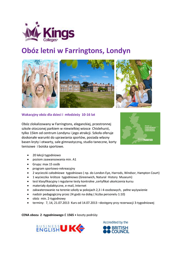 Obóz letni w Farringtons, Londyn Wakacyjny obóz dla dzieci i młodzieży 10-16 lat Obóz zlokalizowany w Farringtons, eleganckiej, przestronnej szkole otoczonej parkiem w niewielkiej wiosce Chislehurst, tylko 15km od centrum Londynu i jego atrakcji. Szkoła oferuje doskonałe warunki do uprawiania sportów, posiada własny basen kryty i otwarty, sale gimnastyczną, studio taneczne, korty tenisowe i boiska sportowe. 20 lekcji tygodniowo poziom zaawansowania min. A1 Grupy: max 15 osób program sportowo-rekreacyjny 2 wycieczki całodniowe tygodniowo ( np. do London Eye, Harrods, Windsor, Hampton Court) 1 wycieczka krótsze tygodniowo (Greenwich, Natural History Museum) test klasyfikacyjny i regularne testy kontrolne ,certyfikat ukończenia kursu materiały dydaktyczne, e-mail, Internet zakwaterowanie na terenie szkoły w pokojach 2,3 i 4-osobowych, pełne wyżywienie nadzór pedagogiczny przez 24 godz na dobę ( liczba personelu 1:10) obóz min. 2-tygodnowy terminy: 7, 14, 21.07.2013 Kurs od 14.07.2013 –dostępny przy rezerwacji 3-tygodniowej CENA obozu 2 -tygodniowego £ 1565 + koszty podróży