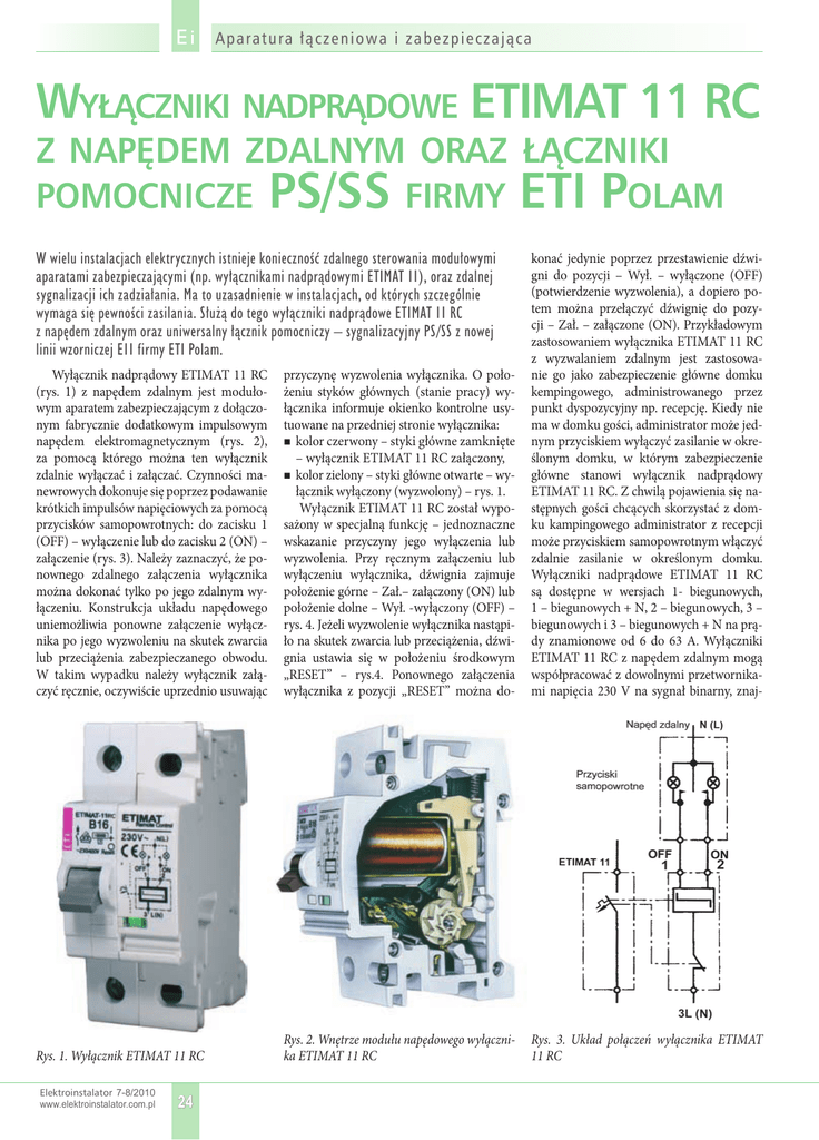 Ei Apar at u r a ł ączen i ow a i za be zpie cza ją ca WYŁĄCZNIKI NADPRĄDOWE ETIMAT 11 RC Z NAPĘDEM ZDALNYM ORAZ ŁĄCZNIKI POMOCNICZE PS/SS FIRMY ETI POLAM W wielu instalacjach elektrycznych istnieje konieczność zdalnego sterowania modułowymi aparatami zabezpieczającymi (np. wyłącznikami nadprądowymi ETIMAT 11), oraz zdalnej sygnalizacji ich zadziałania. Ma to uzasadnienie w instalacjach, od których szczególnie wymaga się pewności zasilania. Służą do tego wyłączniki nadprądowe ETIMAT 11 RC z napędem zdalnym oraz uniwersalny łącznik pomocniczy – sygnalizacyjny PS/SS z nowej linii wzorniczej E11 firmy ETI Polam. Wyłącznik nadprądowy ETIMAT 11 RC (rys. 1) z napędem zdalnym jest modułowym aparatem zabezpieczającym z dołączonym fabrycznie dodatkowym impulsowym napędem elektromagnetycznym (rys. 2), za pomocą którego można ten wyłącznik zdalnie wyłączać i załączać. Czynności manewrowych dokonuje się poprzez podawanie krótkich impulsów napięciowych za pomocą przycisków samopowrotnych: do zacisku 1 (OFF) – wyłączenie lub do zacisku 2 (ON) – załączenie (rys. 3). Należy zaznaczyć, że ponownego zdalnego załączenia wyłącznika można dokonać tylko po jego zdalnym wyłączeniu. Konstrukcja układu napędowego uniemożliwia ponowne załączenie wyłącznika po jego wyzwoleniu na skutek zwarcia lub przeciążenia zabezpieczanego obwodu. W takim wypadku należy wyłącznik załączyć ręcznie, oczywiście uprzednio usuwając przyczynę wyzwolenia wyłącznika. O położeniu styków głównych (stanie pracy) wyłącznika informuje okienko kontrolne usytuowane na przedniej stronie wyłącznika: kolor czerwony – styki główne zamknięte – wyłącznik ETIMAT 11 RC załączony, kolor zielony – styki główne otwarte – wyłącznik wyłączony (wyzwolony) – rys. 1. Wyłącznik ETIMAT 11 RC został wyposażony w specjalną funkcję – jednoznaczne wskazanie przyczyny jego wyłączenia lub wyzwolenia. Przy ręcznym załączeniu lub wyłączeniu wyłącznika, dźwignia zajmuje położenie górne – Zał.– załączony (ON) lub położenie dolne – Wył. -wyłączony (OFF) – rys. 4. Jeżeli wyzwolenie wyłącznika nastąpiło na skutek zwarcia lub przeciążenia, dźwignia ustawia się w położeniu środkowym „RESET” – rys.4. Ponownego załączenia wyłącznika z pozycji „RESET” można do- konać jedynie poprzez przestawienie dźwigni do pozycji – Wył. – wyłączone (OFF) (potwierdzenie wyzwolenia), a dopiero potem można przełączyć dźwignię do pozycji – Zał. – załączone (ON). Przykładowym zastosowaniem wyłącznika ETIMAT 11 RC z wyzwalaniem zdalnym jest zastosowanie go jako zabezpieczenie główne domku kempingowego, administrowanego przez punkt dyspozycyjny np. recepcję. Kiedy nie ma w domku gości, administrator może jednym przyciskiem wyłączyć zasilanie w określonym domku, w którym zabezpieczenie główne stanowi wyłącznik nadprądowy ETIMAT 11 RC. Z chwilą pojawienia się następnych gości chcących skorzystać z domku kampingowego administrator z recepcji może przyciskiem samopowrotnym włączyć zdalnie zasilanie w określonym domku. Wyłączniki nadprądowe ETIMAT 11 RC są dostępne w wersjach 1- biegunowych, 1 – biegunowych + N, 2 – biegunowych, 3 – biegunowych i 3 – biegunowych + N na prądy znamionowe od 6 do 63 A. Wyłączniki ETIMAT 11 RC z napędem zdalnym mogą współpracować z dowolnymi przetwornikami napięcia 230 V na sygnał binarny, znaj- Rys. 1. Wyłącznik ETIMAT 11 RC Rys. 2. Wnętrze modułu napędowego wyłącznika ETIMAT 11 RC Rys. 3. Układ połączeń wyłącznika ETIMAT 11 RC Elektroinstalator 7-8/2010 www.elektroinstalator.com.pl 24 A par at u r a... Ei Tablica 1. Dane techniczne wyłącznika nadprądowego ETIMAT 11 RC Wykonania 1p, 1p+N, 2p, 3p, 3p+N, 6 – 63 A Charakterystyki B, C Napięcie znamionowe 230 V AC Znam. pobór prądu w momencie załączania lub wyłączania 1,5 A Czas trwania impulsu „Zał.” 10 ms Czas trwania impulsu „Wył.” 10 ms Czas załączania <20 ms Trwałość łączeniowa 20 000 cykli łączeniowych Stopień ochrony/w stanie zabudowanym IP20/IP40 Temperatura otoczenia podczas pracy -25ºC do +55ºC Obudowa (kolor) RAL 7035 Pojemność zacisków/moment dokręcania 1,5 mm2 / 0,8 Nm dując zastosowanie w sieci KNX/EIB (inteligentny budynek). Korzyści z zastosowania wyłączników nadprądowych ETIMAT 11 RC to: możliwość wykonywania czynności manewrowych z jednoczesną ochroną obwodu, małe gabaryty zestawu, prosta instalacja, możliwość plombowania dźwigni załączającej, minimalny koszt przewodów łączących, krótki czas wyłączania, niskie straty cieplne. Podstawowe dane techniczne zostały pokazane w tablicy 1. Rys. 4. Możliwe pozycje dźwigni wyłącznika ETIMAT 11 RC Uniwersalny łącznik pomocniczy – sygnalizacyjny PS/SS Uniwersalny łącznik pomocniczy – sygnalizacyjny PS/SS również stanowi element nowej linii wzorniczej aparatury modułowej E11. Jest to aparat modułowy o szerokości 0,5 modułu podstawowego (9 mm), który może zostać zespolony z wyłącznikiem nadprądowym ETIMAT 11, ETIMAT 11 RC lub dowolnym wyłącznikiem różnicowoprądowym EFI lub KZS serii E11 (rys. 5). Aby zespolić łącznik pomocniczy z wyłącznikiem roboczym, należy usunąć (wyłamać) małą blokadę z tworzywa w wyłączniku. Następnie złożyć oba aparaty tak, aby bolec łącznika PS/SS znalazł się w wyłamanym otworze. Sztywne połączenie aparatów realizowane jest za pomocą dwóch specjalnych drucianych klem (rys. 5). Sposób zespolenia łącznika PS/SS z wyłącznikiem nadprądowym ETIMAT 11 pokazano na rys.6. Łącznik pomocniczy PS/SS może być używany w zależności od ustawienia (rys. 6) jako: styk pomocniczy (Aux.) – PS, styk sygnalizacyjny (Sig.) – SS. W przypadku pracy jako styk pomocniczy (Aux.) łącznik sygnalizuje położenie Rys. 5. Łącznik pomocniczy – sygnalizacyjny PS