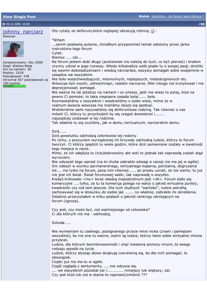 Wątek: skionline - ski forum jaka róŜnica ? View Single Post 29-12-2009, 10:09 johnny_narciarz #58 Oto cytaty ze skiforum,które najlepiej obrazują róŜnicę : Weteran Zarejestrowany: Dec 2008 Skąd: Bielsko-Biała Dni na nartach: 30 Postów: 2018 Podziękował: 438 Otrzymał 367 podziękowań za 190 postów "Witam ...zanim postawię pytanie, chciałbym przypomnieć temat załoŜony przez jarka instruktora tego forum Cytat: Niemoc …… Ŝal…. Na forum jestem dość długo (aczkolwiek nie naleŜę do tych, co byli pierwsi) i brałem czynny udział w jego rozwoju. Wtedy kilkanaście osób pisało tu o swojej pasji, dzieliło się swoimi doświadczeniami i wiedzą narciarska, wszyscy pomagali sobie wzajemnie w zasadzie we wszystkim. Nie było wszechwiedzących, nieomylnych, najlepszych, niedoścignionych etc. Wówczas byli zwykli, uśmiechnięci, radośni narciarze. Nikt nikogo nie krytykował i nie deprecjonował; pomagał. Nie waŜne ile lat jeździsz na nartach i co umiesz, jeśli nie wiesz to pytaj, ktoś na pewno Ci pomoŜe; to taka niepisana zasada była/...... była. Rozmawialiśmy o wszystkim i wiedzieliśmy o sobie wiele, mimo Ŝe w realnym świecie wówczas nie mieliśmy okazji się spotkać. Wielokrotnie sami nazywaliśmy się skiforumowa rodziną. Tak równieŜ o nas mówili Ci, którzy tu przychodzili by się czegoś dowiedzieć i........ najczęściej zostawali w tej rodzinie. Tak właśnie tu się czuliśmy, jak w domu /wirtualnym, narciarskim domu. Dziś...... Dziś powolutku odchodzą członkowie tej rodziny. Po cichu, z poczuciem wyrządzonej im krzywdy odchodzą ludzie, którzy to forum tworzyli. Ci którzy spędzili tu wiele godzin, które dziś zamienione zostały w świetność tego miejsca w necie. Mimo, Ŝe ich odejścia to (nie)dobrowolny akt woli to jednak tak naprawdę zostali stąd wyrzuceni. Nie usłyszeli tego wprost (na to chyba zabrakło odwagi a raczej nie ma jej w ogóle) Oni odeszli w wyniku permanentnego, wirtualnego kopania, poniŜania, dogryzania itd….. nie tylko na forum, poza nim równieŜ...... po prostu uznali, Ŝe nie warto; to juŜ nie jest ich świat. Świat forumowej walki, tak naprawdę o wszytko. Kiedyś królowało >my< teraz władcą niepodzielnym jest >JA<. Forum stało się komercyjne .... tylko, Ŝe tu ta komercja polega na walce o jakieś wirtualne punkty, kwadraciki czy coś tam jeszcze. Dla tych złudnych ”wartości”, ludzie potrafią zachowywać się w stosunku do siebie jak ....... no właśnie, zabrakło mi określenia. Ostatnio przeczytałem w kilku postach o jakimś rankingu istniejącym na forum (zgroza). Czy jest, czy moŜe być, coś waŜniejszego od człowieka? Ci dla których nie ma - odchodzą. Szkoda .... Nie wymieniam tu Ŝadnego, poŜegnanego przeze mnie nicka (znam i pamiętam wszystkie), bo nie one tu waŜne, waŜni są ludzie, którzy takie sobie wirtualne imiona przybrali. Ludzie, dla których bezinteresowność i chęć niesienia pomocy innym, to swego rodzaju sposób na Ŝycie. Ludzie, którzy słysząc słowo dziękuję czerwienią się, bo dla nich pomagać, to obowiązek. Części juŜ nie ma tu w ogóle. Część zagląda z sentymentu, .....nie odzywa się. .... we wszystkich pozostał Ŝal /............. mniejszy lub większy; Ŝal. Czy jest ktoś lub coś w stanie to naprawić/zmienić ??? Pewnie spróbować by było moŜna, tylko ....... tylko czy oni mają jeszcze gdzie wracać? Dlaczego to piszę? Od kilku dni wiedziałem, Ŝe kolejni forowicze mają zamiar odejść. Codziennie sprawdzałem te konta i codziennie z radością stwierdzałem, Ŝe nadal są aktywne. Od niedawna ................. >konto usunięte<. Coraz więcej takich kont na tym forum .... coraz więcej skrzywdzonych ludzi. Wszystkim, którzy skiforumową rodziną się zwali, Ŝyczę wszelkiego dobra i radości, niech światełko z dalekiego Betlejem rozjaśnia mrok codzienności. Dobro jeszcze nigdy nie przegrało.... Do widzenia ....... Przyjaciele. jarek __________________ ...sumienia nie da się wyprać, moŜna go tylko nie ubrudzić... ...i teraz mój temat z pytaniem do Administratora tego forum: Miał Pan tu grono ludzi kochających narty, miłych i kompetentnych, no moŜe oprócz mnie, ja jestem tylko miły, ci ludzie stąd odeszli, przestali bywać i pisać... Odeszli, bo odrywając się od wyziewów codziennych, postaw brutalnych i chamskich, bywali na tym forum, by w sposób moŜe nadmiernie egzaltowany dawać wyraz swoim emocjom, by moŜe i nieraz w nadmiernie infantylnym patosie/to ja/ zapomnieć o chamach, hipokrytach, o tych Ŝądnych zysku i o tych chcących sławy, o tych co za nic mają innych ...o tych popaprańcach, których na co dzień tak wielu spotykamy dookoła... odeszli, bo nie godzą się na chamskie zachowania grupki zaledwie kilku chamów, grupki, której wydaje się, Ŝe zawładnęła tym forum, Ŝe moŜe bezkarnie lŜyć i obraŜać kaŜdego, kto nie jest z nimi, kto nie chce z nimi jeździć na ich wspólne wyjazdy, kaŜdego, kto ma swoje odmienne zdanie… A aktywna dwójka z tych kilku, po usunięciu z innego forum za naruszanie jego zasad, zagnieździła się u Pana, czy to panu nie przeszkadza? i jakie podejmie Pan środki wobec osób, które na tym forum mnie obraziły w postach, które raportowałem, które naruszyły i zasady tego forum i przepisy prawa? Ufając, Ŝe dobro tego forum jest dla Pana najwaŜniejsze oczekuję stosownych kroków. Pozdrawiam- Adam" " Question dlaczego i czy admini grzebią ludzią w profilach ? odpisałem dzisiaj koledze Mitsu posta na jego stwierdzenie: "Uzupełniłem dane o sobie chyba po raz 6. Szlag mnie trafi jak znowu zostaną skasowane." odpisałem mu aby "uŜył mocy" w uzupełnianiu swego profilu (w nawiązaniu do jego avatara yody ze star wars) oraz skopał tyłki tym którzy jego rzekome zapiski zmieniają - z ironią dodając znak "" ( ironia to nawiązanie do tego co nasz yoda-Mitsu ma napisane na avatarze - kick your ass i can) Oczywiście kaŜdy j