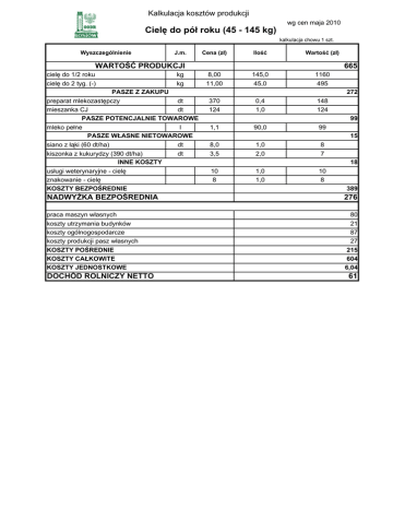 Kalkulacja kosztów produkcji wg cen maja 2010 Cielę do pół roku (45 - 145 kg) kalkulacja chowu 1 szt. Wyszczególnienie J.m. Cena (zł) Ilość Wartość (zł) 8,00 11,00 145,0 45,0 1160 495 WARTOŚĆ PRODUKCJI cielę do 1/2 roku cielę do 2 tyg. (-) kg kg PASZE Z ZAKUPU preparat mlekozastępczy dt mieszanka CJ dt PASZE POTENCJALNIE TOWAROWE mleko pełne l PASZE WŁASNE NIETOWAROWE siano z łąki (60 dt/ha) dt kiszonka z kukurydzy (390 dt/ha) dt INNE KOSZTY usługi weterynaryjne - cielę znakowanie - cielę KOSZTY BEZPOŚREDNIE 665 272 370 124 0,4 1,0 148 124 99 1,1 90,0 99 8,0 3,5 1,0 2,0 8 7 15 18 10 8 1,0 1,0 10 8 389 NADWYŻKA BEZPOŚREDNIA 276 praca maszyn własnych koszty utrzymania budynków koszty ogólnogospodarcze koszty produkcji pasz własnych KOSZTY POŚREDNIE KOSZTY CAŁKOWITE KOSZTY JEDNOSTKOWE 80 21 87 27 215 604 6,04 DOCHÓD ROLNICZY NETTO 61