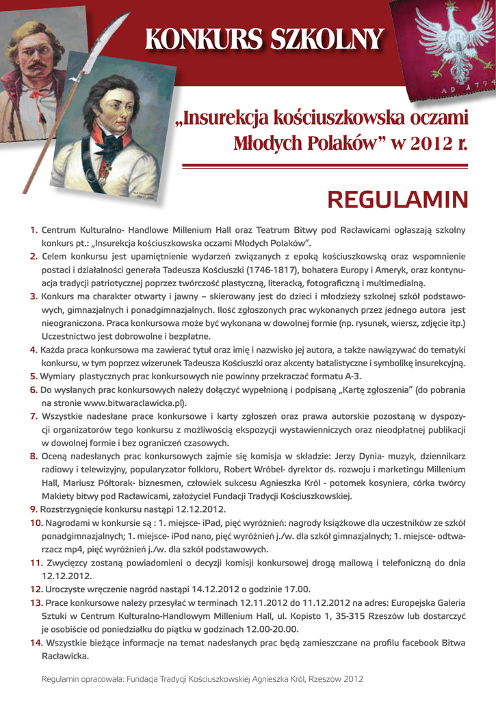 KONKURS SZKOLNY „Insurekcja kosciuszkowska oczami Młodych Polaków” w 2012 r. REGULAMIN 1. Centrum Kulturalno- Handlowe Millenium Hall oraz Teatrum Bitwy pod Racławicami ogłaszają szkolny konkurs pt.: „Insurekcja kościuszkowska oczami Młodych Polaków”. 2. Celem konkursu jest upamiętnienie wydarzeń związanych z epoką kościuszkowską oraz wspomnienie postaci i działalności generała Tadeusza Kościuszki (1746-1817), bohatera Europy i Ameryk, oraz kontynuacja tradycji patriotycznej poprzez twórczość plastyczną, literacką, fotograficzną i multimedialną. 3. Konkurs ma charakter otwarty i jawny – skierowany jest do dzieci i młodzieży szkolnej szkół podstawowych, gimnazjalnych i ponadgimnazjalnych. Ilość zgłoszonych prac wykonanych przez jednego autora jest nieograniczona. Praca konkursowa może być wykonana w dowolnej formie (np. rysunek, wiersz, zdjęcie itp.) Uczestnictwo jest dobrowolne i bezpłatne. 4. Każda praca konkursowa ma zawierać tytuł oraz imię i nazwisko jej autora, a także nawiązywać do tematyki konkursu, w tym poprzez wizerunek Tadeusza Kościuszki oraz akcenty batalistyczne i symbolikę insurekcyjną. 5. Wymiary plastycznych prac konkursowych nie powinny przekraczać formatu A-3. 6. Do wysłanych prac konkursowych należy dołączyć wypełnioną i podpisaną „Kartę zgłoszenia” (do pobrania na stronie www.bitwaraclawicka.pl). 7. Wszystkie nadesłane prace konkursowe i karty zgłoszeń oraz prawa autorskie pozostaną w dyspozycji organizatorów tego konkursu z możliwością ekspozycji wystawienniczych oraz nieodpłatnej publikacji w dowolnej formie i bez ograniczeń czasowych. 8. Oceną nadesłanych prac konkursowych zajmie się komisja w składzie: Jerzy Dynia- muzyk, dziennikarz radiowy i telewizyjny, popularyzator folkloru, Robert Wróbel- dyrektor ds. rozwoju i marketingu Millenium Hall, Mariusz Półtorak- biznesmen, człowiek sukcesu Agnieszka Król - potomek kosyniera, córka twórcy Makiety bitwy pod Racławicami, założyciel Fundacji Tradycji Kościuszkowskiej. 9. Rozstrzygnięcie konkursu nastąpi 12.12.2012. 10. Nagrodami w konkursie są : 1. miejsce- iPad, pięć wyróżnień: nagrody książkowe dla uczestników ze szkół ponadgimnazjalnych; 1. miejsce- iPod nano, pięć wyróżnień j./w. dla szkół gimnazjalnych; 1. miejsce- odtwarzacz mp4, pięć wyróżnień j./w. dla szkół podstawowych. 11. Zwycięzcy zostaną powiadomieni o decyzji komisji konkursowej drogą mailową i telefoniczną do dnia 12.12.2012. 12. Uroczyste wręczenie nagród nastąpi 14.12.2012 o godzinie 17.00. 13. Prace konkursowe należy przesyłać w terminach 12.11.2012 do 11.12.2012 na adres: Europejska Galeria Sztuki w Centrum Kulturalno-Handlowym Millenium Hall, ul. Kopisto 1, 35-315 Rzeszów lub dostarczyć je osobiście od poniedziałku do piątku w godzinach 12.00-20.00. 14. Wszystkie bieżące informacje na temat nadesłanych prac będą zamieszczane na profilu facebook Bitwa Racławicka. Regulamin opracowała: Fundacja Tradycji Kościuszkowskiej Agnieszka Król, Rzeszów 2012