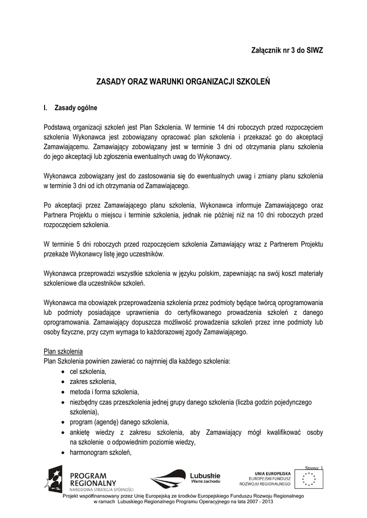 Załącznik nr 3 do SIWZ ZASADY ORAZ WARUNKI ORGANIZACJI SZKOLEŃ I. Zasady ogólne Podstawą organizacji szkoleń jest Plan Szkolenia. W terminie 14 dni roboczych przed rozpoczęciem szkolenia Wykonawca jest zobowiązany opracować plan szkolenia i przekazać go do akceptacji Zamawiającemu. Zamawiający zobowiązany jest w terminie 3 dni od otrzymania planu szkolenia do jego akceptacji lub zgłoszenia ewentualnych uwag do Wykonawcy. Wykonawca zobowiązany jest do zastosowania się do ewentualnych uwag i zmiany planu szkolenia w terminie 3 dni od ich otrzymania od Zamawiającego. Po akceptacji przez Zamawiającego planu szkolenia, Wykonawca informuje Zamawiającego oraz Partnera Projektu o miejscu i terminie szkolenia, jednak nie później niż na 10 dni roboczych przed rozpoczęciem szkolenia. W terminie 5 dni roboczych przed rozpoczęciem szkolenia Zamawiający wraz z Partnerem Projektu przekaże Wykonawcy listę jego uczestników. Wykonawca przeprowadzi wszystkie szkolenia w języku polskim, zapewniając na swój koszt materiały szkoleniowe dla uczestników szkoleń. Wykonawca ma obowiązek przeprowadzenia szkolenia przez podmioty będące twórcą oprogramowania lub podmioty posiadające uprawnienia do certyfikowanego prowadzenia szkoleń z danego oprogramowania. Zamawiający dopuszcza możliwość prowadzenia szkoleń przez inne podmioty lub osoby fizyczne, przy czym wymaga to każdorazowej zgody Zamawiającego. Plan szkolenia Plan Szkolenia powinien zawierać co najmniej dla każdego szkolenia: cel szkolenia, zakres szkolenia, metoda i forma szkolenia, niezbędny czas przeszkolenia jednej grupy danego szkolenia (liczba godzin pojedynczego szkolenia), program (agendę) danego szkolenia, ankietę wiedzy z zakresu szkolenia, aby Zamawiający mógł kwalifikować osoby na szkolenie o odpowiednim poziomie wiedzy, harmonogram szkoleń, Strona: 1 Projekt współfinansowany przez Unię Europejską ze środków Europejskiego Funduszu Rozwoju Regionalnego w ramach Lubuskiego Regionalnego Programu Operacyjnego na lata 2007 – 2013 kwalifikacje trenerów. Program szkolenia powinien określać podział na bloki tematyczne (sesje), poruszane w ramach bloku zagadnienia oraz ramy czasowe poszczególnych prezentacji. Program szkolenia powinien zawierać kompletne informacje na temat wszystkich wydarzeń związanych ze szkoleniem. Zajęcia muszą być realizowane w pomieszczeniach zapewniających odpowiednie warunki higieny oraz wyposażonych zarówno w proste, jak i techniczne środki dydaktyczne określone w punkcie III. Zajęcia praktyczne muszą być realizować w grupach liczących nie więcej niż 10 słuchaczy. W szczególnych przypadkach Zamawiający ma prawo zwiększyć liczbę uczestników szkolenia do 11 słuchaczy. Zajęcia praktyczne mają odbywać się w pracowniach komputerowych, które umożliwiają ich sprawną i bezpieczną realizację. Podstawową formą szkolenia jest lekcja, której odpowiada jedna godzina dydaktyczna trwająca 45 minut. Dopuszcza się łączenie dwóch jednostek lekcyjnych. Na dwie jednostki lekcyjne przypada jedna przerwa w wymiarze 15 minut. Po czterech jednostkach lekcyjnych uczestnikom szkolenia przypada przerwa na posiłek trwająca 30 minut. Wykonawca zobowiązany jest do zabezpieczenia podczas przerw napojów: ciepłych: kawa podawana w samowarze 300 ml/os., herbata podawana w samowarze 300 ml/os., cukier - 10g/os., mleko 3,2 % podawane w dzbankach - 50ml/os., cytryna pokrojona (podawana na talerzykach) - 1 plaster/os., zimnych: woda gazowana i niegazowana, w butelkach - 0,5 l/os. 2 rodzaje soków owocowych 100% (jabłkowy oraz pomarańczowy), podawane w dzbankach szklanych lub specjalnych dystrybutorach (wyłączając nektar lub napój) – 200 ml/os., W przypadku szkolenia trwającego dłużej niż 6 godzin dydaktycznych Wykonawca zapewni uczestnikom posiłek w postaci kanapek (3 rodzaje pieczywa, 3 rodzaje wędlin, 3 rodzaje serów, 2 rodzaje past, dodatki typu warzywa, majonez – min. 5 szt. kanapek dla 1 osoby). Szkolenia należy planować racjonalnie, tak aby liczba delegacji była jak najmniejsza, aby uczestnictwo w szkoleniach nie powodowało utrudnień przy realizacji bieżących obowiązków w pracy oraz w liczbie nieprzekraczającej 8 godzin dydaktycznych dziennie. II. Miejsca przeprowadzania szkoleń Strona: 2 Projekt współfinansowany przez Unię Europejską ze środków Europejskiego Funduszu Rozwoju Regionalnego w ramach Lubuskiego Regionalnego Programu Operacyjnego na lata 2007 – 2013 Szkolenia Użytkowników końcowych Zamawiającego oraz Partnera Projektu w zakresie dostarczanego oprogramowania oraz szkolenia specjalistyczne z zakresu administrowania i konfigurowania elementów przedmiotu zamówienia mają być przeprowadzane w ośrodku zlokalizowanym na terenie miasta Nowa Sól. Wykonawca w cenie wynagrodzenia pokrywa wszystkie koszty związane z organizacją i przeprowadzeniem szkoleń na warunkach opisanych w Specyfikacji Istotnych Warunków Zamówienia. Zamawiający oraz Partner Projektu pokrywają koszty oddelegowania swoich pracowników na czas szkoleń oraz koszty dojazdu do miejsc ich przeprowadzenia. Miejsca przeprowadzenia szkoleń muszą być zlokalizowane w centrum miasta umożliwiając tym samym dotarcie uczestnikom szkolenia pieszo w ciągu 15 minut z centralnych węzłów komunikacji publicznej (PKP, PKS) lub w przypadku dalszego oddalenia od centrum Wykonawca zapewni bezpłatny transport z ustalonego miejsca zbiórki w okolicy centralnych węzłów komunikacji. Wykonawca jest zobowiązany zabezpieczyć uczestnikom szkolenia darmowy parking dla 5 pojazdów w bezpośredniej bliskości lokalizacji miejsc przeprowadzenia szkoleń. III. Minimalne wyposażenie pracowni komputerowej 1. 11 stanowisk komputerowych dla uczestników szkolenia wyposażonych w komputery z pełnym oprogramowaniem umożliwiających efektywne użytkowanie Oprogramowania aplikacyjnego, z którego przeprowadzane jest szkolenie (w tym 1 rezerwowe). 