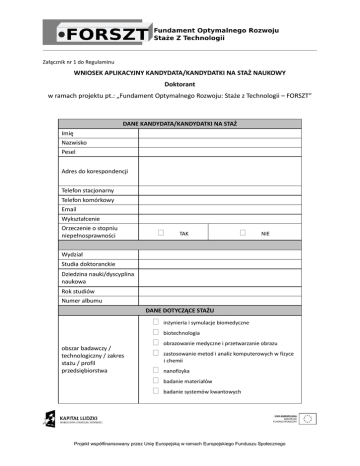 Załącznik nr 1 do Regulaminu WNIOSEK APLIKACYJNY KANDYDATA/KANDYDATKI NA STAŻ NAUKOWY Doktorant w ramach projektu pt.: „Fundament Optymalnego Rozwoju: Staże z Technologii – FORSZT” DANE KANDYDATA/KANDYDATKI NA STAŻ Imię Nazwisko Pesel Adres do korespondencji Telefon stacjonarny Telefon komórkowy Email Wykształcenie Orzeczenie o stopniu niepełnosprawności TAK NIE Wydział Studia doktoranckie Dziedzina nauki/dyscyplina naukowa Rok studiów Numer albumu DANE DOTYCZĄCE STAŻU obszar badawczy / technologiczny / zakres stażu / profil przedsiębiorstwa inżynieria i symulacje biomedyczne biotechnologia obrazowanie medyczne i przetwarzanie obrazu zastosowanie metod i analiz komputerowych w fizyce i chemii nanofizyka badanie materiałów badanie systemów kwantowych Projekt współfinansowany przez Unię Europejską w ramach Europejskiego Funduszu Społecznego Potencjalny termin stażu 1. Proponowany temat badawczy ……………………………………………...……………..……………….……………… 2. Uzasadnienie przez kandydatkę/kandydata wyboru danego tematu badawczego i chęci odbycia stażu – list motywacyjny. ……………………………………………………………………………………………………………………………………………………… ……………………………………………………………………………………………………………………………………………………… 3. PROPONOWANY PROGRAM STAŻU 1. ………………………………………………………………………………………………………………………………………………… 2. ………………………………………………………………………………………………………………………………………………… 3. ………………………………………………………………………………………………………………………………………………… 4. ………………………………………………………………………………………………………………………………………………… 4. Opinia opiekuna naukowego doktorantki/doktoranta dotycząca działalności naukowej doktorantki/doktoranta oraz wyników naukowych, oceniająca poziom naukowy doktorantki/doktoranta i jego przygotowanie do realizowania wskazanego zakresu badawczego w ramach stażu: ……………………………………….……………………………………………………………………………………………………………. ……………………………………………………………………………………………………………………………………………………… …………………………………………………………..………………………………………………………………………………………… …………………………………………………………….………………………………………………………………………………………. ………………………………….…………………………………………………………………………………………………………………. ………………………………………………. Podpis opiekuna naukowego doktoranta/tki Projekt współfinansowany przez Unię Europejską w ramach Europejskiego Funduszu Społecznego 5. Uzasadnienie wyboru zakresu stażu / profilu przedsiębiorstwa w odniesieniu do proponowanego tematu badawczego i programu stażu …………………………………………………………..………………………………………………………………………………………… …………………………………………………………….………………………………………………………………………………………. ………………………………….…………………………………………………………………………………………………………………. Oświadczenia: W związku z moim zgłoszeniem do Projektu pt.: „Fundament Optymalnego Rozwoju: Staże z Technologii – FORSZT”, realizowanego w ramach Programu Operacyjnego Kapitał Ludzki wyrażam zgodę na przetwarzanie moich danych osobowych. Oświadczam, że przyjmuję do wiadomości, iż: Administratorem moich danych osobowych jest Minister Infrastruktury i Rozwoju pełniący funkcję Instytucji Zarządzającej dla Programu Operacyjnego Kapitał Ludzki, mający siedzibę przy ul. Wspólnej 2/4, 00-926 Warszawa; moje dane osobowe będą przetwarzane wyłącznie w celu udzielenia wsparcia i obsługi Projektu; moje dane osobowe mogą zostać udostępnione innym podmiotom w celu ewaluacji, jak również w celu realizacji zadań związanych z monitoringiem i sprawozdawczością w ramach Programu Operacyjnego Kapitał Ludzki; podanie danych jest dobrowolne, aczkolwiek odmowa ich podania jest równoznaczna z brakiem możliwości udzielania wsparcia w ramach Projektu; mam prawo dostępu do treści swoich danych i ich poprawienia. Akceptuję postanowienia Regulaminu organizacji staży naukowych w ramach Projektu pt.: „Fundament Optymalnego Rozwoju: Staże z Technologii – FORSZT” i przyjmuję do wiadomości. ………………………………………………. Podpis kandydata/kandydatki na staż Projekt współfinansowany przez Unię Europejską w ramach Europejskiego Funduszu Społecznego KARTA OCENY WNIOSKU APLIKACYJNEGO PKT. WNIOSKU 1 2 3 4 PRZYZNANA OCENA (maksymalnie 20 punktów za każdy punkt wniosku) SUMA PUNKTÓW (maksymalnie do uzyskania 100 pkt.) Podpis Koordynatora Projektu Podpisy Członków Rady Programowej Projektu Projekt współfinansowany przez Unię Europejską w ramach Europejskiego Funduszu Społecznego 5