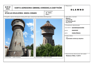 GEZ (WEZ) 3. Miejscowość KARTA ADRESOWA GMINNEJ EWIDENCJI ZABYTKÓW 1. Nazwa SŁAWNO 2. Czas powstania STACJA KOLEJOWA: WIEŻA CIŚNIEŃ ok. 1910 r. (mur.) 8. Fotografia z opisem wskazującym orientację albo mapa z zaznaczonym stanowiskiem archeologicznym 4. Adres (ulica, nr posesji) Sławno p-ta 76-100 ul. Dworcowa 6/1 Nr dz. 21/15 5. Przynależność administracyjna województwo zachodniopomorskie powiat sławieński gmina miasto Sławno 6. Formy ochrony inne wojewódzka ewidencja zabytków 7. Opracowanie karty adresowej (autor, data i podpis) Waldemar Witek, 12.2015 Wieża ciśnień – widok od zachodu Wieża ciśnień – widok od wschodu 9. Fotografie, ikonografia 10. Mapy, plany Kolejowa wieża wodna trzykondygnacyjna, o podstawie w formie ściętego stożka z cylindrycznym rezerwuarem wody, nakryta hełmem stożkowym. Budynek trzykondygnacyjny, murowany, tynkowany, o pierwotnym (industrialnym) wystroju ścian, akcentowanym przez szczelinowe otwory okienne. I Plan miasta Sławno (Schlawe) - 1939 Mapa topograficzna Sławna