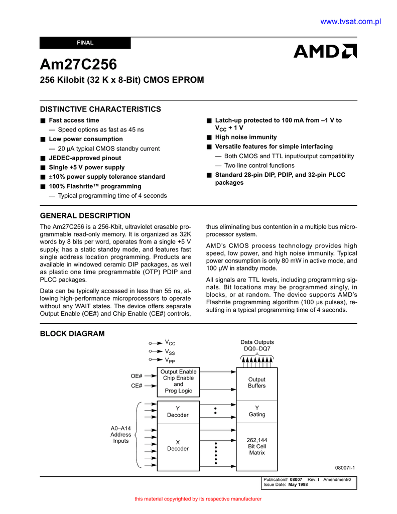 www.tvsat.com.pl FINAL Am27C256 256 Kilobit (32 K x 8-Bit) CMOS EPROM DISTINCTIVE CHARACTERISTICS ■ Fast access time ■ Latch-up protected to 100 mA from –1 V to VCC + 1 V — Speed options as fast as 45 ns ■ High noise immunity ■ Low power consumption ■ Versatile features for simple interfacing — 20 µA typical CMOS standby current ■ JEDEC-approved pinout — Both CMOS and TTL input/output compatibility ■ Single +5 V power supply — Two line control functions ■ Standard 28-pin DIP, PDIP, and 32-pin PLCC packages ■ ±10% power supply tolerance standard ■ 100% Flashrite™ programming — Typical programming time of 4 seconds GENERAL DESCRIPTION The Am27C256 is a 256-Kbit, ultraviolet erasable programmable read-only memory. It is organized as 32K words by 8 bits per word, operates from a single +5 V supply, has a static standby mode, and features fast single address location programming. Products are available in windowed ceramic DIP packages, as well as plastic one time programmable (OTP) PDIP and PLCC packages. Data can be typically accessed in less than 55 ns, allowing high-performance microprocessors to operate without any WAIT states. The device offers separate Output Enable (OE#) and Chip Enable (CE#) controls, thus eliminating bus contention in a multiple bus microprocessor system. AMD’s CMOS process technology provides high speed, low power, and high noise immunity. Typical power consumption is only 80 mW in active mode, and 100 µW in standby mode. All signals are TTL levels, including programming signals. Bit locations may be programmed singly, in blocks, or at random. The device supports AMD’s Flashrite programming algorithm (100 µs pulses), resulting in a typical programming time of 4 seconds. BLOCK DIAGRAM VCC VSS Data Outputs DQ0–DQ7 VPP OE# CE# A0–A14 Address Inputs Output Enable Chip Enable and Prog Logic Output Buffers Y Decoder Y Gating X Decoder 262,144 Bit Cell Matrix 08007I-1 Publication# 08007 Rev: I Issue Date: May 1998 this material copyrighted by its respective manufacturer Amendment/0 www.tvsat.com.pl PRODUCT SELECTOR GUIDE Family Part Number Am27C256 VCC = 5.0 V ± 5% Speed Options -255 VCC = 5.0 V ± 10% -45 -55 -70 -90 -120 -150 -200 Max Access Time (ns) 45 55 70 90 120 150 200 250 CE# (E#) Access (ns) 45 55 70 90 120 150 200 250 OE# (G#) Access (ns) 30 35 40 40 50 50 50 50 CONNECTION DIAGRAMS Top View A14 A13 VCC PLCC 28 VCC A12 2 27 A14 4 3 2 1 32 31 30 A7 3 26 A13 A6 5 29 A8 6 28 A9 27 26 A11 NC A6 4 25 A8 A5 A5 5 24 A9 A4 7 8 DU 1 VPP VPP A7 A12 DIP A4 6 23 A11 A3 A3 7 22 OE# (G#) A2 9 25 OE# (G#) A2 8 21 A10 A1 10 24 A10 A0 11 23 CE# (E#) NC 12 22 DQ0 13 21 DQ7 DQ6 A1 9 20 CE# (E#) A0 10 19 DQ7 DQ0 11 18 DQ6 DQ1 12 17 DQ5 DQ2 13 16 DQ4 VSS 14 15 DQ3 DQ5 DQ4 DQ3 VSS DU DQ1 DQ2 14 15 16 17 18 19 20 08007I-3 08007I-2 Notes: 1. JEDEC nomenclature is in parenthesis. 2. Don’t use (DU) for PLCC. PIN DESIGNATIONS LOGIC SYMBOL A0–A14 = Address Inputs CE# (E#) = Chip Enable Input DQ0–DQ7 = Data Input/Outputs OE# (G#) = Output Enable Input VCC = VCC Supply Voltage VPP = Program Voltage Input VSS = Ground NC = No Internal Connection 15 8 A0–A14 DQ0–DQ7 CE# (E#) OE# (G#) 08007I-4 2 Am27C256 this material copyrighted by its respective manufacturer www.tvsat.com.pl ORDERING INFORMATION UV EPROM Products AMD standard products are available in several packages and operating ranges. The order number (Valid Combination) is formed by a combination of the following: AM27C256 -45 D C B OPTIONAL PROCESSING Blank = Standard Processing B = Burn-In TEMPERATURE RANGE C = Commercial (0°C to +70°C) I = Industrial (–40°C to +85°C) E = Extended (–55°C to +125°C) PACKAGE TYPE D = 28-Pin Ceramic DIP (CDV028) SPEED OPTION See Product Selector Guide and Valid Combinations DEVICE NUMBER/DESCRIPTION Am27C256 256 Kilobit (32 K x 8-Bit) CMOS UV EPROM Valid Combinations Valid Combinations Valid Combinations list configurations planned to be supported in volume for this device. Consult the local AMD sales office to confirm availability of specific valid combinations and to check on newly released combinations. AM27C256-45 DC, DCB, DI, DIB AM27C256-55 AM27C256-70 AM27C256-90 AM27C256-120 DC, DCB, DI, DIB, DE, DEB AM27C256-150 AM27C256-200 AM27C256-255 VCC = 5.0 V ± 5% DC, DCB, DI, DIB Am27C256 this material copyrighted by its respective manufacturer 3 www.tvsat.com.pl ORDERING INFORMATION OTP EPROM Products AMD standard products are available in several packages and operating ranges. The order number (Valid Combination) is formed by a combination of the following: AM27C256 -55 P C OPTIONAL PROCESSING Blank = Standard Processing TEMPERATURE RANGE C = Commercial (0°C to +70°C) I = Industrial (–40°C to +85°C) PACKAGE TYPE P = 28-Pin Plastic DIP (PD 028) J = 32-Pin Square Plastic Leaded Chip Carrier (PL 032) SPEED OPTION See Product Selector Guide and Valid Combinations DEVICE NUMBER/DESCRIPTION Am27C256 256 Kilobit (32 K x 8-Bit) CMOS OTP EPROM Valid Combinations Valid Combinations AM27C256-55 JC, PC AM27C256-70 Valid Combinations list configurations planned to be supported in volume for this device. Consult the local AMD sales office to confirm availability of specific valid combinations and to check on newly released combinations. AM27C256-90 AM27C256-120 JC, PC, JI, PI AM27C256-150 AM27C256-200 AM27C256-255 4 Am27C256 this material copyrighted by its respective manufacturer www.tvsat.com.pl FUNCTIONAL DESCRIPTION Device Erasure In order to clear all locations of their programmed contents, the device must be exposed to an ultraviolet light source. A dosage of 15 W seconds/cm2 is required to completely erase the device. This dosage can be obtained by exposure to an ultraviolet lamp—wavelength of 2537 Å—with intensity of 12,000 µW/cm2 for 15 to 20 minutes. The device should be directly under and about one inch from the source, and all filters should be removed from the UV light source prior to erasure. Note that all UV erasable device