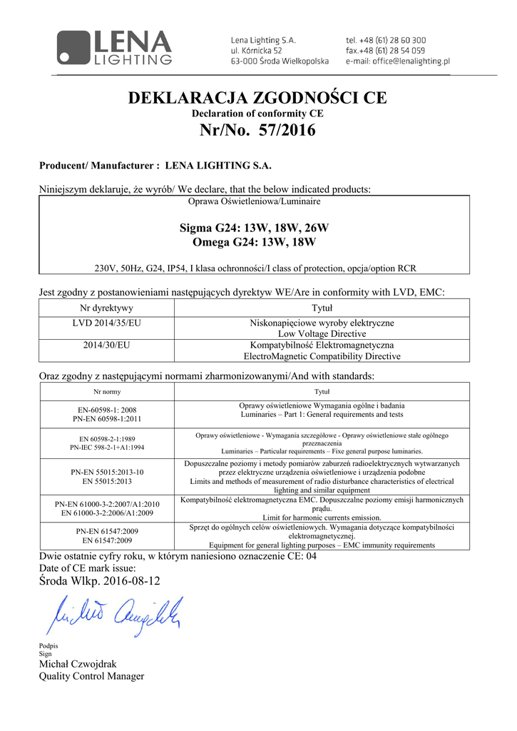 DEKLARACJA ZGODNOŚCI CE Declaration of conformity CE Nr/No. 57/2016 Producent/ Manufacturer : LENA LIGHTING S.A. Niniejszym deklaruje, że wyrób/ We declare, that the below indicated products: Oprawa Oświetleniowa/Luminaire Sigma G24: 13W, 18W, 26W Omega G24: 13W, 18W 230V, 50Hz, G24, IP54, I klasa ochronności/I class of protection, opcja/option RCR Jest zgodny z postanowieniami następujących dyrektyw WE/Are in conformity with LVD, EMC: Nr dyrektywy Tytuł LVD 2014/35/EU Niskonapięciowe wyroby elektryczne Low Voltage Directive Kompatybilność Elektromagnetyczna ElectroMagnetic Compatibility Directive 2014/30/EU Oraz zgodny z następującymi normami zharmonizowanymi/And with standards: Nr normy EN-60598-1: 2008 PN-EN 60598-1:2011 EN 60598-2-1:1989 PN-IEC 598-2-1+A1:1994 PN-EN 55015:2013-10 EN 55015:2013 PN-EN 61000-3-2:2007/A1:2010 EN 61000-3-2:2006/A1:2009 PN-EN 61547:2009 EN 61547:2009 Tytuł Oprawy oświetleniowe Wymagania ogólne i badania Luminaries – Part 1: General requirements and tests Oprawy oświetleniowe - Wymagania szczegółowe - Oprawy oświetleniowe stałe ogólnego przeznaczenia Luminaries – Particular requirements – Fixe general purpose luminaries. Dopuszczalne poziomy i metody pomiarów zaburzeń radioelektrycznych wytwarzanych przez elektryczne urządzenia oświetleniowe i urządzenia podobne Limits and methods of measurement of radio disturbance characteristics of electrical lighting and similar equipment Kompatybilność elektromagnetyczna EMC. Dopuszczalne poziomy emisji harmonicznych prądu. Limit for harmonic currents emission. Sprzęt do ogólnych celów oświetleniowych. Wymagania dotyczące kompatybilności elektromagnetycznej. Equipment for general lighting purposes – EMC immunity requirements Dwie ostatnie cyfry roku, w którym naniesiono oznaczenie CE: 04 Date of CE mark issue: Środa Wlkp. 2016-08-12 Podpis Sign Michał Czwojdrak Quality Control Manager DEKLARACJA ZGODNOŚCI CE Declaration of conformity CE Nr/No. 58/2016 Producent/ Manufacturer : LENA LIGHTING S.A. Niniejszym deklaruje, że wyrób/ We declare, that the below indicated products: Oprawa Oświetleniowa/Luminaire Omega 60, Sigma 60: max 60W Omega 100, Sigma 100: max 100W 230V, 50Hz, E27, IP54, I klasa ochronności/I class of protection Jest zgodny z postanowieniami następujących dyrektyw WE/Are in conformity with LVD, EMC: Nr dyrektywy Tytuł LVD 2014/35/EU Niskonapięciowe wyroby elektryczne Low Voltage Directive Kompatybilność Elektromagnetyczna ElectroMagnetic Compatibility Directive 2014/30/EU Oraz zgodny z następującymi normami zharmonizowanymi/And with standards: Nr normy EN-60598-1: 2008 PN-EN 60598-1:2011 EN 60598-2-1:1989 PN-IEC 598-2-1+A1:1994 PN-EN 55015:2013-10 EN 55015:2013 PN-EN 61000-3-2:2007/A1:2010 EN 61000-3-2:2006/A1:2009 PN-EN 61547:2009 EN 61547:2009 Tytuł Oprawy oświetleniowe Wymagania ogólne i badania Luminaries – Part 1: General requirements and tests Oprawy oświetleniowe - Wymagania szczegółowe - Oprawy oświetleniowe stałe ogólnego przeznaczenia Luminaries – Particular requirements – Fixe general purpose luminaries. Dopuszczalne poziomy i metody pomiarów zaburzeń radioelektrycznych wytwarzanych przez elektryczne urządzenia oświetleniowe i urządzenia podobne Limits and methods of measurement of radio disturbance characteristics of electrical lighting and similar equipment Kompatybilność elektromagnetyczna EMC. Dopuszczalne poziomy emisji harmonicznych prądu. Limit for harmonic currents emission. Sprzęt do ogólnych celów oświetleniowych. Wymagania dotyczące kompatybilności elektromagnetycznej. Equipment for general lighting purposes – EMC immunity requirements Dwie ostatnie cyfry roku, w którym naniesiono oznaczenie CE: 04 Date of CE mark issue: Środa Wlkp. 2016-08-12 Podpis Sign Michał Czwojdrak Quality Control Manager