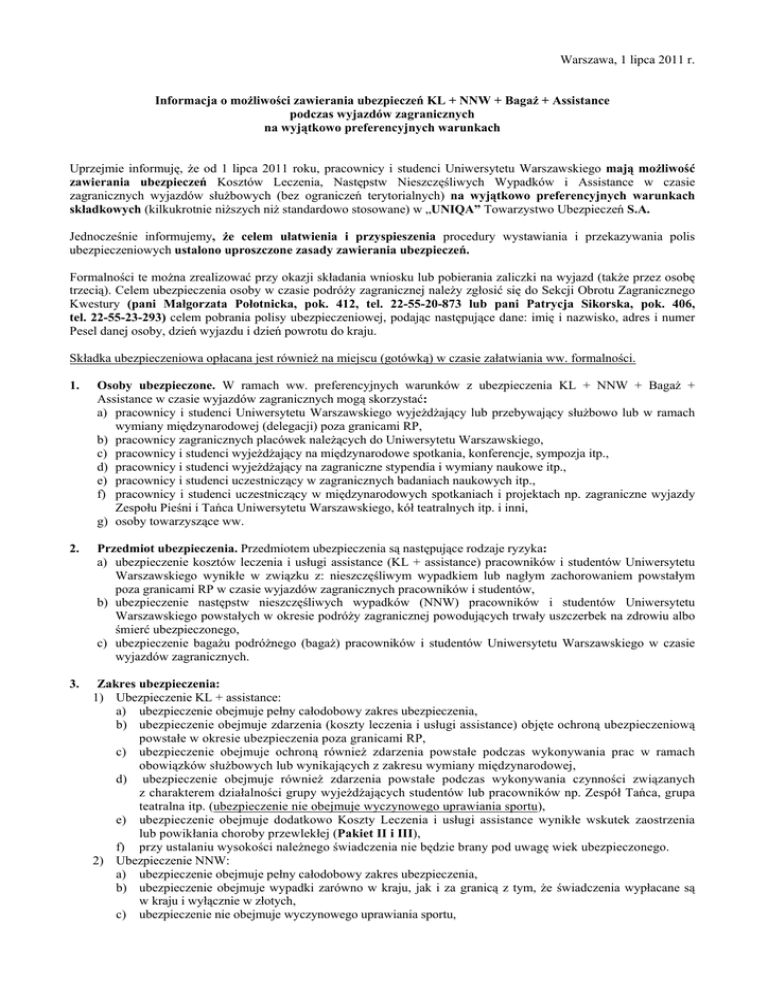 Warszawa, 1 lipca 2011 r. Informacja o możliwości zawierania ubezpieczeń KL + NNW + Bagaż + Assistance podczas wyjazdów zagranicznych na wyjątkowo preferencyjnych warunkach Uprzejmie informuję, że od 1 lipca 2011 roku, pracownicy i studenci Uniwersytetu Warszawskiego mają możliwość zawierania ubezpieczeń Kosztów Leczenia, Następstw Nieszczęśliwych Wypadków i Assistance w czasie zagranicznych wyjazdów służbowych (bez ograniczeń terytorialnych) na wyjątkowo preferencyjnych warunkach składkowych (kilkukrotnie niższych niż standardowo stosowane) w „UNIQA” Towarzystwo Ubezpieczeń S.A. Jednocześnie informujemy, że celem ułatwienia i przyspieszenia procedury wystawiania i przekazywania polis ubezpieczeniowych ustalono uproszczone zasady zawierania ubezpieczeń. Formalności te można zrealizować przy okazji składania wniosku lub pobierania zaliczki na wyjazd (także przez osobę trzecią). Celem ubezpieczenia osoby w czasie podróży zagranicznej należy zgłosić się do Sekcji Obrotu Zagranicznego Kwestury (pani Małgorzata Połotnicka, pok. 412, tel. 22-55-20-873 lub pani Patrycja Sikorska, pok. 406, tel. 22-55-23-293) celem pobrania polisy ubezpieczeniowej, podając następujące dane: imię i nazwisko, adres i numer Pesel danej osoby, dzień wyjazdu i dzień powrotu do kraju. Składka ubezpieczeniowa opłacana jest również na miejscu (gotówką) w czasie załatwiania ww. formalności. 1. Osoby ubezpieczone. W ramach ww. preferencyjnych warunków z ubezpieczenia KL + NNW + Bagaż + Assistance w czasie wyjazdów zagranicznych mogą skorzystać: a) pracownicy i studenci Uniwersytetu Warszawskiego wyjeżdżający lub przebywający służbowo lub w ramach wymiany międzynarodowej (delegacji) poza granicami RP, b) pracownicy zagranicznych placówek należących do Uniwersytetu Warszawskiego, c) pracownicy i studenci wyjeżdżający na międzynarodowe spotkania, konferencje, sympozja itp., d) pracownicy i studenci wyjeżdżający na zagraniczne stypendia i wymiany naukowe itp., e) pracownicy i studenci uczestniczący w zagranicznych badaniach naukowych itp., f) pracownicy i studenci uczestniczący w międzynarodowych spotkaniach i projektach np. zagraniczne wyjazdy Zespołu Pieśni i Tańca Uniwersytetu Warszawskiego, kół teatralnych itp. i inni, g) osoby towarzyszące ww. 2. Przedmiot ubezpieczenia. Przedmiotem ubezpieczenia są następujące rodzaje ryzyka: a) ubezpieczenie kosztów leczenia i usługi assistance (KL + assistance) pracowników i studentów Uniwersytetu Warszawskiego wynikłe w związku z: nieszczęśliwym wypadkiem lub nagłym zachorowaniem powstałym poza granicami RP w czasie wyjazdów zagranicznych pracowników i studentów, b) ubezpieczenie następstw nieszczęśliwych wypadków (NNW) pracowników i studentów Uniwersytetu Warszawskiego powstałych w okresie podróży zagranicznej powodujących trwały uszczerbek na zdrowiu albo śmierć ubezpieczonego, c) ubezpieczenie bagażu podróżnego (bagaż) pracowników i studentów Uniwersytetu Warszawskiego w czasie wyjazdów zagranicznych. 3. Zakres ubezpieczenia: 1) Ubezpieczenie KL + assistance: a) ubezpieczenie obejmuje pełny całodobowy zakres ubezpieczenia, b) ubezpieczenie obejmuje zdarzenia (koszty leczenia i usługi assistance) objęte ochroną ubezpieczeniową powstałe w okresie ubezpieczenia poza granicami RP, c) ubezpieczenie obejmuje ochroną również zdarzenia powstałe podczas wykonywania prac w ramach obowiązków służbowych lub wynikających z zakresu wymiany międzynarodowej, d) ubezpieczenie obejmuje również zdarzenia powstałe podczas wykonywania czynności związanych z charakterem działalności grupy wyjeżdżających studentów lub pracowników np. Zespół Tańca, grupa teatralna itp. (ubezpieczenie nie obejmuje wyczynowego uprawiania sportu), e) ubezpieczenie obejmuje dodatkowo Koszty Leczenia i usługi assistance wynikłe wskutek zaostrzenia lub powikłania choroby przewlekłej (Pakiet II i III), f) przy ustalaniu wysokości należnego świadczenia nie będzie brany pod uwagę wiek ubezpieczonego. 2) Ubezpieczenie NNW: a) ubezpieczenie obejmuje pełny całodobowy zakres ubezpieczenia, b) ubezpieczenie obejmuje wypadki zarówno w kraju, jak i za granicą z tym, że świadczenia wypłacane są w kraju i wyłącznie w złotych, c) ubezpieczenie nie obejmuje wyczynowego uprawiania sportu, d) przy ustalaniu wysokości należnego świadczenia nie będzie brany pod uwagę charakter wykonywanej pracy i innych czynności przez ubezpieczonego (z wyjątkiem wyczynowego uprawiania sportu) oraz jego wiek. 3) Ubezpieczenie bagażu. Ubezpieczenie obejmuje ochroną bagaż podróżny od utraty, zniszczenia lub uszkodzenia wskutek: a) ognia, huraganu, powodzi, deszczu nawalnego, gradu, lawiny, bezpośredniego uderzenia piorunu, zapadania lub osuwania się ziemi, eksplozji oraz upadku statku powietrznego, b) zniszczenia lub uszkodzenia ubezpieczonego bagażu w czasie akcji ratowniczej w związku ze zdarzeniami losowymi wymienionymi w lit. a), c) wypadku lub katastrofy środka komunikacji, d) kradzieży z włamaniem, e) rozboju, f) zaginięcia w przypadku, gdy bagaż znajdował się pod opieką zawodowego przewoźnika, któremu został powierzony do przewozu na podstawie dokumentu przewozowego. 4. Rodzaje świadczeń: 1) W ramach Kosztów Leczenia Ubezpieczyciel pokrywa następujące rodzaje świadczeń w ramach sumy ubezpieczenia (Pakiet I, II i III): a) konsultacje medyczne, b) zabiegi ambulatoryjne, lekarstwa i środki opatrunkowe przepisane przez lekarza, c) badania pomocnicze zlecone przez lekarza (RTG,EKG,USG lub podstawowe badania laboratoryjne) niezbędne do rozpoznania lub leczenia choroby, d) pobyt w szpitalu, tj. leczenie, zabiegi i operacje, których przeprowadzenia z uwagi na wskazania życiowe albo wskazania nagłe lub pilne nie można było odłożyć do czasu powrotu ubezpieczonego do kraju, e) transport medyczny do przychodni lub szpitala z miejsca pobytu ubezp