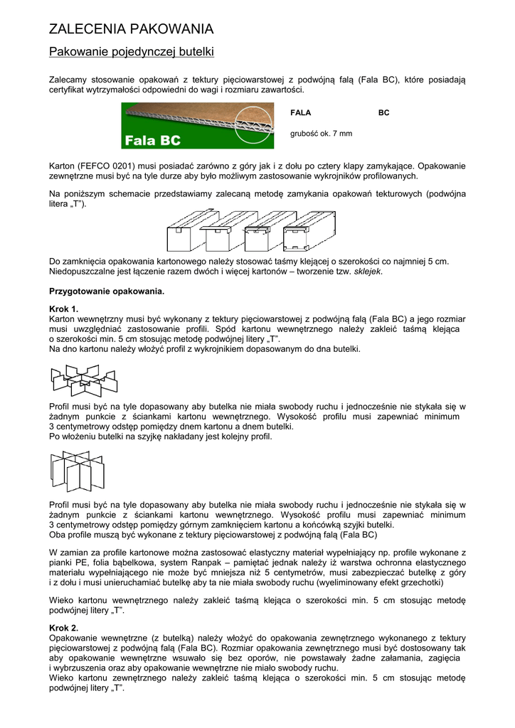 ZALECENIA PAKOWANIA Pakowanie pojedynczej butelki Zalecamy stosowanie opakowań z tektury pięciowarstowej z podwójną falą (Fala BC), które posiadają certyfikat wytrzymałości odpowiedni do wagi i rozmiaru zawartości. FALA BC grubość ok. 7 mm Karton (FEFCO 0201) musi posiadać zarówno z góry jak i z dołu po cztery klapy zamykające. Opakowanie zewnętrzne musi być na tyle durze aby było możliwym zastosowanie wykrojników profilowanych. Na poniższym schemacie przedstawiamy zalecaną metodę zamykania opakowań tekturowych (podwójna litera „T”). Do zamknięcia opakowania kartonowego należy stosować taśmy klejącej o szerokości co najmniej 5 cm. Niedopuszczalne jest łączenie razem dwóch i więcej kartonów – tworzenie tzw. sklejek. Przygotowanie opakowania. Krok 1. Karton wewnętrzny musi być wykonany z tektury pięciowarstowej z podwójną falą (Fala BC) a jego rozmiar musi uwzględniać zastosowanie profili. Spód kartonu wewnętrznego należy zakleić taśmą klejąca o szerokości min. 5 cm stosując metodę podwójnej litery „T”. Na dno kartonu należy włożyć profil z wykrojnikiem dopasowanym do dna butelki. Profil musi być na tyle dopasowany aby butelka nie miała swobody ruchu i jednocześnie nie stykała się w żadnym punkcie z ściankami kartonu wewnętrznego. Wysokość profilu musi zapewniać minimum 3 centymetrowy odstęp pomiędzy dnem kartonu a dnem butelki. Po włożeniu butelki na szyjkę nakładany jest kolejny profil. Profil musi być na tyle dopasowany aby butelka nie miała swobody ruchu i jednocześnie nie stykała się w żadnym punkcie z ściankami kartonu wewnętrznego. Wysokość profilu musi zapewniać minimum 3 centymetrowy odstęp pomiędzy górnym zamknięciem kartonu a końcówką szyjki butelki. Oba profile muszą być wykonane z tektury pięciowarstowej z podwójną falą (Fala BC) W zamian za profile kartonowe można zastosować elastyczny materiał wypełniający np. profile wykonane z pianki PE, folia bąbelkowa, system Ranpak – pamiętać jednak należy iż warstwa ochronna elastycznego materiału wypełniającego nie może być mniejsza niż 5 centymetrów, musi zabezpieczać butelkę z góry i z dołu i musi unieruchamiać butelkę aby ta nie miała swobody ruchu (wyeliminowany efekt grzechotki) Wieko kartonu wewnętrznego należy zakleić taśmą klejąca o szerokości min. 5 cm stosując metodę podwójnej litery „T”. Krok 2. Opakowanie wewnętrzne (z butelką) należy włożyć do opakowania zewnętrznego wykonanego z tektury pięciowarstowej z podwójną falą (Fala BC). Rozmiar opakowania zewnętrznego musi być dostosowany tak aby opakowanie wewnętrzne wsuwało się bez oporów, nie powstawały żadne załamania, zagięcia i wybrzuszenia oraz aby opakowanie wewnętrzne nie miało swobody ruchu. Wieko kartonu zewnętrznego należy zakleić taśmą klejąca o szerokości min. 5 cm stosując metodę podwójnej litery „T”. Pakowanie wielu butelek Wszystkie elementy prezentowanego opakowania wykonane są z tektury pięciowarstwowej z podwójną falą typu BC o gramaturze 2.70 lbs/m2. FALA BC grubość ok. 7 mm Przekładki zastosowane na dnie i na górze kartonu zapewniają amortyzację wstrząsów oddziaływających na dna i szyjki butelek. Zmodyfikowany wykrojnik z wystającymi wypustami zapewnia ochronę boków butelek. Dno jak i górne zamknięcie opakowania musi być zaklejone zgodnie z zasadą podwójnej litery „T”. Na dno kartonu (podwójne „Z”) układany jest profil tekturowy zabezpieczający dna butelek. Następnie do wnętrza kartonu wkładany jest profil (kratownica z wypustkami) zabezpieczający boki butelek. Na górę kratownicy układany jest kolejny profil (podwójne „Z”) zabezpieczający szyjki butelek..