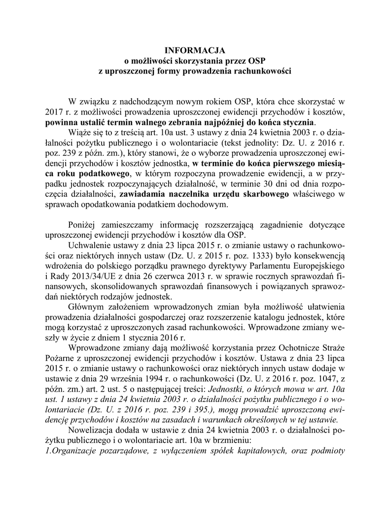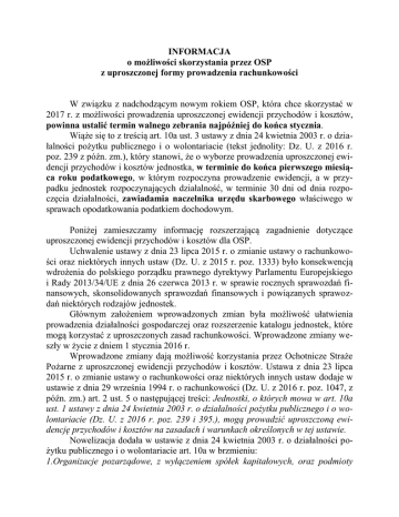INFORMACJA o możliwości skorzystania przez OSP z uproszczonej formy prowadzenia rachunkowości W związku z nadchodzącym nowym rokiem OSP, która chce skorzystać w 2017 r. z możliwości prowadzenia uproszczonej ewidencji przychodów i kosztów, powinna ustalić termin walnego zebrania najpóźniej do końca stycznia. Wiąże się to z treścią art. 10a ust. 3 ustawy z dnia 24 kwietnia 2003 r. o działalności pożytku publicznego i o wolontariacie (tekst jednolity: Dz. U. z 2016 r. poz. 239 z późn. zm.), który stanowi, że o wyborze prowadzenia uproszczonej ewidencji przychodów i kosztów jednostka, w terminie do końca pierwszego miesiąca roku podatkowego, w którym rozpoczyna prowadzenie ewidencji, a w przypadku jednostek rozpoczynających działalność, w terminie 30 dni od dnia rozpoczęcia działalności, zawiadamia naczelnika urzędu skarbowego właściwego w sprawach opodatkowania podatkiem dochodowym. Poniżej zamieszczamy informację rozszerzającą zagadnienie dotyczące uproszczonej ewidencji przychodów i kosztów dla OSP. Uchwalenie ustawy z dnia 23 lipca 2015 r. o zmianie ustawy o rachunkowości oraz niektórych innych ustaw (Dz. U. z 2015 r. poz. 1333) było konsekwencją wdrożenia do polskiego porządku prawnego dyrektywy Parlamentu Europejskiego i Rady 2013/34/UE z dnia 26 czerwca 2013 r. w sprawie rocznych sprawozdań finansowych, skonsolidowanych sprawozdań finansowych i powiązanych sprawozdań niektórych rodzajów jednostek. Głównym założeniem wprowadzonych zmian była możliwość ułatwienia prowadzenia działalności gospodarczej oraz rozszerzenie katalogu jednostek, które mogą korzystać z uproszczonych zasad rachunkowości. Wprowadzone zmiany weszły w życie z dniem 1 stycznia 2016 r. Wprowadzone zmiany dają możliwość korzystania przez Ochotnicze Straże Pożarne z uproszczonej ewidencji przychodów i kosztów. Ustawa z dnia 23 lipca 2015 r. o zmianie ustawy o rachunkowości oraz niektórych innych ustaw dodaje w ustawie z dnia 29 września 1994 r. o rachunkowości (Dz. U. z 2016 r. poz. 1047, z późn. zm.) art. 2 ust. 5 o następującej treści: Jednostki, o których mowa w art. 10a ust. 1 ustawy z dnia 24 kwietnia 2003 r. o działalności pożytku publicznego i o wolontariacie (Dz. U. z 2016 r. poz. 239 i 395.), mogą prowadzić uproszczoną ewidencję przychodów i kosztów na zasadach i warunkach określonych w tej ustawie. Nowelizacja dodała w ustawie z dnia 24 kwietnia 2003 r. o działalności pożytku publicznego i o wolontariacie art. 10a w brzmieniu: 1.Organizacje pozarządowe, z wyłączeniem spółek kapitałowych, oraz podmioty wymienione w art. 3 ust. 3 pkt 2 prowadzą uproszczoną ewidencję przychodów i kosztów, w przypadku gdy: 1) działają w sferze zadań publicznych określonych w art. 4 ust. 1, 2) nie prowadzą działalności gospodarczej w rozumieniu przepisów o swobodzie działalności gospodarczej, 3) nie posiadają statusu organizacji pożytku publicznego, 4) osiągają przychody wyłącznie z: a) działalności nieodpłatnej pożytku publicznego z tytułu składek członkowskich, darowizn, zapisów, spadków, dotacji, subwencji, przychodów pochodzących z ofiarności publicznej, b) działalności odpłatnej pożytku publicznego z tytułu sprzedaży towarów i usług, c) tytułu sprzedaży, najmu lub dzierżawy składników majątkowych, d) tytułu odsetek od środków pieniężnych na rachunkach bankowych lub rachunkach w spółdzielczych kasach oszczędnościowo-kredytowych, prowadzonych w związku z wykonywaną działalnością, w tym także odsetek od lokat terminowych oraz innych form oszczędzania, przechowywania lub inwestowania, tworzonych na tych rachunkach, 5) w roku poprzedzającym rok wyboru prowadzenia uproszczonej ewidencji przychodów i kosztów osiągnęły przychody wyłącznie z tytułów, o których mowa w pkt 4, w wysokości nieprzekraczającej 100 000 zł - jeżeli decyzję w sprawie prowadzenia uproszczonej ewidencji przychodów i kosztów podejmie organ zatwierdzający w rozumieniu przepisów o rachunkowości. 2.Przepisu ust. 1 pkt 5 w zakresie wielkości przychodów nie stosuje się w roku, w którym jednostka rozpoczęła działalność. 3.O wyborze prowadzenia uproszczonej ewidencji przychodów i kosztów jednostka, w terminie do końca pierwszego miesiąca roku podatkowego, w którym rozpoczyna prowadzenie ewidencji, a w przypadku jednostek rozpoczynających działalność, w terminie 30 dni od dnia rozpoczęcia działalności, zawiadamia naczelnika urzędu skarbowego właściwego w sprawach opodatkowania podatkiem dochodowym. 4.Zawiadomienie, o którym mowa w ust. 3, dotyczy także lat następnych, z zastrzeżeniem ust. 5. 5.Jednostka zawiadamia naczelnika urzędu skarbowego właściwego w sprawach opodatkowania podatkiem dochodowym w terminie 14 dni od końca ostatniego miesiąca roku podatkowego, w którym prowadzi uproszczoną ewidencję przychodów i kosztów, o: 1) rezygnacji z prowadzenia tej ewidencji; 2) niespełnianiu warunków, o których mowa w ust. 1. Jeżeli dana OSP spełnia przesłanki zawarte w art. 10a ust. 1 pkt. 1-5 może podjąć decyzję o prowadzeniu uproszczonej ewidencji przychodów i kosztów. Decyzję taką podejmuje organ zatwierdzający w rozumieniu ustawy o rachunkowości. W myśl art. 3 ust. 1 pkt 7 ustawy o rachunkowości przez organ zatwierdzający rozumie się organ, który zgodnie z obowiązującymi jednostkę przepisami prawa, statutem, umową lub na mocy prawa własności jest uprawniony do zatwierdzania sprawozdania finansowego jednostki. W przypadku OSP organem tym będzie walne zebranie członków. Po podjęciu uchwały przez walne zebranie członków należy pamiętać o obowiązkowych zawiadomieniach naczelnika urzędu skarbowego właściwego w sprawach opodatkowania podatkiem dochodowym zawartych w art. 10a ust. 3-5. Na podstawie art. 10a ust. 6 sposób prowadzenia uproszczonej ewidencji przychodów i kosztów został określony w rozporz