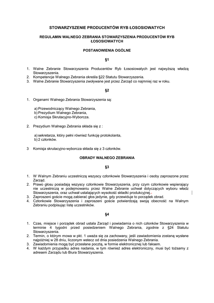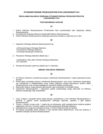 STOWARZYSZENIE PRODUCENTÓW RYB ŁOSOSIOWATYCH REGULAMIN WALNEGO ZEBRANIA STOWARZYSZENIA PRODUCENTÓW RYB ŁOSOSIOWATYCH POSTANOWIENIA OGÓLNE §1 1. Walne Zebranie Stowarzyszenia Producentów Ryb Łososiowatych jest najwyższą władzą Stowarzyszenia. 2. Kompetencje Walnego Zebrania określa §22 Statutu Stowarzyszenia. 3. Walne Zebranie Stowarzyszenia zwoływane jest przez Zarząd co najmniej raz w roku. §2 1. Organami Walnego Zebrania Stowarzyszenia są: a) Przewodniczący Walnego Zebrania, b) Prezydium Walnego Zebrania, c) Komisja Skrutacyjno-Wyborcza. 2. Prezydium Walnego Zebrania składa się z : a) sekretarza, który pełni również funkcję protokolanta, b) 2 członków. 3 Komisja skrutacyjno-wyborcza składa się z 3 członków. OBRADY WALNEGO ZEBRANIA §3 1. W Walnym Zebraniu uczestniczą wszyscy członkowie Stowarzyszenia i osoby zaproszone przez Zarząd. 2. Prawo głosu posiadają wszyscy członkowie Stowarzyszenia, przy czym członkowie wspierający nie uczestniczą w podejmowaniu przez Walne Zebranie uchwał dotyczących wyboru władz Stowarzyszenia, oraz uchwał ustalających wysokość składki produkcyjnej.. 3. Zaproszeni goście mogą zabierać głos jedynie, gdy przewiduje to porządek obrad. 4. Członkowie Stowarzyszenia i zaproszeni goście potwierdzają swoją obecność na Walnym Zebraniu podpisując listę uczestników. §4 1. Czas, miejsce i porządek obrad ustala Zarząd i powiadamia o nich członków Stowarzyszenia w terminie 4 tygodni przed posiedzeniem Walnego Zebrania, zgodnie z §24 Statutu Stowarzyszenia. 2. Termin, o którym mowa w pkt. 1 uważa się za zachowany, jeśli zawiadomienia zostaną wysłane najpóźniej w 28 dniu, liczonym wstecz od dnia posiedzenia Walnego Zebrania. 3. Zawiadomienia mogą być przesłane pocztą, w formie elektronicznej lub faksem. 4. W każdym przypadku adres nadania, w tym również adres elektroniczny, musi być tożsamy z adresem Zarządu lub Biura Stowarzyszenia. §5 1. Do zawiadomienia o Walnym Zebraniu Członków Zarząd załącza: a) porządek obrad Walnego Zebrania, b) sprawozdanie z działalności Stowarzyszenia za rok obrotowy poprzedzający obrady Walnego Zebrania, c) projekt założeń programowych i budżetu na następny rok, d) projekty uchwał w kwestiach objętych porządkiem obrad. 2. Każdy z członków może wnieść zastrzeżenia do porządku obrad. 3. Zastrzeżenia, o których mowa powyżej, członkowie wnoszą na piśmie do czasu rozpoczęcia obrad Walnego Zebrania, określając na piśmie proponowane zmiany oraz przedkładając stosowne projekty uchwał. §6 1 2 3 4 5 Walne Zebranie Członków otwiera Prezes Zarządu Stowarzyszenia lub upoważniony przez niego członek Zarządu Stowarzyszenia. Otwierając Zebranie Prezes Zarządu lub wskazany przez niego członek Zarządu może zaproponować kandydatury na Przewodniczącego Zebrania oraz do pozostałych organów Walnego Zebrania. Po otwarciu obrad członkowie Walnego Zebrania w głosowaniu jawnym dokonują wyboru Przewodniczącego Zebrania. Wybrany Przewodniczący Zebrania zarządza przeprowadzenie wyboru Prezydium Walnego Zebrania Członków oraz Komisji Skrutacyjno-Wyborczej. Wyborów do Prezydium Walnego Zebrania oraz do Komisji Skrutacyjno-Wyborczej dokonuje się spośród członków w głosowaniu jawnym. §7 1. Po dokonaniu wyboru władz Walnego Zebrania Członków Przewodniczący zarządza głosowanie nad porządkiem obrad. 2. Porządek obrad może zostać uzupełniony o kwestie objęte zastrzeżeniami, o których mowa w §5 pkt 2 i 3 Regulaminu. 3. Po przyjęciu porządku obrad Przewodniczący, na podstawie listy obecności, stwierdza, czy zebrało się kworum. 4. W przypadku braku kworum Przewodniczący zarządza zamknięcie obrad Walnego Zebrania i wyznacza termin oraz – po uzgodnieniu z Prezesem Zarządu Stowarzyszenia - miejsce obrad kolejnego Walnego Zebrania. 5. Drugi i kolejny termin obrad Walnego Zebrania może mieć miejsce nie wcześniej niż po upływie 2 godzin od czasu zakończenia obrad pierwszego Walnego Zebrania. 6. W drugim i kolejnym terminie Walne Zebranie obraduje przy zachowaniu porządku obrad pierwszego Walnego Zebrania. §8 1. Po zatwierdzeniu porządku obrad Walne Zebranie przystępuje do jego realizacji. 2. Członkowie, którzy zamierzają wziąć udział w dyskusji nad określonym punktem porządku obrad, zgłaszają się kolejno do głosu. 3. Przewodniczący Walnego Zebrania decyduje o czasie trwania wystąpienia każdego z zabierających głos, o udzieleniu dodatkowego głosu i odebraniu prawa głosu. 4. Przewodniczący obrad może udzielić głosu poza porządkiem obrad Walnego Zebrania lub w związku z dyskusją jedynie dla zgłoszenia wniosku formalnego lub sprostowania błędnie zrozumianego, nieprecyzyjnie przytoczonego stwierdzenia mówcy 5. Przewodniczący Walnego Zebrania wyjaśnia również wszelkie wątpliwości co do porządku obrad, sposobu głosowania i ważności podjętych uchwał. §9 1. Wnioski formalne mogą dotyczyć jedynie spraw będących przedmiotem porządku obrad i jego przebiegu. 2. Do wniosków formalnych zalicza się w szczególności wnioski o: a) przerwanie lub odroczenie Walnego Zebrania Członków na inny termin, b) przejście do porządku obrad, c) głosowanie bez dyskusji, d) ograniczenie czasu wystąpień mówców, e) ponowne stwierdzenie kworum, f) ponowne przeliczenie głosów, 3. O wniosku formalnym Walne Zebranie Członków rozstrzyga większością głosów obecnych członków w głosowaniu jawnym, po wysłuchaniu wnioskodawcy. 4. Odrzucony wniosek formalny nie może być w toku dyskusji nad sprawą zgłoszony powtórnie. GŁOSOWANIE §10 1. Każdy z członków Stowarzyszenia posiada prawo do jednego głosu, z zastrzeżeniem §11 Regulaminu. 2. Głosowanie Walnego Zebrania odbywa się w trybie jawnym albo tajnym. 3. Głosowanie jawne odbywa się przez podniesienie rąk. 4. Głosowanie tajne przeprowadza się przy użyciu kart opatrzonych pieczęcią Stowarzyszenia. 5. Przy
