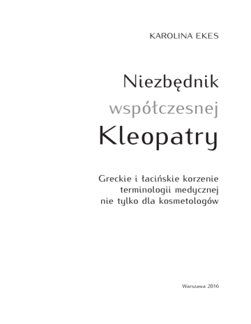 Karolina Ekes Niezbędnik współczesnej Kleopatry Greckie i łacińskie korzenie terminologii medycznej nie tylko dla kosmetologów Warszawa 2016 Recenzja Monika Mikuła Redakcja Mikołaj Szymański Korekta Halina Stykowska Skład PanDawer Projekt okładki Wydawnictwo © Copyright by Karolina Ekes © Copyright by Wydawnictwo Naukowe Sub Lupa, 2016 ISBN 978-83-64003-70-7 Wydawnictwo Naukowe Sub Lupa www.sublupa.pl Serdeczne podziękowania za dofinansowanie wydania podręcznika składamy Fundacji Babel. Spis treści Wstęp . . . . . . . . . . . . . . . . . . . . . . . . . . . . . . . . . . . . . . . . . . . . . . . . . . . . . . . . . . O podręczniku . . . . . . . . . . . . . . . . . . . . . . . . . . . . . . . . . . . . . . . . . . . . . . . . . . . . Podziękowania . . . . . . . . . . . . . . . . . . . . . . . . . . . . . . . . . . . . . . . . . . . . . . . . . . . . O nauce łaciny dla studentów kosmetologii . . . . . . . . . . . . . . . . . . . . . . . . . . . . . . Dlaczego w różnych językach różne wyrazy są do siebie podobne? . . . . . . . . . . . 9 9 10 11 12 Język grecki . . . . . . . . . . . . . . . . . . . . . . . . . . . . . . . . . . . . . . . . . . . . . . . . . . . . Informacje podstawowe . . . . . . . . . . . . . . . . . . . . . . . . . . . . . . . . . . . . . . . . . . . . . Alfabet . . . . . . . . . . . . . . . . . . . . . . . . . . . . . . . . . . . . . . . . . . . . . . . . . . . . . . . . . . Kilka znanych zdań po grecku . . . . . . . . . . . . . . . . . . . . . . . . . . . . . . . . . . . . . . . . 17 17 17 21 Język łaciński . . . . . . . . . . . . . . . . . . . . . . . . . . . . . . . . . . . . . . . . . . . . . . . . . . . Informacje podstawowe . . . . . . . . . . . . . . . . . . . . . . . . . . . . . . . . . . . . . . . . . . . . . Wymowa i akcent . . . . . . . . . . . . . . . . . . . . . . . . . . . . . . . . . . . . . . . . . . . . . . . . . . Łacińska terminologia gramatyczna – podstawa . . . . . . . . . . . . . . . . . . . . . . . . . . Deklinacja . . . . . . . . . . . . . . . . . . . . . . . . . . . . . . . . . . . . . . . . . . . . . . . . . . . . . . . Deklinacja pierwsza . . . . . . . . . . . . . . . . . . . . . . . . . . . . . . . . . . . . . . . . . . . . . Deklinacja druga . . . . . . . . . . . . . . . . . . . . . . . . . . . . . . . . . . . . . . . . . . . . . . . Deklinacja trzecia . . . . . . . . . . . . . . . . . . . . . . . . . . . . . . . . . . . . . . . . . . . . . . Deklinacja czwarta . . . . . . . . . . . . . . . . . . . . . . . . . . . . . . . . . . . . . . . . . . . . . Deklinacja piąta . . . . . . . . . . . . . . . . . . . . . . . . . . . . . . . . . . . . . . . . . . . . . . . . Rzeczowniki greckiego pochodzenia w łacinie . . . . . . . . . . . . . . . . . . . . . . . . Przymiotniki łacińskie . . . . . . . . . . . . . . . . . . . . . . . . . . . . . . . . . . . . . . . . . . . Przysłówki . . . . . . . . . . . . . . . . . . . . . . . . . . . . . . . . . . . . . . . . . . . . . . . . . . . . Stopniowanie przymiotników i przysłówków . . . . . . . . . . . . . . . . . . . . . . . . . Zdrobnienia . . . . . . . . . . . . . . . . . . . . . . . . . . . . . . . . . . . . . . . . . . . . . . . . . . . Koniugacja . . . . . . . . . . . . . . . . . . . . . . . . . . . . . . . . . . . . . . . . . . . . . . . . . . . . . . . Formy podstawowe . . . . . . . . . . . . . . . . . . . . . . . . . . . . . . . . . . . . . . . . . . . . . 4 koniugacje . . . . . . . . . . . . . . . . . . . . . . . . . . . . . . . . . . . . . . . . . . . . . . . . . . . Czas teraźniejszy, strona czynna . . . . . . . . . . . . . . . . . . . . . . . . . . . . . . . . . . . Czas teraźniejszy, strona bierna . . . . . . . . . . . . . . . . . . . . . . . . . . . . . . . . . . . . 23 23 24 28 29 30 30 33 36 37 39 43 45 46 51 52 52 53 55 56 6 Spis treści Verba deponentia . . . . . . . . . . . . . . . . . . . . . . . . . . . . . . . . . . . . . . . . . . . . . . . . . Tryb rozkazujący . . . . . . . . . . . . . . . . . . . . . . . . . . . . . . . . . . . . . . . . . . . . . . . Imiesłowy . . . . . . . . . . . . . . . . . . . . . . . . . . . . . . . . . . . . . . . . . . . . . . . . . . . . . Ważne czasowniki nieregularne . . . . . . . . . . . . . . . . . . . . . . . . . . . . . . . . . . . Łacińskie przyimki . . . . . . . . . . . . . . . . . . . . . . . . . . . . . . . . . . . . . . . . . . . . . . . . . Popularne zwroty łacińskie . . . . . . . . . . . . . . . . . . . . . . . . . . . . . . . . . . . . . . . . . . . Sentencje . . . . . . . . . . . . . . . . . . . . . . . . . . . . . . . . . . . . . . . . . . . . . . . . . . . . . . . . 57 59 60 66 67 69 72 udowa terminów medycznych . . . . . . . . . . . . . . . . . . . . . . . . . . . . . . . . . . . B Wybrane przedrostki greckie i łacińskie, które mogą zainteresować kosmetologa . . . . . . . . . . . . . . . . . . . . . . . . . . . . . . . . . . . . . . . . . . . . . . . . . . . . . . Wybrane rdzenie greckie i łacińskie w terminach złożonych . . . . . . . . . . . . . . . . . Wybrane zakończenia terminów medycznych . . . . . . . . . . . . . . . . . . . . . . . . . . . . Zakończenia rzeczowników . . . . . . . . . . . . . . . . . . . . . . . . . . . . . . . . . . . . . . . Zakończenia przymiotników . . . . . . . . . . . . . . . . . . . . . . . . . . . . . . . . . . . . . . Liczebniki . . . . . . . . . . . . . . . . . . . . . . . . . . . . . . . . . . . . . . . . . . . . . . . . . . . . . . . . Obecne w terminologii medycznej przedrostki liczebnikowe . . . . . . . . . . . . . 79 8 1 8 6 92 92 97 99 106 tymologia wybranych terminów w dziedzinach, z których czerpie E kosmetologia . . . . . . . . . . . . . . . . . . . . . . . . . . . . . . . . . . . . . . . . . . . . . . . . . . . Kosmetologia . . . . . . . . . . . . . . . . . . . . . . . . . . . . . . . . . . . . . . . . . . . . . . . . . . . . . Estetyka . . . . . . . . . . . . . . . . . . . . . . . . . . . . . . . . . . . . . . . . . . . . . . . 