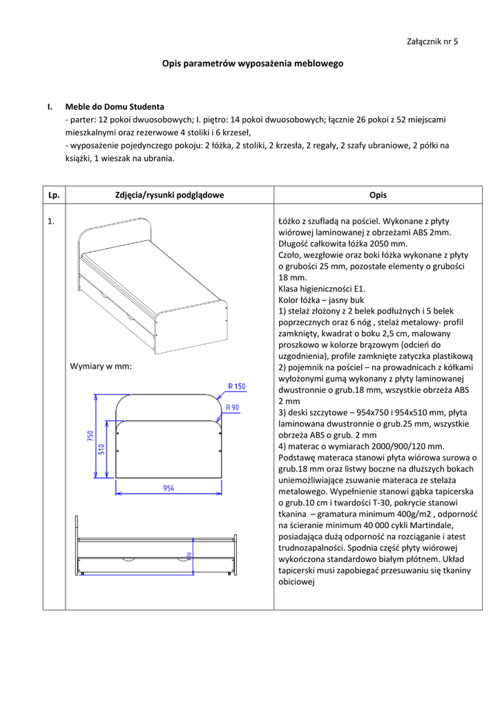 Załącznik nr 5 Opis parametrów wyposażenia meblowego I. Lp. Meble do Domu Studenta - parter: 12 pokoi dwuosobowych; I. piętro: 14 pokoi dwuosobowych; łącznie 26 pokoi z 52 miejscami mieszkalnymi oraz rezerwowe 4 stoliki i 6 krzeseł, - wyposażenie pojedynczego pokoju: 2 łóżka, 2 stoliki, 2 krzesła, 2 regały, 2 szafy ubraniowe, 2 półki na książki, 1 wieszak na ubrania. Zdjęcia/rysunki podglądowe 1. Wymiary w mm: Opis Łóżko z szufladą na pościel. Wykonane z płyty wiórowej laminowanej z obrzeżami ABS 2mm. Długość całkowita łóżka 2050 mm. Czoło, wezgłowie oraz boki łóżka wykonane z płyty o grubości 25 mm, pozostałe elementy o grubości 18 mm. Klasa higieniczności E1. Kolor łóżka – jasny buk 1) stelaż złożony z 2 belek podłużnych i 5 belek poprzecznych oraz 6 nóg , stelaż metalowy- profil zamknięty, kwadrat o boku 2,5 cm, malowany proszkowo w kolorze brązowym (odcień do uzgodnienia), profile zamknięte zatyczka plastikową 2) pojemnik na pościel – na prowadnicach z kółkami wyłożonymi gumą wykonany z płyty laminowanej dwustronnie o grub.18 mm, wszystkie obrzeża ABS 2 mm 3) deski szczytowe – 954x750 i 954x510 mm, płyta laminowana dwustronnie o grub.25 mm, wszystkie obrzeża ABS o grub. 2 mm 4) materac o wymiarach 2000/900/120 mm. Podstawę materaca stanowi płyta wiórowa surowa o grub.18 mm oraz listwy boczne na dłuższych bokach uniemożliwiające zsuwanie materaca ze stelaża metalowego. Wypełnienie stanowi gąbka tapicerska o grub.10 cm i twardości T-30, pokrycie stanowi tkanina – gramatura minimum 400g/m2 , odporność na ścieranie minimum 40 000 cykli Martindale, posiadająca dużą odporność na rozciąganie i atest trudnozapalności. Spodnia część płyty wiórowej wykończona standardowo białym płótnem. Układ tapicerski musi zapobiegać przesuwaniu się tkaniny obiciowej 2. Regał z drzwiczkami wykonany z płyty wiórowej laminowanej 18 mm z obrzeżami ABS 2 mm. Wieniec i górna pokrywa zamykanej szafki z płyty 25 mm. Dół na cokole ze stopkami, z możliwością regulacji wysokości od wewnątrz. Klasa higieniczności E1. Wymiary: 1820x800 mm. Głębokość regału: 400 mm. Kolor regału: jasny buk. Plecy regału wykonane z płyty HDF w kolorze białym o grubości 3 mm. Szafka zamykana, wyposażona w zamek patentowy z zasuwką. Wymiary w mm: 3. Wieszak ubraniowy o wymiarach 1200x650 mm z półką, wykonany z płyty wiórowej laminowanej 18 mm z obrzeżami ABS 2 mm. Kolor jasny buk. Klasa higieniczności E1. Mocowany do ściany za pomocą 3 kołków. Wyposażony w 4 podwójne wieszaki na ubrania w kolorze srebrnym. Wymiary w mm: 4. Krzesło tapicerowane typu ISO. Siedzisko wzmocnione sklejką. Tkanina z włókna syntetycznego • ścieralność: min. 30.000 cykli Martindale Kolor tapicerki: melanż z dodatkiem brązu. Kolor stelażu: odcień brązu (ewentualnie czarny mat). 5. Szafka wisząca na książki o wymiarach 800x400 mm, głębokość 400 mm, wykonana z płyty wiórowej laminowanej 18 mm z obrzeżami ABS 2 mm. Kolor szafki: jasny buk. Klasa higieniczności E1. Wymiary w mm: 6. Szafa ubraniowa o wymiarach 1820x800 mm, głębokość 520 mm, wykonana z płyty wiórowej laminowanej 18 mm z obrzeżami ABS 2 mm. Wieniec z płyty o grubości 25 mm. Dół na cokole ze stopkami, z możliwością regulacji wysokości od wewnątrz. Kolor szafy: jasny buk. Plecy szafy wykonane z materiału HDF w kolorze białym o grubości 3 mm. Klasa higieniczności E1. W środku dzielona w pionie w połowie. Część ubraniowa z wieszakiem u góry, część bieliźniana z 3 półkami. Szafa jest wyposażona w 2 zamki patentowe z zasuwką. Wymiary w mm: 7. Stół o wymiarach blatu 800 x 800 mm. Wysokość stołu: 760 mm Blat wykonany z płyty laminowanej o grubości 25 mm w kolorze jasny buk. Klasa higieniczności E1. Stelaż – pod blatem 4 nogi wykonane z profilu zamkniętego o wymiarze 25x25mm łączone kątownikiem 25x25mm, 15 cm poniżej blatu 2 belki łączące każdą parę wykonane z profilu zamkniętego 25x25mm, 2 belki łączące połączone pośrodku 1 belką z prfilu zamkniętego 25x25mm, malowany proszkowo w kolorze brązowym (odcień zgodny z nogami krzeseł ISO), końce profili zakończone plastikową zatyczką 8. Deska odbojowa 250x50 cm, płyta laminowana dwustronnie o grub.18 mm w kolorze jasny buk, obrzeża ABS o grub. 2 mm, kołki mocujące wyposażone w plastikowe zaślepki. Mocowana na ścianie wzdłuż każdego łóżka. II. L.p. 1. Meble biurowe 1) Mały Dziekanat Zdjęcia/rysunki poglądowe Opis Szafa aktowa o wym. W998/D440/H1838 mm. Konstrukcja szaf wieńcowa z wieńcami nachodzącymi na drzwi Boki: płyta wiórowa 3. warstwowa o grubości 18 mm, pokryta obustronnie melaminą. Klasa higieniczności E1. Boki oklejone PVC 2 mm z czterech stron Plecy: wpuszczane w boki i wieńce, użytkowe z płyty wiórowej 3-warstwowej o grubości 8 mm – pokrytej obustronnie melaminą, płaszczyzna pleców zlicowana z bokami. Klasa higieniczności E1 Wieniec dolny i górny: płyta wiórowa 3. warstwowa o grubości 25 mm, pokryta obustronnie melaminą. Klasa higieniczności E1. Wieniec dolny (cokół) wyposażony w 4 stopki zapewniające poziomowanie od wewnątrz szafy w zakresie 15 mm. Wieńce oklejone PVC 2mm z czterech stron. Fronty oklejone PVC 2 mm z czterech stron Klasa higieniczności E1. Półki mocowane do korpusu systemem zapadkowym, uniemożliwiającym ich przypadkowe wysunięcie. Regulacja wysokości półek co 3 cm na całej wysokości szafy. Dodatkowo w każdej szafie o wysokości powyżej 2OH minimum 1 półka konstrukcyjna mocowana za pomocą złącz metalowo-plastikowych w celu zwiększenia sztywności korpusu. Półki wykonane są z płyty wiórowej 3-warstwowej o grubości 18 mm – pokrytej obustronnie melaminą. Klasa higieniczności E1. Odległość między półkami zgodna z międzynarodowym standardem OH (327 mm). Okucia – szafy wyposażone w zamek baskwilowy dwupunktowy, 1 kluczyk ła