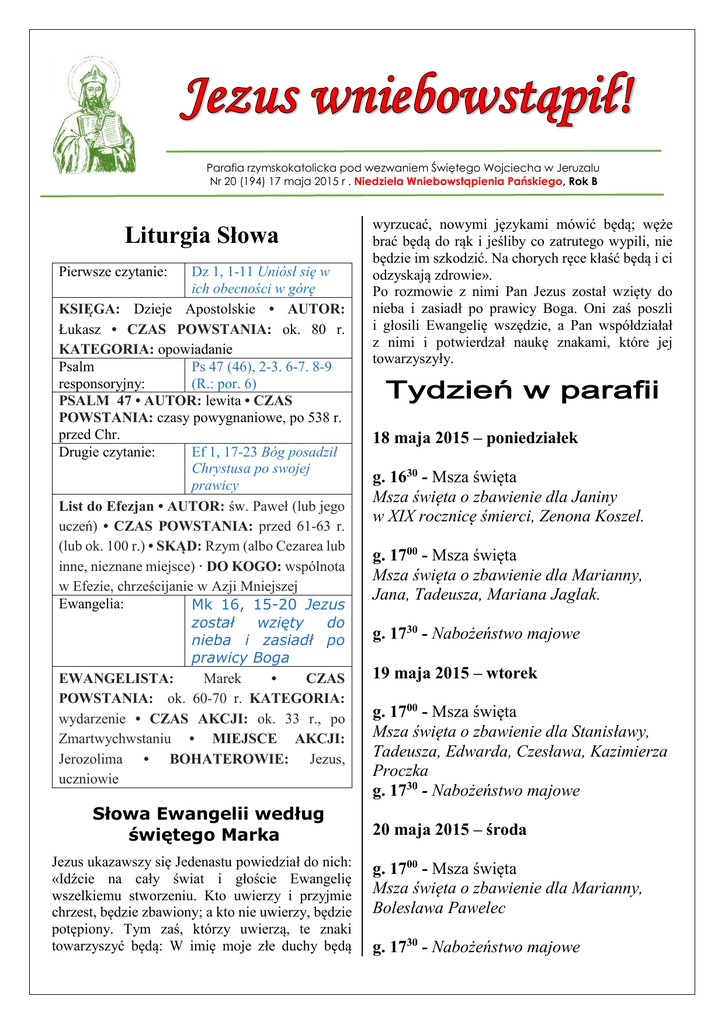 Parafia rzymskokatolicka pod wezwaniem Świętego Wojciecha w Jeruzalu Nr 20 (194) 17 maja 2015 r . Niedziela Wniebowstąpienia Pańskiego, Rok B Liturgia Słowa Dz 1, 1-11 Uniósł się w ich obecności w górę KSIĘGA: Dzieje Apostolskie • AUTOR: Łukasz • CZAS POWSTANIA: ok. 80 r. KATEGORIA: opowiadanie Psalm Ps 47 (46), 2-3. 6-7. 8-9 responsoryjny: (R.: por. 6) PSALM 47 • AUTOR: lewita • CZAS POWSTANIA: czasy powygnaniowe, po 538 r. przed Chr. Drugie czytanie: Ef 1, 17-23 Bóg posadził Chrystusa po swojej prawicy List do Efezjan • AUTOR: św. Paweł (lub jego uczeń) • CZAS POWSTANIA: przed 61-63 r. (lub ok. 100 r.) • SKĄD: Rzym (albo Cezarea lub inne, nieznane miejsce) · DO KOGO: wspólnota w Efezie, chrześcijanie w Azji Mniejszej Ewangelia: Mk 16, 15-20 Jezus został wzięty do nieba i zasiadł po prawicy Boga EWANGELISTA: Marek • CZAS POWSTANIA: ok. 60-70 r. KATEGORIA: wydarzenie • CZAS AKCJI: ok. 33 r., po Zmartwychwstaniu • MIEJSCE AKCJI: Jerozolima • BOHATEROWIE: Jezus, uczniowie Pierwsze czytanie: Słowa Ewangelii według świętego Marka Jezus ukazawszy się Jedenastu powiedział do nich: «Idźcie na cały świat i głoście Ewangelię wszelkiemu stworzeniu. Kto uwierzy i przyjmie chrzest, będzie zbawiony; a kto nie uwierzy, będzie potępiony. Tym zaś, którzy uwierzą, te znaki towarzyszyć będą: W imię moje złe duchy będą wyrzucać, nowymi językami mówić będą; węże brać będą do rąk i jeśliby co zatrutego wypili, nie będzie im szkodzić. Na chorych ręce kłaść będą i ci odzyskają zdrowie». Po rozmowie z nimi Pan Jezus został wzięty do nieba i zasiadł po prawicy Boga. Oni zaś poszli i głosili Ewangelię wszędzie, a Pan współdziałał z nimi i potwierdzał naukę znakami, które jej towarzyszyły. Tydzień w parafii 18 maja 2015 – poniedziałek g. 1630 - Msza święta Msza święta o zbawienie dla Janiny w XIX rocznicę śmierci, Zenona Koszel. g. 1700 - Msza święta Msza święta o zbawienie dla Marianny, Jana, Tadeusza, Mariana Jaglak. g. 1730 - Nabożeństwo majowe 19 maja 2015 – wtorek g. 1700 - Msza święta Msza święta o zbawienie dla Stanisławy, Tadeusza, Edwarda, Czesława, Kazimierza Proczka g. 1730 - Nabożeństwo majowe 20 maja 2015 – środa g. 1700 - Msza święta Msza święta o zbawienie dla Marianny, Bolesława Pawelec g. 1730 - Nabożeństwo majowe 21 maja 2015 – czwartek g. 1700 - Msza święta Msza święta o zbawienie dla Mariana Szeląg w XLII rocznicę śmierci, zmarłych z całej rodziny Szelągów i Listopadów. g. 1730 - Nabożeństwo majowe 22 maja 2015 – piątek g. 1700 - Msza święta Msza święta o zbawienie dla Stanisława Majewskiego w VII rocznicę śmierci, daniela Nalazka, dziadków Majewskich i Okrzejskich g. 1730 - Nabożeństwo majowe 23 maja 2015 – sobota Ciąćka zmarłych z całej rodziny Ciąćków i Zielińskich. g. 1115 - Msza święta. Msza święta wspólna - o obfite Boże błogosławieństwo dla parafian - o zbawienie dla Jana, Genowefy, Mieczysława Podstawka, Teresy Rosa - o zbawienie dla Jana Paciorka Zapowiedzi W najbliższym czasie mają zamiar zawrzeć związek małżeński: Piotr Malka g. 1500 – Spowiedź święta g. 1530 - Msza święta Msza święta o zbawienie dla Kazimiery, Kazimierza Mularczyk, Jerzego i zmarłych z całej rodziny Mularczyków, Sęktasów i Śluzków. g. 1600 - Msza święta Msza święta w XXV rocznicę ślubu Agaty i Grzegorza z prośbą o opiekę Ojca Niebieskiego, o zdrowie, szczęście i miłość. g. 1630 - Msza święta Msza święta o zbawienie dla Aleksandra Osińskiego (z okazji urodzin) g. 1700 - Nabożeństwo majowe g. 1710 – Spowiedź święta 24 maja 2015 – Zesłanie Ducha Świętego g. 900 - Msza święta Msza święta o zbawienie dla Jerzego Zielińskiego w XIII rocznicę śmierci, Bronisława, Jana, Wacława, Stanisława i Magdalena Maria Kielichowska oboje z parafii tutejszej ktokolwiek wiedziałby o jakichkolwiek przeszkodach zachodzących pomiędzy tymi osobami proszony jest o zgłoszenie tego w kancelarii parafialnej * * * * * Komunia Wielkanocna W niedzielę 24 maja obchodzić będziemy Zesłanie Ducha świetego. Uroczystość ta kończy Okres Wielkanocny w Kościele. Kończy się jednocześnie czas kiedy wierni przynajmniej raz w roku są zobowiązani przyjąć Komunię świętą. Serdecznie zachęcam do zachowania tego przykaznia koscielnego. Okazja do spowiedzi będzie w sobotę 23 maja od godz. 1500 i po Nabożeństwie majowym ok. 1710. Pogrzeb Dnia 16 maja 2015 roku w naszej świątyni odbył się pogrzeb: Artura Podstawki Ur.: 26 marca 1989 r. w Mińsku Mazowieckim Zm.: 11 maja 2015 r. w Chrośli W intencji zmarłego zostaną odprawione następujące Msze święte: Dar uczestników pogrzebu 7 czerwca 2015 r. godz. 1115 5 lipca 2015 r. godz. 1115 2 sierpnia 2015 r. godz. 1115 6 września 2015 r. godz. 1115 4 października 2015 r. godz. 1115 8 listopada 2015 r. godz. 1115 6 grudnia 2015 r. godz. 1115 Sprawę zbawienia Artura polecam modlitwom parafian. * * * * * Zachęcam do nabywania tygodnika Idziemy oraz zabierania do domu naszej gazetki parafialnej. Dekoracje kościoła Dziękuję mieszkańcom Jeruzala za zrobienie dekoracji na dzisiejszą niedzielę. Bardzo proszę o zrobienie dekoracji na następne niedziele według następującego planu: 24 maja 2015 31 maja 2015 4/7 czerwca 2015 14 czerwca 2015 Borki Lipiny Płomieniec Dębowce 21 czerwca 2015 28 czerwca 2015 5 lipca 2015 12 lipca 2015 19 lipca 2015 26 lipca 2015 2 sierpnia 2015 9 sierpnia 2015 16 sierpnia 2015 23 sierpnia 2015 30 sierpnia 2015 6 września 2015 13 września 2015 20 września 2015 27 września 2015 4 października 2015 11 października 2015 18 października 2015 25 października 2015 ślub ślub Łukówiec Jeruzal Borki Lipiny Płomieniec Dębowce Łukówiec ślub Jeruzal Borki Śluby Lipiny Płomieniec Dębowce Ślub Łukówiec Jeruzal Powyższe terminy mogą ulec zmianie, choć będę się starał, aby wszystko prze