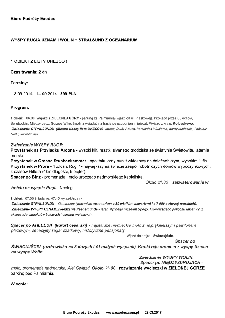 Biuro Podróży Exodus WYSPY RUGIA,UZNAM I WOLIN + STRALSUND Z OCEANARIUM 1 OBIEKT Z LISTY UNESCO ! Czas trwania: 2 dni Terminy: 13.09.2014 - 14.09.2014 399 PLN Program: 1.dzień: 06.00 wyjazd z ZIELONEJ GÓRY - parking za Palmiarnią (wjazd od ul. Piaskowej). Przejazd przez Sulechów, Świebodzin, Międzyrzecz, Gorzów Wlkp. (można wsiadać na trasie po uzgodnieni miejsca). Wyjazd z kraju: Kołbaskowo. Zwiedzanie STRALSUNDU (Miasto Hanzy lista UNESCO) ratusz, Dwór Artusa, kamienica Wulflama, domy kupieckie, kościoły NMP, św.Mikołaja. Zwiedzanie WYSPY RUGII: Przystanek na Przylądku Arcona - wysoki klif, resztki słynnego grodziska ze świątynią Świętowita, latarnia morska. Przystanek w Grosse Stubbenkammer - spektakularny punkt widokowy na śnieżnobiałym, wysokim klifie. Przystanek w Prora - "Kolos z Rugii" - największy na świecie zespół robotniczych domów wypoczynkowych, z czasów Hitlera (4km długości, 6 pięter). Spacer po Binz - promenada i molo uroczego nadmorskiego kąpieliska. Około 21.00 zakwaterowanie w hotelu na wyspie Rugii . Nocleg. 2.dzień: 07.00 śniadanie. 07.45 wyjazd./span> Zwiedzanie STRALSUNDU - Ozeaneum (wspaniałe oceanarium z 39 wielkimi akwariami i z 7 000 zwierząt morskich). Zwiedzanie WYSPY UZNAM:Zwiedzanie Peenemunde - teren słynnego muzeum byłego, hitlerowskiego poligonu rakiet V2, z ekspozycją samolotów bojowych i okrętów wojennych. Spacer po AHLBECK (kurort cesarski) - najstarsze niemieckie molo z najpiękniejszym pawilonem plażowym, secesyjny zegar szafkowy, historyczne pensjonaty. Wjazd do kraju: Świnoujście. Spacer po ŚWINOUJŚCIU (uzdrowisko na 3 dużych i 41 małych wyspach) Krótki rejs promem z wyspy Uznam na wyspę Wolin Zwiedzanie WYSPY WOLIN: Spacer po MIĘDZYZDROJACH molo, promenada nadmorska, Alej Gwiazd. Około 23.00 rozwiązanie wycieczki w ZIELONEJ GÓRZE parking pod Palmiarnią. W cenie: Biuro Podróży Exodus www.exodus.com.pl 02.03.2017 autokar: wysokopokładowy, klimatyzacja, WC, video, napoje zimne i gorące (płatne) około 1020 km noclegi: 1 x hotel*** - pokoje 2,3-osob z łaz/wc wyżywienie: 1 x śniadanie pilot BP EXODUS ubezpieczenie NW, KL, bagaż podatek VAT Dodatkowe opłaty: obiadokolacja (na życzenie) bilet do Ozeaneum - 14 (ulgowy - 8 ) Uwaga: Uwaga: przy długich przejazdach autokar zatrzymuje się na 15-minutowe postoje każdorazowo po około 4-godzinnej jeździe. Nie bierzemy odpowiedzialności za punkty programu niezrealizowane z przyczyn od nas niezależnych. Biuro Podróży Exodus www.exodus.com.pl 02.03.2017