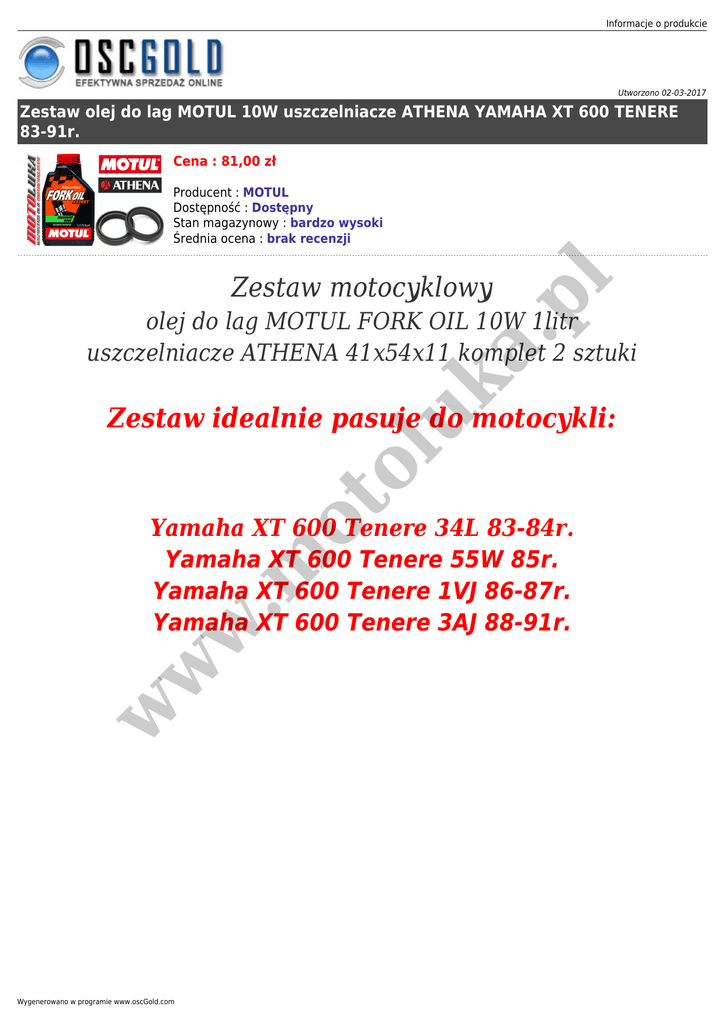 Informacje o produkcie Utworzono 02-03-2017 Zestaw olej do lag MOTUL 10W uszczelniacze ATHENA YAMAHA XT 600 TENERE 83-91r. Cena : 81,00 zł Producent : MOTUL Dostępność : Dostępny Stan magazynowy : bardzo wysoki Średnia ocena : brak recenzji a. pl Zestaw motocyklowy uk olej do lag MOTUL FORK OIL 10W 1litr uszczelniacze ATHENA 41x54x11 komplet 2 sztuki ot ol Zestaw idealnie pasuje do motocykli: w w w .m Yamaha XT 600 Tenere 34L 83-84r. Yamaha XT 600 Tenere 55W 85r. Yamaha XT 600 Tenere 1VJ 86-87r. Yamaha XT 600 Tenere 3AJ 88-91r. Wygenerowano w programie www.oscGold.com a. pl uk w w w .m ot ol Jeśli potrzebujesz innej lepkości oleju: wybierz 5W, 15W lub 20W i zaznacz w informacji przy zakupie.