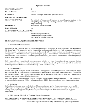 Agnieszka Strzałka STOPIEŃ NAUKOWY dr STANOWISKO adiunkt KATEDRA Katedra Metodyki Nauczania Języków Obcych ROZPRAWA DOKTORSKA TEMAT ROZPRAWY PROMOTOR The attitude of teachers and learners to target language culture in the foreign language teaching – learning process: a cross sectional diagnostic study. prof. dr hab. Maria Wysocka ROK OBRONY 2001 ZAINTERESOWANIA NAUKOWE nauczanie języków obcych, komunikacja międzykulturowa, grzeczność w różnych kulturach. PROWADZONE ZAJĘCIA Z KRÓTKIM OPISEM Intercultural Communication Celem kursu jest zdobycie przez uczestników umiejętności zawartych w modelu edukacji interkulturowej M. Byram’a (1997): nauczyciel języka obcego jako mediator międzykulturowy (cele poznawcze, afektywne i behawioralne – rozumienie, odczuwanie, zachowanie), jak również, bardziej nawiązujących do teorii umiejętności scharakteryzowania podstawowych pojęć komunikacji interkulturowej (relatywizm, etnocentryzm, szok kulturowy, kompetencja interkulturowa) jak również zastosowania ich w interpretacji zjawisk tejże komunikacji. Cele szczegółowe: umiejętność rozpoznawania różnic w stylu komunikacyjnym różnych kultur, rozwiazywania problemów z tym związanych. Umiejętność interpretowania zjawisk i zachowań kulturowych w świetle teorii wymiarów kultury Geerta Hofstede (2001) Sociolinguistics Celem kursu jest zdobycie przez uczestników umiejętności scharakteryzowania podstawowych pojęć socjolingwistyki, ze szczególnym uwzględnieniem pragmatyki w komunikacji interkulturowej, omówienia ich na przykładach, jak również zastosowania ich w interpretacji zjawisk językowych i kulturowych dokonywanej przez nauczyciela języka obcego. Cele szczegółowe: rozpoznawanie różnic w realizacji aktów mowy w języku ojczystym i języku angielskim, w jego odmianie narodowej (ENL) i międzynarodowej (ELF). Kurs prowadzony jest w języku angielskim. Didactics Celem kursu jest syntetyczne omówienie problemów dydaktyki języka obcego z naciskiem na czynniki wpływające na przyswajanie języka obcego. Kurs jest rozszerzeniem, utrwaleniem i usystematyzowaniem wiedzy zdobytej na zajęciach z dydaktyki na poziomie licencjackim. Kurs prowadzony jest w języku angielskim. MA Seminar (Methods of Teaching Foreign Languages) CZŁONKOSTWO W STOWARZYSZENIACH I INSTYTUCJACH NAUKOWYCHKrakowskie Towarzystwo Popularyzowania Wiedzy o Komunikacji Językowej "Tertium WSPÓŁPRACA MIĘDZYNARODOWA 2005 3rd European Week of Education. Erasmus Teaching Staff Mobility. ESEC, Coimbra, 2-7 May, 2005. Portugalia. 2007 Multifola. Multiple Intelligencies in Teaching Foreign Languages. Erasmus Intensive Programme. Project N 47059-IC-2005. Krems, Austria. 2008 Erasmus Teaching Mobility : Universidad de Leon, Hiszpania. 2009 Erasmus Teaching Mobility: Istanbul University, Turcja. 2016 The world of English: theory and practice Seminar. Współpraca międzynarodowa – udział w seminarium naukowym. Luty 2016 –Penza State University, Federacja Rosyjska. UDZIAŁ W KONFERENCJACH NAUKOWYCH KRAJOWYCH I ZAGRANICZNYCH 1999 1.XII Second/Foreign Language Acquisition Conference Szczyrk. 2123.10.1999. Referat: Target language culture in the teaching learning process of English- scheme of a diagnostic study. 2002 2.XV International Conference on Foreign/Second Language Acquisition, Szczyrk, 2002. Referat:“Teaching adults: in search for an ideal teaching style”. 2004 3.April Conference Nine, Kraków, Jagiellonian University, 2002. Referat: ”The role of culture in the teaching of English in secondary schools: the real versus the ideal. 4. Konferencja Język Trzeciego Tysiąclecia, Towarzystwo Tertium. Referat:”Rozwijanie międzykulturowej świadomości obecnych i przyszłych nauczycieli języka angielskiego” 5. Konferencja "Integracja w nauczaniu języków obcych", Zielona Góra. Referat: „Zintegrowane nauczanie języka i kultury.” 6.Culture in ELT – Intercultural materials in the classroom and on the web Seminar. 23-25 stycznia 2004. Referat: ”Culture in ELT: a report on MA projects in progress at the Jagiellonian university, department of English”. 7. Konferencja Dydaktyka języków obcych a komunikacja interkulturowa.” WSB Poznań. Referat: „W stronę kompetencji interkulturowej uczniów : implementacja programów interkulturowych w szkole ponadgimnazjalnej.” 2005 2006 8. Konferencja miedzynarodowa ”English is not enough” Palacky University Olomouc. Referat ”What do English teachers need today,apart from their English 9.1st International Conference on Teacher Education : Kraków, 12-15 May 2005. Referat: “Preparing to teach culture in the English classroom and beyond.” 10. Konferencja Język Trzeciego Tysiąclecia IV. 9-12 marca 2006. Referat: „Rozwój osobisty nauczyciela języków obcych.” 11. XVIII International Conference on Foreign/Second Language Acquisition. Szczyrk 2006. Referat: “Towards greater autonomy in the Polish foreign language classroom. “ 2007 12. 2nd International Conference on Teacher Education: Cuenca, Universidad de Castilla-la_Mancha. Referat: “Putting the theory of multiple intelligences into practice: the European context.” 2009 13.3rd International Conference on Teacher Education: Kraków. Referat: “Developing teachers' intercultural awareness: path and meanders.” 2010 14. Konferencja Autonomia w Nauce Języków Obcych. PWSZ Konin. Maj 2010. Referat: „Rozbudzanie wrażliwości interkulturowej –autonomia studenta i nauczyciela dla autonomii ucznia.” 2011 15. 4th International Conference on Teacher Education’. Referat: “Polite as you can be. Teaching to be polite in English as a Lingua Franca”. 2012 16.Konferencja Język Trzeciego Tysiąclecia Krakowskiego Towarzystwa Tertium. Marzec 2012. Referat: „Masz rację, ale….czy Wcale nie! Jak Polacy uczący się angielskiego bronią swojego zdania.” 2013 17.Sympozjum Cultnet, Durham University, Wielka Brytania. 17-18 Kwiecień 2013. Referat: ”Do 