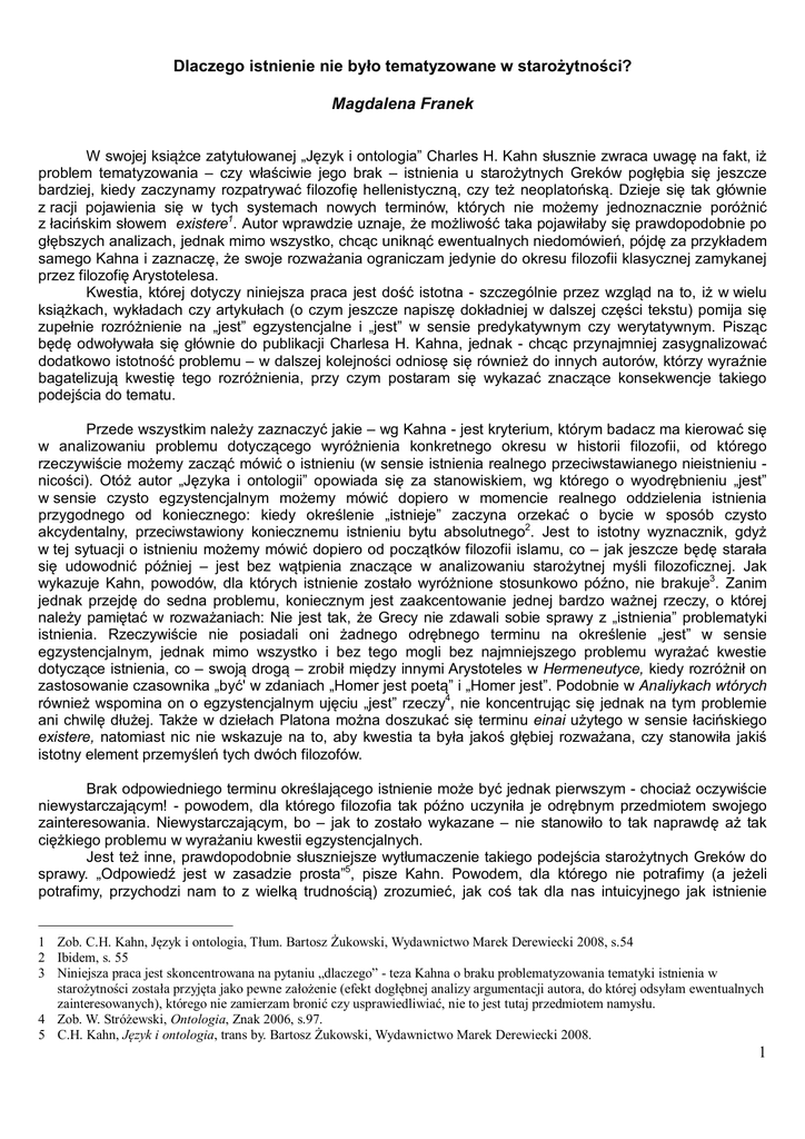 Dlaczego istnienie nie było tematyzowane w starożytności? Magdalena Franek W swojej książce zatytułowanej „Język i ontologia” Charles H. Kahn słusznie zwraca uwagę na fakt, iż problem tematyzowania – czy właściwie jego brak – istnienia u starożytnych Greków pogłębia się jeszcze bardziej, kiedy zaczynamy rozpatrywać filozofię hellenistyczną, czy też neoplatońską. Dzieje się tak głównie z racji pojawienia się w tych systemach nowych terminów, których nie możemy jednoznacznie poróżnić z łacińskim słowem existere1. Autor wprawdzie uznaje, że możliwość taka pojawiłaby się prawdopodobnie po głębszych analizach, jednak mimo wszystko, chcąc uniknąć ewentualnych niedomówień, pójdę za przykładem samego Kahna i zaznaczę, że swoje rozważania ograniczam jedynie do okresu filozofii klasycznej zamykanej przez filozofię Arystotelesa. Kwestia, której dotyczy niniejsza praca jest dość istotna - szczególnie przez wzgląd na to, iż w wielu książkach, wykładach czy artykułach (o czym jeszcze napiszę dokładniej w dalszej części tekstu) pomija się zupełnie rozróżnienie na „jest” egzystencjalne i „jest” w sensie predykatywnym czy werytatywnym. Pisząc będę odwoływała się głównie do publikacji Charlesa H. Kahna, jednak - chcąc przynajmniej zasygnalizować dodatkowo istotność problemu – w dalszej kolejności odniosę się również do innych autorów, którzy wyraźnie bagatelizują kwestię tego rozróżnienia, przy czym postaram się wykazać znaczące konsekwencje takiego podejścia do tematu. Przede wszystkim należy zaznaczyć jakie – wg Kahna - jest kryterium, którym badacz ma kierować się w analizowaniu problemu dotyczącego wyróżnienia konkretnego okresu w historii filozofii, od którego rzeczywiście możemy zacząć mówić o istnieniu (w sensie istnienia realnego przeciwstawianego nieistnieniu nicości). Otóż autor „Języka i ontologii” opowiada się za stanowiskiem, wg którego o wyodrębnieniu „jest” w sensie czysto egzystencjalnym możemy mówić dopiero w momencie realnego oddzielenia istnienia przygodnego od koniecznego: kiedy określenie „istnieje” zaczyna orzekać o bycie w sposób czysto akcydentalny, przeciwstawiony koniecznemu istnieniu bytu absolutnego2. Jest to istotny wyznacznik, gdyż w tej sytuacji o istnieniu możemy mówić dopiero od początków filozofii islamu, co – jak jeszcze będę starała się udowodnić później – jest bez wątpienia znaczące w analizowaniu starożytnej myśli filozoficznej. Jak wykazuje Kahn, powodów, dla których istnienie zostało wyróżnione stosunkowo późno, nie brakuje3. Zanim jednak przejdę do sedna problemu, koniecznym jest zaakcentowanie jednej bardzo ważnej rzeczy, o której należy pamiętać w rozważaniach: Nie jest tak, że Grecy nie zdawali sobie sprawy z „istnienia” problematyki istnienia. Rzeczywiście nie posiadali oni żadnego odrębnego terminu na określenie „jest” w sensie egzystencjalnym, jednak mimo wszystko i bez tego mogli bez najmniejszego problemu wyrażać kwestie dotyczące istnienia, co – swoją drogą – zrobił między innymi Arystoteles w Hermeneutyce, kiedy rozróżnił on zastosowanie czasownika „być' w zdaniach „Homer jest poetą” i „Homer jest”. Podobnie w Analiykach wtórych również wspomina on o egzystencjalnym ujęciu „jest” rzeczy4, nie koncentrując się jednak na tym problemie ani chwilę dłużej. Także w dziełach Platona można doszukać się terminu einai użytego w sensie łacińskiego existere, natomiast nic nie wskazuje na to, aby kwestia ta była jakoś głębiej rozważana, czy stanowiła jakiś istotny element przemyśleń tych dwóch filozofów. Brak odpowiedniego terminu określającego istnienie może być jednak pierwszym - chociaż oczywiście niewystarczającym! - powodem, dla którego filozofia tak późno uczyniła je odrębnym przedmiotem swojego zainteresowania. Niewystarczającym, bo – jak to zostało wykazane – nie stanowiło to tak naprawdę aż tak ciężkiego problemu w wyrażaniu kwestii egzystencjalnych. Jest też inne, prawdopodobnie słuszniejsze wytłumaczenie takiego podejścia starożytnych Greków do sprawy. „Odpowiedź jest w zasadzie prosta”5, pisze Kahn. Powodem, dla którego nie potrafimy (a jeżeli potrafimy, przychodzi nam to z wielką trudnością) zrozumieć, jak coś tak dla nas intuicyjnego jak istnienie 1 Zob. C.H. Kahn, Język i ontologia, Tłum. Bartosz Żukowski, Wydawnictwo Marek Derewiecki 2008, s.54 2 Ibidem, s. 55 3 Niniejsza praca jest skoncentrowana na pytaniu „dlaczego” - teza Kahna o braku problematyzowania tematyki istnienia w starożytności została przyjęta jako pewne założenie (efekt dogłębnej analizy argumentacji autora, do której odsyłam ewentualnych zainteresowanych), którego nie zamierzam bronić czy usprawiedliwiać, nie to jest tutaj przedmiotem namysłu. 4 Zob. W. Stróżewski, Ontologia, Znak 2006, s.97. 5 C.H. Kahn, Język i ontologia, trans by. Bartosz Żukowski, Wydawnictwo Marek Derewiecki 2008. 1 mogło nie być kiedykolwiek problematyzowane – a już szczególnie w czasach świetności rozumu, kiedy to rodziła się i rozwijała filozofia, a człowiek był w całości ukierunkowany na wyjaśnianie zasad rządzących wszechświatem – jest nasz brak zdolności do wykraczania poza ramy myślenia specyficznego dla naszych czasów. Problemy egzystencjalne, koncentracja wokół specjalizacji, czyli tylko części całości, jak również „ta społeczna choroba współczesności, jaką jest indywidualizm”6, jak pisze ksiądz P. Florenski w jednym ze swoich dzieł – wszystko to cechuje mentalność dzisiejszego człowieka i ogranicza go w takim stopniu, że zrozumienie sposobu myślenia starożytnego Greka bynajmniej nie jest dla niego sprawą oczywistą, przychodzącą naturalnie. A to właśnie sposób myślenia starożytnych jest tu główną przyczyną tego, i