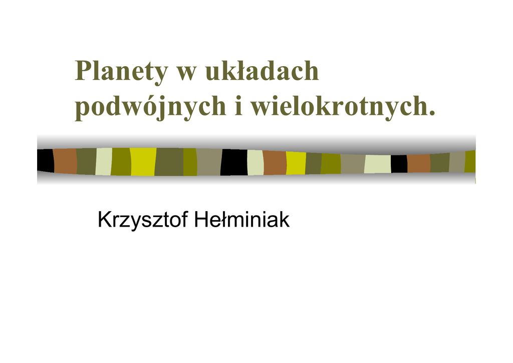 Planety w układach podwójnych i wielokrotnych. Krzysztof Hełminiak Plan wystąpienia Troszkę niedalekiej historii. Dlaczego wokół podwójnych? Pobieżna statystyka. Typy planet w układach podwójnych. Stabilność orbit. Dyski protoplanetarne. Powstawanie i ewolucja. Gwiazdy vs. planety. Historia 1989(!) – HD 114762 b: M2sini = 11 MJ. Prawdopodobnie mała inklinacja. Separacja gwiazd ~130AU. 1996 – 16Cyg Bb: M2sini = 1.69 MJ. Pierwsza odkryta po 51Peg b. Separacja gwiazd ~700AU. 1996 – 56Cnc b: M2sini = 0.784 MJ. Pierwsza z wielu (5?) planet. Separacja gwiazd ~1150AU. 1996 - τ Boo b: M2sini = 3.9 MJ. Znana orbita składnika wtórnego. Separacja gwiazd ~240AU. 1996 - υ And b: M2sini = 0.69 MJ. Kolejny układ wieloplanetarny. Separacja gwiazd ~750AU. 2003 - γ Cep b: M2sini = 1.59 MJ. Układ spektroskopowo podwójny. T ~ 70yr (1993)2003 - PSR B1620-26 b: M2 = 2.5 MJ. Planeta w układzie pulsarbiały karzeł. T = 191.4428 d Dlaczego w podwójnych? Około 60% gwiazd znajduje się w układach podwójnych lub wielokrotnych. Ich powstawanie i ewolucja jest mechanizmem bardziej ogólnym niż w przypadku gwiazd pojedynczych. Na 185 znanych planet pozasłonecznych tylko ok. 20 znajduje się w układach podwójnych/wielokrotnych Dlaczego tak mało? Przeważnie w układach rozległych. Drugi składnik układu odkrywany znacznie później. Metoda RV słabo sobie radzi w przypadku układów spektroskopowo podwójnych. Ale... Nie było przeglądów RV nastawionych na układy podwójne. Inne jak do tej pory metody są niedostatecznie czułe lub mniej efektywne. Trochę statystyki... W układach podwójnych „gorące Jowisze” mogą osiągać większe masy, ale i tak mniejsze niż 5 MJ. ...i mają mniejsze mimośrody. Spadek w okolicach 3 AU to efekt obserwacyjny. Minimum w okolicach 0.3 AU wydaje się być rzeczywiste. Typy planet w układach podwójnych Typ S (satelitarne) – planeta krąży wokół jednej z gwiazd rozległego układu. Typ P (planetarne) – planeta krąży wokół całego, stosunkowo ciasnego układu. Typ L (libracyjne) – planeta w punkcie Lagrange’a L4 lub L5. Stabilność orbit planet m = M2 / (M1 + M2) – parametr masy •ab, eb – wielka półoś i ekscentryczność orbity Typ S: rc = 0.37 ab, rc = 0.14 ab, Typ P: rc = 2.3 ab, rc = 3.9 ab, dla eb ~ 0 dla eb = 0.5 m = 0.3 ep = 0 ip = 0 Czynniki redukujące obszar stabilności: • zwiększenie eb • zwiększenie ekscentryczności orbity planety • zwiększenie inklinacji orbity planety, o ile towarzysz gwiazdowy jest odpowiednio masywny Dyski protoplanetarne Obserwowane są zarówno wokół poszczególnych gwiazd układu (okołogłówne, okołowtórne) jak i wokół całego układu (okołopodwójne). OBECNOŚĆ TOWARZYSZA PRZEDE WSZYSTKIM DETERMINUJE ROZMIARY DYSKU. L1551 IRS 5 Rozmiary dysków Dyski okołogłówne (promień zewnętrzny): rt = 0.40 ab, dla eb ~ 0 rt = 0.27 ab, dla eb = 0.5 Dyski okołopodwójne (promień wewnętrzny): rt = 2.0 ab, dla eb ~ 0 rt = 3.0 ab, dla eb = 0.5 Zagadka: HD 188753 Ab Powstawanie planet (ogólnie) Model Safronova: • Planety powstają w cienkim, lepkim dysku protoplanetarnym, otaczającym młodą protogwiazdę. • W małych odległościach od protogwiazdy promieniowanie i temperatura usuwa gaz z dysku, pozostawiając tylko ziarna pyłu, z których przez zlepianie tworzą skaliste się planetozymale. • Za „linią śniegu” powstają planety olbrzymy, zawierające skaliste jądro i grubą gazową atmosferę. ...ale HD 188753! Powstawanie olbrzymów Akrecja na jądro: Skaliste embriony o masie ok. 10 MZ akreują otaczający je gaz, który tworzy atmosferę. • Zbyt długa skala czasowa 106 – 107 yr • Obserwacyjne dowody istnienia dysków, w których zaczęło się zlepianie ziaren. • Uwzględnienie powstania planet skalistych • • Niestabilność dysku Fragmentacja dysku na małe, samograwitujące fragmenty + opadanie ziaren pyłu ku centrum „zagęszczenia”. • Skala czasowa ~103 yr. • Dyski wokółgwiazdowe są tworami stabilnymi! • Nie wyklucza powstawania planet skalistych. ZDANIA SĄ PODZIELONE. ...w układach podwójnych (S). NIE POWSTANĄ JEŚLI TOWARZYSZ JEST ZA BLISKO Drugi składnik może być źródłem niestabilności ...ale niestabilności te mogą szybko zniszczyć dysk. Model akrecji daje taką samą wydajność tworzenia planet jowiszowych w układach podwójnych, co wokół gwiazd pojedynczych. Niestabilności – nie. Dysk może zostać podgrzany, co spowoduje wyparowanie gazów i lodów. ...ale tylko w ekstremalnych przypadkach. ZDANIA SĄ JESZCZE BARDZIEJ PODZIELONE. Proces migracji MIGRACJA – proces zacieśniania orbity (utraty momentu pędu) masywnej protoplanety na skutek oddziaływań grawitacyjnych i lepkościowych z dyskiem. Jej tempo jest tym szybsze im mniejsza jest masa planety i bardziej lepki dysk. Generalnie na orbitach ciaśniejszych znajdują się planety mniej masywne. Ale w przypadku planet tranzytujących zależność jest odwrotna ...a w układach podwójnych. Szybsze tempo migracji Szybsze tempo akrecji gazu na planetę Cyrkularyzacja orbity Stąd masywniejsze planety na ciaśniejszych orbitach w układach podwójnych. MIGRACJA KOZAIA: wartość mimośrodu orbity planety podlega cyklicznym oscylacjom (mechanizm K.). Gdy e jest duże, oddziaływania pływowe w okolicy peryastronu prowadzą do dyssypacji znacznej ilości energii. Stąd bardzo ciasne oraz bardzo wydłużone orbity planet. Formowanie planet skalistych. Zderzanie i zlepianie się ziaren, prowadzące do powstania planetozymali. Wpływ drugiej gwiazdy ogranicza się do zredukowania obszarów stabilności. Symulacja powstawania planet skalistych wokół α Centauri i podobnych układów. W UKŁADZIE PODWÓJNYM MOŻE POWSTAĆ SYSTEM PLANETARNY TAKI SAM JAK W UKŁADZIE GWIAZDA – PLANETA JOWISZOWA. Gwiazda/planeta – granica masy. Pustynia Brązowych Karłów wypełnia się z obu stron. Gwiazda/planeta – orbity. Z punktu widzenia dynamiki różni