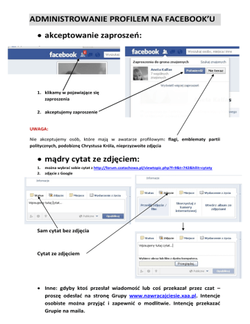 ADMINISTROWANIE PROFILEM NA FACEBOOK’U akceptowanie zaproszeo: 1. klikamy w pojawiające się zaproszenia 2. akceptujemy zaproszenie UWAGA: Nie akceptujemy osób, które mają w awatarze profilowym: flagi, emblematy partii politycznych, podobiznę Chrystusa Króla, nieprzyzwoite zdjęcia mądry cytat ze zdjęciem: 1. 2. można wybrad sobie cytat z http://forum.czatachowa.pl/viewtopic.php?f=9&t=742&hilit=cytaty zdjęcie z Google Sam cytat bez zdjęcia Cytat ze zdjęciem Inne: gdyby ktoś przesłał wiadomośd lub coś przekazał przez czat – proszę odesład na stronę Grupy www.nawracajciesie.xaa.pl. Intencje osobiste można przyjąd i zapewnid o modlitwie. Intencję przekazad Grupie na maila.
