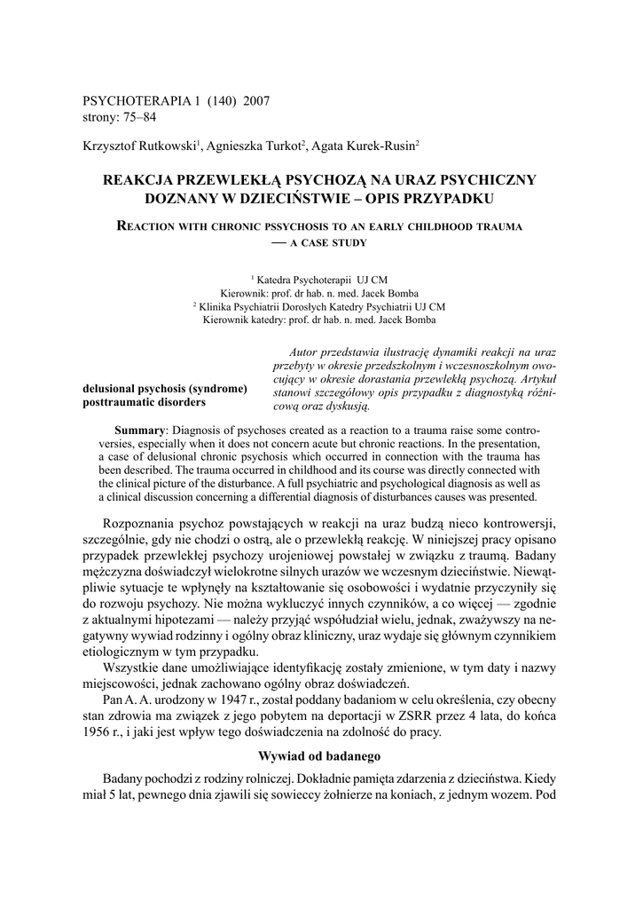 Psychoterapia 1 (140) 2007 strony: 75–84 Krzysztof Rutkowski1, Agnieszka Turkot2, Agata Kurek-Rusin2 Reakcja przewlekłą psychozą na uraz psychiczny doznany w dzieciństwie – opis przypadku Reaction with chronic pssychosis to an early childhood trauma — a case study 1 Katedra Psychoterapii UJ CM Kierownik: prof. dr hab. n. med. Jacek Bomba 2 Klinika Psychiatrii Dorosłych Katedry Psychiatrii UJ CM Kierownik katedry: prof. dr hab. n. med. Jacek Bomba delusional psychosis (syndrome) posttraumatic disorders Autor przedstawia ilustrację dynamiki reakcji na uraz przebyty w okresie przedszkolnym i wczesnoszkolnym owocujący w okresie dorastania przewlekłą psychozą. Artykuł stanowi szczegółowy opis przypadku z diagnostyką różnicową oraz dyskusją. Summary: Diagnosis of psychoses created as a reaction to a trauma raise some controversies, especially when it does not concern acute but chronic reactions. In the presentation, a case of delusional chronic psychosis which occurred in connection with the trauma has been described. The trauma occurred in childhood and its course was directly connected with the clinical picture of the disturbance. A full psychiatric and psychological diagnosis as well as a clinical discussion concerning a differential diagnosis of disturbances causes was presented. Rozpoznania psychoz powstających w reakcji na uraz budzą nieco kontrowersji, szczególnie, gdy nie chodzi o ostrą, ale o przewlekłą reakcję. W niniejszej pracy opisano przypadek przewlekłej psychozy urojeniowej powstałej w związku z traumą. Badany mężczyzna doświadczył wielokrotne silnych urazów we wczesnym dzieciństwie. Niewątpliwie sytuacje te wpłynęły na kształtowanie się osobowości i wydatnie przyczyniły się do rozwoju psychozy. Nie można wykluczyć innych czynników, a co więcej — zgodnie z aktualnymi hipotezami — należy przyjąć współudział wielu, jednak, zważywszy na negatywny wywiad rodzinny i ogólny obraz kliniczny, uraz wydaje się głównym czynnikiem etiologicznym w tym przypadku. Wszystkie dane umożliwiające identyfikację zostały zmienione, w tym daty i nazwy miejscowości, jednak zachowano ogólny obraz doświadczeń. Pan A. A. urodzony w 1947 r., został poddany badaniom w celu określenia, czy obecny stan zdrowia ma związek z jego pobytem na deportacji w ZSRR przez 4 lata, do końca 1956 r., i jaki jest wpływ tego doświadczenia na zdolność do pracy. Wywiad od badanego Badany pochodzi z rodziny rolniczej. Dokładnie pamięta zdarzenia z dzieciństwa. Kiedy miał 5 lat, pewnego dnia zjawili się sowieccy żołnierze na koniach, z jednym wozem. Pod 76 Krzysztof Rutkowski i wsp. groźbą kazano całej rodzinie wsiąść na wóz — matce, dwóm starszym siostrom, bratu oraz jemu. Kiedy żołnierze przeszukiwali i niszczyli dom, na wóz niespodziewanie wskoczył pies. Był to ulubieniec badanego; wtulił się w niego mocno i nie chciał zejść. Kiedy żołnierze próbowali go ściągnąć, jednego z nich ugryzł. Wówczas rozzłoszczeni zakłuli psa bagnetami. Do nieżywego psa zeskoczył z wozu zrozpaczony badany, objął go i trzymał kurczowo. Żołnierze siłą rozdzielili ich od siebie, brutalnie kopiąc i bijąc. Nagle badany zaczął uciekać do pobliskiego lasu. Żołnierze ruszyli w pościg — „wkrótce usłyszałem tuż, tuż za mną tętent i nagle zobaczyłem obok mnie, na równi ze mną końskie kopyta i po chwili pochylającego się jeźdźca, bardzo groźnego i wściekłego, coś krzyczącego. Nagle poczułem uderzenie w głowę i ból. I więcej już nic nie pamiętałem”. Badany dowiedział się później od matki, że żołnierz wrzucił go na wóz „nieprzytomnego i półżywego”. Był posiniaczony, miał zakrwawione oko. Odzyskał przytomność dopiero po tygodniu, w wagonie towarowym, w którym rodzina była wieziona na deportację do Kazachstanu. „Po obudzeniu się czułem w głowie jakiś ból, dzwonienie i szum w uszach oraz potworne pieczenie w lewym oku”. Jak mówi, od tej pory niedosłyszy na lewe ucho, a źrenica oka lewego jest sztywna, nie reaguje na światło. Kiedy przyjechali do Kazachstanu, zostali zakwaterowani w drewnianych barakach. Było zimno, brudno. Codziennie rano przyjeżdżał „jeździec na koniu” i stukał nahajką w okno, krzyczał potwornie. Na ten znak matka z trojgiem starszego rodzeństwa wychodziła do pracy w kołchozie. Badany pozostawał sam w baraku do wieczora. Bardzo się bał, był głodny, zmarznięty. Kiedy był spragniony — pił wodę z brudnego kanału. Bezustannie chorował, miał biegunki, bóle brzucha, gorączkował. Wspomina, że umierało bardzo wielu Polaków z powodu biegunki, „on przeżył cudem”. Pomogła mu miejscowa uzdrowicielka Maria, która gorliwie się za niego modliła i wykonywała uzdrawiające rytuały. Została później surowo ukarana za uprawianie tego procederu. Z tego okresu pamięta, że bardzo niespokojnie sypiał, wybudzał się, pełen lęku i niepokoju. Przed pójściem do pierwszej klasy pracował przy pasaniu krów i owiec, zbieraniu bawełny oraz innych sezonowych robotach. Pracował bardzo sumiennie, ponieważ bał się brygadzisty, który jeździł konno, „nahajką każdemu wygrażał i na wszystkich krzyczał”. Bał się również o matkę, która często do domu wracała pobita. Pewnego dnia był ogromnie głodny. Poszedł do kołchozowego ogrodu i ukradł arbuza. Gdy go jadł, zobaczył go brygadzista, zbił batem, a następnie zamknął na dwa dni w komórce, bez jedzenia i picia. Kiedy zjawił się ponownie, przyniósł jedzenie i zmusił chłopca do dotykania swojego penisa. Było to dla badanego bardzo traumatyzujące przeżycie — opowiadając to cały czas płakał. Pamięta tylko odrazę, niezadowolenie brygadzisty oraz swój lęk. Brygadzista zakazał mu mówić o tym komukolwiek, a zwłaszcza swojej matce. Zagroził, że jeśli powie, to on zabije całą rodzinę. Od tej pory chłopiec zaczął si