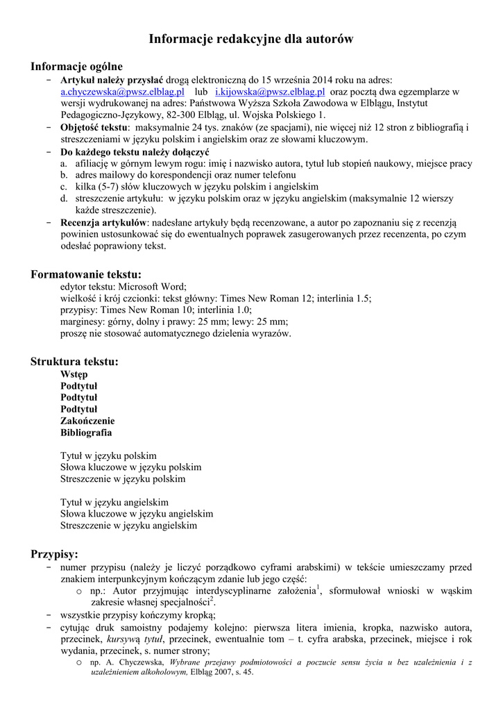 Informacje redakcyjne dla autorów Informacje ogólne - Artykuł należy przysłać drogą elektroniczną do 15 września 2014 roku na adres: [email protected] lub [email protected] oraz pocztą dwa egzemplarze w wersji wydrukowanej na adres: Państwowa Wyższa Szkoła Zawodowa w Elblągu, Instytut Pedagogiczno-Językowy, 82-300 Elbląg, ul. Wojska Polskiego 1. - Objętość tekstu: maksymalnie 24 tys. znaków (ze spacjami), nie więcej niż 12 stron z bibliografią i streszczeniami w języku polskim i angielskim oraz ze słowami kluczowym. - Do każdego tekstu należy dołączyć a. afiliację w górnym lewym rogu: imię i nazwisko autora, tytuł lub stopień naukowy, miejsce pracy b. adres mailowy do korespondencji oraz numer telefonu c. kilka (5-7) słów kluczowych w języku polskim i angielskim d. streszczenie artykułu: w języku polskim oraz w języku angielskim (maksymalnie 12 wierszy każde streszczenie). - Recenzja artykułów: nadesłane artykuły będą recenzowane, a autor po zapoznaniu się z recenzją powinien ustosunkować się do ewentualnych poprawek zasugerowanych przez recenzenta, po czym odesłać poprawiony tekst. Formatowanie tekstu: edytor tekstu: Microsoft Word; wielkość i krój czcionki: tekst główny: Times New Roman 12; interlinia 1.5; przypisy: Times New Roman 10; interlinia 1.0; marginesy: górny, dolny i prawy: 25 mm; lewy: 25 mm; proszę nie stosować automatycznego dzielenia wyrazów. Struktura tekstu: Wstęp Podtytuł Podtytuł Podtytuł Zakończenie Bibliografia Tytuł w języku polskim Słowa kluczowe w języku polskim Streszczenie w języku polskim Tytuł w języku angielskim Słowa kluczowe w języku angielskim Streszczenie w języku angielskim Przypisy: - numer przypisu (należy je liczyć porządkowo cyframi arabskimi) w tekście umieszczamy przed znakiem interpunkcyjnym kończącym zdanie lub jego część: o np.: Autor przyjmując interdyscyplinarne założenia1, sformułował wnioski w wąskim zakresie własnej specjalności2. - wszystkie przypisy kończymy kropką; - cytując druk samoistny podajemy kolejno: pierwsza litera imienia, kropka, nazwisko autora, przecinek, kursywą tytuł, przecinek, ewentualnie tom – t. cyfra arabska, przecinek, miejsce i rok wydania, przecinek, s. numer strony; o np. A. Chyczewska, Wybrane przejawy podmiotowości a poczucie sensu życia u bez uzależnienia i z uzależnieniem alkoholowym, Elbląg 2007, s. 45. - cytując artykuł z czasopisma: pierwsza litera imienia, kropka, nazwisko autora, przecinek, kursywą tytuł artykułu, przecinek, tytuł czasopisma w cudzysłowie, bez przecinka, rok kalendarzowy wydania, bez przecinka numer (zeszyt), strona; o np. I. Kijowska, Wypalenie zawodowe - krytyczne obszary profesjonalnej aktywności w percepcji nauczycielskiej, „Rozprawy Naukowe i Zawodowe PWSZ w Elblągu” 2008, z. 4, s. 131. - w przypadku dzieł zbiorowych: pierwsza litera imienia, kropka, nazwisko autora, przecinek, kursywą tytuł artykułu, przecinek, mała litera w i dwukropek, kursywą tytuł dzieła zbiorowego, przecinek, pierwsza litera imienia, kropka, nazwisko, wyrażenie „red.” w nawiasie, przecinek, miejsce i rok wydania, przecinek, s.; o np. M. Patalon, Edukacja religijna wobec wyzwań współczesności, w: Propozycje w edukacji wobec problemów współczesnej szkoły, ( red.) I. Kijowska, I. Sorokosz, Elbląg 2009, s. 21. - w przypadku artykułu z gazety: pierwsza litera imienia, kropka, nazwisko autora, przecinek, kursywą tytuł artykułu, przecinek, tytuł gazety w cudzysłowie, przecinek, data w formacie: DD.MM.RRRR (dzień, miesiąc, rok), strona; o K. Królik, Jan Paweł II w Elblągu, „Tydzień w Elblągu”, 07. O6.1999, s. 25. - jeśli pozycja była cytowana w poprzednim przypisie piszemy: Tamże, numer strony; jeśli cytowany fragment znajduje się na tej samej stronie, piszemy wyłącznie słowo „Tamże”; o np. Tamże, s. 23. - jeżeli w pracy cytujemy tylko jeden artykuł danego autora, wówczas cytując go po raz drugi piszemy: pierwszą literę imienia, kropka, nazwisko, przecinek, dz. cyt. [lub art. cyt.], przecinek, s.; o np. F. Tomaszewski, art. cyt., s. 33., K. Jarosińska-Buriak, art. cyt., s. 20. - jeżeli w pracy cytujemy więcej niż jeden artykuł lub książki danego autora, cytując daną pracę po raz drugi piszemy: pierwszą literę imienia, kropka, nazwisko, przecinek, kursywą początek tytułu, trzy kropki, dz. cyt. (art. cyt.) przecinek i stronę; o np. J. Nowak, Realizacja niektórych funkcji..., art. cyt., s. 20. - jeżeli cytujemy dwa razy pod rząd dzieło tego samego autora, w kolejnym przypisie zamiast nazwiska używamy słowa „Tenże” (jeśli autor jest mężczyzną) lub „Taż” (jeśli autorka jest kobietą); - opracowania w maszynopisie – zaznaczamy, gdzie znajduje się maszynopis; o np. S. Wójcik, Dzieje miasta, Elbląg 1999, mps w Archiwum Diecezji Elbląskiej, nr 7, s. 5. - w wypadku źródeł online: autor i tytuł analogicznie jak w źródłach drukowanych, adres internetowy, data dostępu w nawiasie; adresy internetowe należy podawać po przecinku w formie pełnego adresu url; o np. http://www.strona.pl/costam/plik.pdf o np. J. Kuzniak, Budowa organów, http://msn.gazeta.pl/msn/0,0.html?ocid=iehp (dostęp 16.17.2011). - w przypadku, gdy cytowanym tekstem jest wywiad: tytuł, kropka, przedstawienie rozmawiających osób, dalej adekwatnie do źródła (wydawnictwo zwarte, czasopismo, źródło online); - używane skróty: o dz. cyt. – dzieło cytowane o art. cyt. – artykuł cytowany o cyt. za: – cytat za: o j.w. – jak wyżej o mps – maszynopis o rkps – rękopis o kps – komputeropis o por. – porównaj o zob. – zobacz o [b.r.] – brak roku wydania o [b.m.] – brak miejsca wydania o [b.m.r.] – brak miejsca i roku wydania Cytaty: - wszystkie cytaty w tekście i przypisach należy ujmować w cudzysłów (bez kursywy); - przy cytowaniu poezji lub dramatu należy zachować układ graficzny oryginału (tzn. orygin