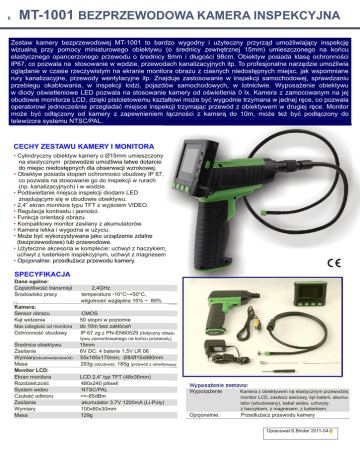 8 MT-1001 BEZPRZEWODOWA KAMERA INSPEKCYJNA Zestaw kamery bezprzewodowej MT-1001 to bardzo wygodny i użyteczny przyrząd umożliwiający inspekcję wizualną przy pomocy miniaturowego obiektywu (o średnicy zewnętrznej 15mm) umieszczonego na końcu elastycznego opancerzonego przewodu o średnicy 8mm i długości 98cm. Obiektyw posiada klasę ochronności IP67, co pozwala na stosowanie w wodzie, przewodach kanalizacyjnych itp. To profesjonalne narzędzie umożliwia oglądanie w czasie rzeczywistym na ekranie monitora obrazu z ciasnych niedostępnych miejsc, jak wspomniane rury kanalizacyjne, przewody wentylacyjne itp. Znajduje zastosowanie w inspekcji samochodowej, sprawdzaniu przebiegu okablowania, w inspekcji łodzi, pojazdów samochodowych, w lotnictwie. Wyposażenie obiektywu w diody oświetleniowe LED pozwala na stosowanie kamery od oświetlenia 0 lx. Kamera z zamocowanym na jej obudowie monitorze LCD, dzięki pistoletowemu kształtowi może być wygodnie trzymana w jednej ręce, co pozwala operatorowi jednocześnie przegladać miejsce inspekcji trzymając przewód z obiektywem w drugiej ręce. Monitor może być odłączony od kamery z zapewnieniem łączności z kamerą do 10m, może też być podłączony do telewizora systemu NTSC/PAL. CECHY ZESTAWU KAMERY I MONITORA • Cylindryczny obiektyw kamery o Ø15mm umieszczony na elastycznym przewodzie umożliwia łatwe dotarcie do miejsc niedostępnych dla obserwacji wzrokowej. • Obiektyw posiada stopień ochronności obudowy IP 67, co pozwala na stosowanie go do inspekcji w rurach (np. kanalizacyjnych) i w wodzie. • Podświetlanie miejsca inspekcji diodami LED znajdującymi się w obudowie obiektywu. • 2,4” ekran monitora typu TFT z wyjściem VIDEO. • Regulacja kontrastu i jasności. • Funkcja orientacji obrazu. • Kompaktowy monitor zasilany z akumulatorów. • Kamera lekka i wygodna w użyciu. • Może być wykorzystywana jako urządzenie zdalne (bezprzewodowe) lub przewodowe. • Użyteczne akcesoria w komplecie: uchwyt z haczykiem, uchwyt z lusterkiem inspekcyjnym, uchwyt z magnesem • Opcjonalnie: przedłużacz przewodu kamery. SPECYFIKACJA Dane ogólne: Częstotliwość transmisji Środowisko pracy Kamera: Sensor obrazu Kąt widzenia Max odległość od monitora Ochronność obudowy 2,4GHz temperatura -10°C~+50°C, wilgotność względna 15% ~ 85% CMOS 50 stopni w poziomie do 10m bez zakłóceń IP 67 zg z PN-EN60529 (dotyczny obiektywu zamontowanego na końcu przewodu) Średnica obiektywu Zasilanie Wymiary(obudowa/przewód) Masa Monitor LCD: Ekran monitora Rozdzielczość System wideo Czułość odbioru Zasilanie Wymiary Masa 15mm 6V DC: 4 baterie 1,5V LR 06 55x165x170mm; Ø8/Ø15x980mm 293g (obudowa); 185g (przewód z obiektywem) LCD 2,4” typ TFT (48x36mm) 480x240 pikseli NTSC/PAL <=-85dBm akumulator 3,7V 1200mA (Li-Poly) 100x80x30mm 129g Wyposażenie zestawu: Kamera z obiektywem na elastycznym przewodzie, Wyposażenie monitor LCD, zasilacz sieciowy, kpl baterii, akumulator (wbudowany), kabel wideo, uchwyty: z haczykiem, z magnesem, z lusterkiem. Opcjonalnie: Przedłużacz przewodu kamery Opracował S.Binder 2011-04-0