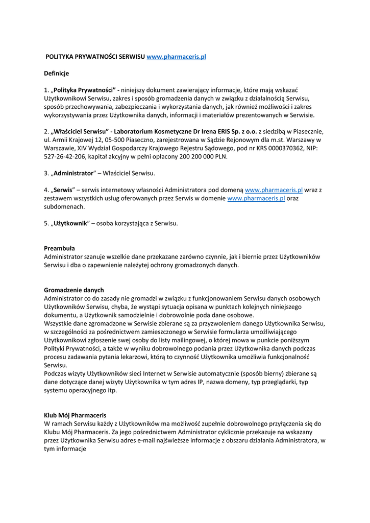 POLITYKA PRYWATNOŚCI SERWISU www.pharmaceris.pl Definicje 1. „Polityka Prywatności” - niniejszy dokument zawierający informacje, które mają wskazać Użytkownikowi Serwisu, zakres i sposób gromadzenia danych w związku z działalnością Serwisu, sposób przechowywania, zabezpieczania i wykorzystania danych, jak również możliwości i zakres wykorzystywania przez Użytkownika danych, informacji i materiałów prezentowanych w Serwisie. 2. „Właściciel Serwisu” - Laboratorium Kosmetyczne Dr Irena ERIS Sp. z o.o. z siedzibą w Piasecznie, ul. Armii Krajowej 12, 05-500 Piaseczno, zarejestrowana w Sądzie Rejonowym dla m.st. Warszawy w Warszawie, XIV Wydział Gospodarczy Krajowego Rejestru Sądowego, pod nr KRS 0000370362, NIP: 527-26-42-206, kapitał akcyjny w pełni opłacony 200 200 000 PLN. 3. „Administrator” – Właściciel Serwisu. 4. „Serwis” – serwis internetowy własności Administratora pod domeną www.pharmaceris.pl wraz z zestawem wszystkich usług oferowanych przez Serwis w domenie www.pharmaceris.pl oraz subdomenach. 5. „Użytkownik” – osoba korzystająca z Serwisu. Preambuła Administrator szanuje wszelkie dane przekazane zarówno czynnie, jak i biernie przez Użytkowników Serwisu i dba o zapewnienie należytej ochrony gromadzonych danych. Gromadzenie danych Administrator co do zasady nie gromadzi w związku z funkcjonowaniem Serwisu danych osobowych Użytkowników Serwisu, chyba, że wystąpi sytuacja opisana w punktach kolejnych niniejszego dokumentu, a Użytkownik samodzielnie i dobrowolnie poda dane osobowe. Wszystkie dane zgromadzone w Serwisie zbierane są za przyzwoleniem danego Użytkownika Serwisu, w szczególności za pośrednictwem zamieszczonego w Serwisie formularza umożliwiającego Użytkownikowi zgłoszenie swej osoby do listy mailingowej, o której mowa w punkcie poniższym Polityki Prywatności, a także w wyniku dobrowolnego podania przez Użytkownika danych podczas procesu zadawania pytania lekarzowi, którą to czynność Użytkownika umożliwia funkcjonalność Serwisu. Podczas wizyty Użytkowników sieci Internet w Serwisie automatycznie (sposób bierny) zbierane są dane dotyczące danej wizyty Użytkownika w tym adres IP, nazwa domeny, typ przeglądarki, typ systemu operacyjnego itp. Klub Mój Pharmaceris W ramach Serwisu każdy z Użytkowników ma możliwość zupełnie dobrowolnego przyłączenia się do Klubu Mój Pharmaceris. Za jego pośrednictwem Administrator cyklicznie przekazuje na wskazany przez Użytkownika Serwisu adres e-mail najświeższe informacje z obszaru działania Administratora, w tym informacje o produktach i usługach Administratora, zmianach rynkowych, organizowanych konkursach, nowościach, możliwości testowania produktów. Rezygnacja z udziału w Klubie Mój Pharmaceris Każdy z Użytkowników, który dokonał uprzedniego zgłoszenia swej osoby do Mój Pharmaceris, może w każdej chwili można zrezygnować z przynależności do klubu, zgodnie z podanymi instrukcjami rezygnacji dostępnymi w sekcji Klubu. Użytkownik Klubu, który nie będzie chciał otrzymywać bieżących informacji w postaci newsletterów wysłanych przez Administratora, winien skontaktować się z Administratorem bądź też skorzystać z opcji rezygnacji z newslettera, dostępnej przy każdym otrzymanym newsletterze. W razie skutecznej rezygnacji z przynależności do listy mailingowej adres e-mail danego rezygnującego Użytkownika Serwisu zostanie trwale usunięty z bazy odbiorców listów elektronicznych rozsyłanych przez Administratora. Zabezpieczenie danych Administrator dba o bezpieczeństwo udostępnionych danych, w szczególności przed dostępem osób nieupoważnionych. Administrator zapewnia wszystkim Użytkownikom realizację uprawnień wynikających z ustawy z dnia 29 sierpnia 1997 roku o ochronie danych osobowych (Dz.U. nr 133, pozycja 883), w szczególności prawo wglądu do własnych danych, prawo żądania aktualizacji i usunięcia danych oraz prawo wniesienia sprzeciwu w przypadkach określonych w przepisach tej ustawy. Administrator dba o takie administracyjne, techniczne i fizyczne zabezpieczenia by nie umożliwiać dostępu do danych osobom nieuprawnionym i chronić je przed nieuprawnionym zabraniem, zniszczeniem czy zmianą. Sposób wykorzystywania danych Dane zbierane automatycznie mogą być użyte do analizy zachowań Użytkowników w Serwisie, zbierania danych demograficznych o Użytkownikach Serwisu, lub do personalizacji zawartości Serwisu. Dane podane przez Użytkownika na skutek zgłoszenia swej osoby Klubu Mój Pharmaceris przez Użytkownika są wykorzystywane w celu cyklicznego przekazywania na wskazany przez Użytkownika adres email newslettera. Zgromadzone dane Użytkownika mogą być także wykorzystane do ich udostępnienia uprawnionym organom, w szczególności organom wymiaru sprawiedliwości, w przypadku uzasadnionego przypuszczenia popełnienia przez Użytkownika przestępstwa w Serwisie, a także na wniosek uprawnionych organów zgodnie z obowiązującym stanem prawnym. Przekazywanie danych Administrator nie sprzedaje zgromadzonych danych żadnym osobom trzecim. Administrator nie przekazuje zgromadzonych danych żadnym osobom trzecim, z wyłączeniem przypadku, gdy takie przekazanie jest konieczne ze względu na uregulowania prawne (na wniosek uprawnionych organów państwowych) lub też w przypadku, gdy osoba trzecia została zaangażowana przez Administratora do zrealizowania w imieniu Administratora usługi pozostającej w związku z funkcjonowaniem Serwisu, przy czym taka osoba trzecia nie zostanie przez Administratora upoważniona do wykorzystania ujawnionych jej danych poza zakres wymagany dla realizacji przedmiotowej usługi. W żadnym razie Administrator nie udostępnia danych osobowych i adresów e-mail Użytkowników Serwisu żadnym innym podmiotom gospodarczym w celu osiągania korzyści materialnych. Wykorzystywanie cookies Serwis może wykorzystywać „cookies” 