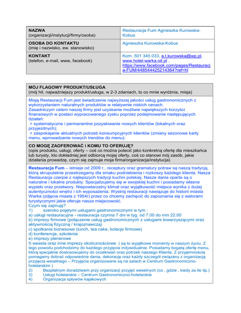 NAZWA (organizacji/instytucji/firmy/osoba) Restauracja Fum Agnieszka KurowskaKobus OSOBA DO KONTAKTU (imię i nazwisko, ew. stanowisko) Agnieszka Kurowska-Kobus KONTAKT (telefon, e-mail, www, facebook) Kom. 501 345 033, [email protected], www.hotel-warka.oit.pl , https://www.facebook.com/pages/Restauracj a-FUM/448544425214364?ref=hl MÓJ FLAGOWY PRODUKT/USŁUGA (mój hit, najważniejszy produkt/usługa, w 2-3 zdaniach, to co mnie wyróżnia, misja) Misją Restauracji Fum jest świadczenie najwyższej jakości usług gastronomicznych z wykorzystaniem naturalnych produktów w relatywnie niskich cenach. Zasadniczym celem naszej firmy jest uzyskanie możliwie największych korzyści finansowych w postaci wypracowanego zysku poprzez podejmowanie następujących działań: > systematyczne i permanentne pozyskiwanie nowych klientów (lokalnych oraz przyjezdnych); > zaspokajanie aktualnych potrzeb konsumpcyjnych klientów (zmiany sezonowe karty menu, wprowadzanie nowych trendów do menu); CO MOGĘ ZAOFEROWAĆ i KOMU TO OFERUJĘ? (opis produktu, usługi, oferty – coś co można polecić jako konkretną ofertę dla mieszkańca lub turysty, kto dokładniej jest odbiorcą mojej oferty, coś co stanowi mój zasób, jakie działania prowadzę, czym się zajmuje moja firma/organizacja/instytucja) Restauracja Fum – istnieje od 2009 r., receptury oraz gramatury potraw są naszą tradycją, którą skrupulatnie przestrzegamy dla smaku podniebienia i rozkoszy każdego klienta. Nasza Restauracja czerpie z najlepszych tradycji kuchni polskiej. Nasze dania oparte są o naturalne i lokalne produkty. Specjalizujemy się w swojskiej kuchni i posiadamy własne wypieki oraz przetwory. Niepowtarzalny klimat oraz wyjątkowość miejsca wynika z dużej autentyczności wnętrz i ich wyposażenia. Wystrój restauracji nawiązuje do historii miasta Warka (zdjęcia miasta z 1954r) przez co chcemy zachęcić do zapoznania się z walorami turystycznymi jakie oferuje nasza miejscowość. Czym się zajmuję? 1) szeroko pojętymi usługami gastronomicznymi w tym : a) usługi restauracyjne - restauracja czynna 7 dni w tyg. od 7.00 do min 22.00 b) imprezy firmowe (połączenie usług gastronomicznych z usługami towarzyszącymi oraz aktywnością fizyczną / krajoznawczą) c) spotkania biznesowe (lunch, tea cake, kolacje firmowe) d) konferencje, szkolenia e) imprezy plenerowe f) wesela oraz inne imprezy okolicznościowe ( są to wyjątkowe momenty w naszym życiu. Z tego powodu podchodzimy do każdego przyjęcia indywidualnie. Posiadamy bogatą ofertę menu, którą specjalnie dostosowujemy do oczekiwań oraz potrzeb naszego Klienta. Z przyjemnością pomagamy dobrać odpowiednie dania, dekorację oraz każdy szczegół związany z organizacją przyjęcia weselnego – Przyjęcia organizowane są na salach w Centrum Gastronomicznohotelarskim ) 2) Bezpłatnym doradztwem przy organizacji przyjęć weselnych (co , gdzie , kiedy za ile itp.) 3) Usługi hotelarskie – Centrum Gastronomiczno-hotelarskie 4) Organizacja spływów kajakowych MOJE ZASOBY (czym mogę się podzielić, co mogę oferować w ramach współpracy, co mogę użyczyć w ramach współpracy np. umiejętności, doświadczenie, zasoby lokalowe/techniczne) Możemy zaoferować: o Sale do organizacji eventów , konferencji o wiedzę i umiejętności z zakresu organizacji imprez o wiedzę i umiejętności z zakresu usług turystycznych o wiedzę z zakresu ZZL oraz HCCP o ręce chętne do współpracy (posiadam uprawnienia do opieki nad grupami dziecięcymi i młodzieżowymi, uprawnienia pedagogiczne, umiejętności manualne O CZYM MYŚLĘ, CO PLANUJĘ? (konkretne plany na ten rok/najbliższe tygodnie o których chcę aby inni się dowiedzieli, plany dalsze lub pomysły które chcę realizować, kalendarz imprez stałych i jednorazowych) Plany: > Targi ślubne (jesień/zima 2013r) > Urodziny Restauracji Fum (listopad 2013r) > Impreza Sylwestrowa > stworzenie usług kompleksowych (pakietów wycieczek komplementarnych) W CZYM POTRZEBUJĘ POMOCY? (jakiej pomocy potrzebuję, czego mi brakuje, jakich partnerów poszukuję, jak chcę uzupełnić swoją ofertę) Potrzebuję pomocy: > w tworzeniu pakietów wycieczek oraz ich promocji > Promocji firmy np. na facebooku , identyfikacja marki, promocja jakościowa > w zbudowaniu zaufania do firmy DZIAŁANIA PROMOCYJNE (jakie prowadziłem do tej pory działania promocyjne, dobre praktyki, planowane działania) Do tej pory: > plakaty reklamowe, ulotki (w zeszłym roku) > stworzyliśmy profil na facebooku > reklama banerowa przy restauracji oraz baner przy drodze 50m od lokalu > Reklama na sklepie Spozywczym u Kurowskich :) > Uczestniczenie w charytatywnych eventach (agappy, wigilie itp.) >wspólna strona www z częścią hotelową www.hotel-warka.oit.pl Planujemy > zorganizować targi ślubne połączone z promocją firmy (rabaty dla Młodych Par, degustacja potraw itp.) > stworzyć folder reklamowy całej firmy połączony z promocją regionu (Centrum Gastronomiczno-hotelarskie + Restauracja FUM oraz walory turystyczne miasta ) KONTAKTY (z kim warto skontaktować się przed kolejnym spotkaniem, moi sprawdzeni partnerzy, ciekawe kontakty, które mogą być pomocne przy podejmowaniu wspólnych działań, inne osoby do kontaktu z mojej firmy/organizacji i ich wyjątkowe kompetencje)