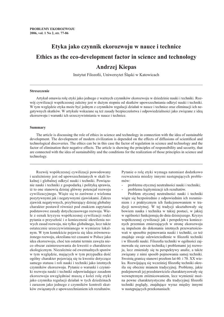 PROBLEMY EKOROZWOJU 2006, vol. 1 No 2, str. 77-86 Etyka jako czynnik ekorozwoju w nauce i technice Ethics as the eco-development factor in science and technology Andrzej Kiepas Instytut Filozofii, Uniwersytet Śląski w Katowicach Streszczenie Artykuł omawia rolę etyki jako jednego z ważnych czynników ekorozwoju w dziedzinie nauki i techniki. Rozwój cywilizacji współczesnej zależny jest w dużym stopniu od skutków upowszechniania odkryć nauki i techniki. W tym względzie etyka może być jednym z czynników regulacji działań w nauce i technice oraz eliminacji ich negatywnych skutków. W artykule wskazane są też zasady bezpieczeństwa i odpowiedzialności jako związane z ideą ekorozwoju i warunki ich urzeczywistniania w nauce i technice. Summary The article is discussing the role of ethics in science and technology in connection with the idea of sustainable development. The development of modern civilization is depended on the effects of diffusions of scientifical and technological discoveries. The ethics can be in this case the factor of regulation in science and technology and the factor of elimination their negative effects. The article is showing the principles of responsibility and security, that are connected with the idea of sustainability and the conditions for the realization of those principles in science and technology. Rozwój współczesnej cywilizacji powodowany i uzależniony jest od upowszechnianych w skali lokalnej i globalnej odkryć nauki i techniki. Powiązanie nauki i techniki z gospodarką i polityką sprawia, iż to one stanowią dzisiaj główny potencjał rozwoju cywilizacyjnego. Wiąże się to zarówno z wieloma pozytywnymi jak i negatywnymi zjawiskami. Zakres zjawisk negatywnych, przybierający dzisiaj globalny charakter postawił również pod znakiem zapytania podstawowe zasady dotychczasowego rozwoju. Wiele z oznak kryzysu współczesnej cywilizacji rodzi pytania o przyszłość i o konieczność określenia nowych zasad rozwoju, nie tylko globalnego, lecz także ostatecznie urzeczywistnianego w wymiarze lokalnym. W tym kontekście pojawia się idea zrównoważonego rozwoju, określana też czasami w Polsce jako idea ekorozwoju, choć ten ostatni termin zawęża nieco obszar zainteresowania do kwestii o charakterze ekologicznym. Niezależnie od ewentualnych sporów w tym względzie, mających w tym przypadku dość ogólny charakter pojawiają się tu kwestie dotyczące samego statusu i roli nauki i techniki jako istotnych czynników ekorozwoju. Pytanie o warunki i czynniki rozwoju nauki i techniki odpowiadające zasadom ekorozwoju uwzględniać muszą z kolei rolę etyki jako czynnika regulacji działań w tych dziedzinach i zarazem jako jednego z czynników kontroli skutków związanych z upowszechnianiem ich rezultatów. Pytanie o rolę etyki wymaga natomiast dodatkowo rozważenia miedzy innymi następujących problemów: - problemu etycznej neutralności nauki i techniki; - problemu legitymizacji ich rezultatów. Problem etycznej neutralności nauki i techniki wiąże się bezpośrednio z odpowiednim ich rozumieniem i z praktycznym ich funkcjonowaniem w tradycji nowożytnej. W tej tradycji ukształtowały się bowiem nauka i technika w takiej postaci, w jakiej w ogólności funkcjonują do dnia dzisiejszego. Kryzys współczesnej cywilizacji jak i perspektywa koniecznych przemian zmierzających w stronę ekorozwoju są impulsem do dokonania istotnych przewartościowań w sposobie pojmowania nauki i techniki, co też znajduje swoje odzwierciedlenie w filozofii techniki i w filozofii nauki. Filozofia techniki w ogólności zajmowała się zawsze techniką i problemami jej rozwoju, lecz zmieniały się tu perspektywy analiz, a także związany z nimi sposób pojmowania samej techniki. Swoistą granicę stanowi przełom lat 60. i 70. XX wieku. Rozwijającą się wcześniej filozofię techniki określa się obecnie mianem tradycyjnej. Problemy, jakie podejmowali jej przedstawiciele charakteryzowały się wewnętrznym zróżnicowaniem, lecz wymienić można pewne charakterystyczne dla tradycyjnej filozofii techniki poglądy, znajdujące wyraz między innymi w następujących przekonaniach: 78 Andrzej Kiepas/Problemy Ekorozwoju nr 2 (2006), 77-86 problemy filozofii koncentrowały się wokół pytania o istotę techniki, co wiązało się ponadto z odpowiednim sposobem rozumienia i analizy pojęcia techniki; - relację pomiędzy techniką a kulturą postrzegano w kontekście jej pozytywnych bądź negatywnych wpływów; technikę traktowano albo jako dobrodziejstwo, albo też jako zagrożenie dla rozwoju kultury; - przyjmowano apologetyczną fikcję, zgodnie z którą uznaje się „niewinność” środków technicznych, co w konsekwencji także stanowiło podstawę dla technokratycznej mistyfikacji uznającej technikę za autonomiczny i samokorygujący się system, rządzący się jedynie swoimi wewnętrznymi prawami i wewnętrzną logiką rozwoju; technika była także wyraźnie oddzielana od nauki i naukowego poznania, a właściwy tradycyjnej filozofii nauki scjentyzm znajdował dopełnienie w towarzyszących mu przekonaniach technokratycznych1. Tradycyjna filozofia techniki miała w dużym stopniu spekulatywny charakter z uwagi na to, iż często abstrahowała od istotnych aspektów i problemów związanych z rozwojem techniki. Przełom lat 60. i 70. wiąże się natomiast z tzw. „zwrotem normatywnym” i z istotną zmianą w sposobie pojmowania samej techniki. Wyraźne zmiany dają się zauważyć także w sposobie pojmowania relacji między człowiekiem a techniką. Najnowsza filozofia techniki inaczej aniżeli tradycyjna problematyzuje tę relację i w konsekwencji też odmiennie od tradycyjnej pojmuje technikę i ocenia jej rolę. Tradycyjna filozofia techniki była w gruncie rzeczy antropologią techniki, ponieważ korzeni techniki i czynników jej przemian poszukiwała w naturze ludzkiej. Dlatego też technikę uważano za „przed
