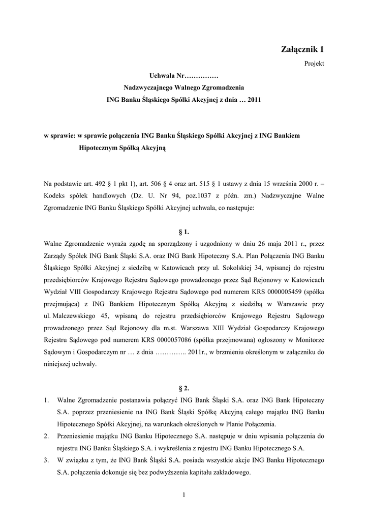 Załącznik 1 Projekt Uchwała Nr…………… Nadzwyczajnego Walnego Zgromadzenia ING Banku Śląskiego Spółki Akcyjnej z dnia … 2011 w sprawie: w sprawie połączenia ING Banku Śląskiego Spółki Akcyjnej z ING Bankiem Hipotecznym Spółką Akcyjną Na podstawie art. 492 § 1 pkt 1), art. 506 § 4 oraz art. 515 § 1 ustawy z dnia 15 września 2000 r. – Kodeks spółek handlowych (Dz. U. Nr 94, poz.1037 z późn. zm.) Nadzwyczajne Walne Zgromadzenie ING Banku Śląskiego Spółki Akcyjnej uchwala, co następuje: § 1. Walne Zgromadzenie wyraża zgodę na sporządzony i uzgodniony w dniu 26 maja 2011 r., przez Zarządy Spółek ING Bank Śląski S.A. oraz ING Bank Hipoteczny S.A. Plan Połączenia ING Banku Śląskiego Spółki Akcyjnej z siedzibą w Katowicach przy ul. Sokolskiej 34, wpisanej do rejestru przedsiębiorców Krajowego Rejestru Sądowego prowadzonego przez Sąd Rejonowy w Katowicach Wydział VIII Gospodarczy Krajowego Rejestru Sądowego pod numerem KRS 0000005459 (spółka przejmująca) z ING Bankiem Hipotecznym Spółką Akcyjną z siedzibą w Warszawie przy ul. Malczewskiego 45, wpisaną do rejestru przedsiębiorców Krajowego Rejestru Sądowego prowadzonego przez Sąd Rejonowy dla m.st. Warszawa XIII Wydział Gospodarczy Krajowego Rejestru Sądowego pod numerem KRS 0000057086 (spółka przejmowana) ogłoszony w Monitorze Sądowym i Gospodarczym nr … z dnia ………….. 2011r., w brzmieniu określonym w załączniku do niniejszej uchwały. § 2. 1. Walne Zgromadzenie postanawia połączyć ING Bank Śląski S.A. oraz ING Bank Hipoteczny S.A. poprzez przeniesienie na ING Bank Śląski Spółkę Akcyjną całego majątku ING Banku Hipotecznego Spółki Akcyjnej, na warunkach określonych w Planie Połączenia. 2. Przeniesienie majątku ING Banku Hipotecznego S.A. następuje w dniu wpisania połączenia do rejestru ING Banku Śląskiego S.A. i wykreślenia z rejestru ING Banku Hipotecznego S.A. 3. W związku z tym, że ING Bank Śląski S.A. posiada wszystkie akcje ING Banku Hipotecznego S.A. połączenia dokonuje się bez podwyższenia kapitału zakładowego. 1 § 3. Walne Zgromadzenie zobowiązuje Zarząd ING Banku Śląskiego S.A. do dokonania wszelkich czynności koniecznych dla prawidłowego wykonania postanowień niniejszej a w szczególności do zgłoszenia do Krajowego Rejestru Sądowego połączenia spółek. 2 uchwały, Załącznik 2 Projekt Uchwała Nr…………… Nadzwyczajnego Walnego Zgromadzenia ING Banku Hipotecznego Spółki Akcyjnej z dnia … 2011 w sprawie: w sprawie połączenia ING Banku Hipotecznego Spółką Akcyjną ze ING Bank Śląski Spółką Akcyjną. Na podstawie art. 492 § 1 pkt 1), art. 506 § 4 oraz art. 515 § 1 ustawy z dnia 15 września 2000 r. – Kodeks spółek handlowych (Dz. U. Nr 94, poz.1037 z późn. zm.) Nadzwyczajne Walne Zgromadzenie ING Banku Hipotecznego Spółki Akcyjnej uchwala co następuje: § 1. Walne Zgromadzenie wyraża zgodę na sporządzony i uzgodniony w dniu 26 maja 2011 r., przez Zarządy Spółek ING Bank Śląski S.A. oraz ING Bank Hipoteczny S.A. Plan Połączenia spółki ING Bank Śląski Spółki Akcyjnej z siedzibą w Katowicach przy ul. Sokolskiej 34, wpisanej do rejestru przedsiębiorców Krajowego Rejestru Sądowego prowadzonego przez Sąd Rejonowy w Katowicach Wydział VIII Gospodarczy Krajowego Rejestru Sądowego pod numerem KRS 0000005459 (spółka przejmująca) ze ING Bank Hipoteczny Spółką Akcyjną z siedzibą w Warszawie przy ul. Malczewskiego 45, wpisaną do rejestru przedsiębiorców Krajowego Rejestru Sądowego prowadzonego przez Sąd Rejonowy dla m.st. Warszawa XIII Wydział Gospodarczy Krajowego Rejestru Sądowego pod numerem KRS 0000057086 (spółka przejmowana) ogłoszony w Monitorze Sądowym i Gospodarczym nr … z dnia ………….. 2011r., w brzmieniu określonym w załączniku do niniejszej uchwały. § 2. 1. Walne Zgromadzenie postanawia połączyć spółki ING Bank Hipoteczny S.A. oraz ING Bank Śląski S.A. poprzez przeniesienie na ING Bank Śląski Spółkę Akcyjną całego majątku spółki ING Banku Hipotecznego Spółki Akcyjnej, na warunkach określonych w Planie Połączenia. 2. Przeniesienie majątku ING Banku Hipotecznego S.A. następuje w dniu wpisania połączenia do rejestru ING Banku Śląskiego S.A. i wykreślenia z rejestru ING Banku Hipotecznego S.A. 3 3. W związku z tym, że ING Bank Śląski S.A. posiada wszystkie akcje ING Banku Hipotecznego S.A. połączenia dokonuje się bez podwyższenia kapitału zakładowego. § 3. Walne Zgromadzenie zobowiązuje Zarząd ING Banku Hipotecznego S.A. do dokonania wszelkich czynności koniecznych dla prawidłowego wykonania postanowień niniejszej a w szczególności do zgłoszenia do Krajowego Rejestru Sądowego połączenia spółek. 4 uchwały, Załącznik 3 Wycena wartości majątku spółki ING Bank Hipoteczny Spółka Akcyjna, W związku z łączeniem spółki ING Bank Śląski S.A. (Spółka dominująca) ze spółką ING Bank Hipoteczny S.A. (Spółka zależna) niezbędne jest ustalenie wartości majątku spółki zależnej w celu prawidłowego rozliczenia połączenia spółek. Jednostka dominująca sporządza sprawozdania finansowe zgodnie z Międzynarodowymi Standardami Sprawozdawczości Finansowej zatwierdzonymi do stosowania w UE („MSSF”). Rozważane połączenie prawne pomiędzy jednostką dominującą i jednostką zależną stanowi transakcję pod wspólną kontrolą. MSSF, co do zasady, nie regulują rozliczania tego typu transakcji. Dlatego też w odniesieniu do rozliczenia analizowanego połączenia prawnego spółki dominującej ze spółką zależną możliwe jest zastosowanie m.in. metody łączenia udziałów. Wybór tej opcji stanowi wybór polityki rachunkowości, który powinien być spójnie i konsekwentnie stosowany przez podmiot przejmujący w odniesieniu do wszystkich tego typu transakcji oraz odpowiednio w sprawozdaniu finansowym tej jednostki ujawniony. Rozliczenie połącz