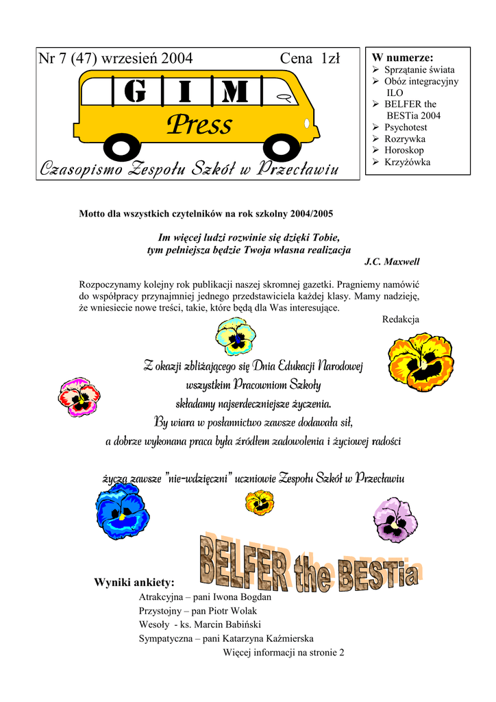 Nr 7 (47) wrzesień 2004 Cena 1zł Czasopismo Zespołu Szkół w Prz e cławiu W numerze: Sprzątanie świata Obóz integracyjny ILO BELFER the BESTia 2004 Psychotest Rozrywka Horoskop KrzyŜówka Motto dla wszystkich czytelników na rok szkolny 2004/2005 Im więcej ludzi rozwinie się dzięki Tobie, tym pełniejsza będzie Twoja własna realizacja J.C. Maxwell Rozpoczynamy kolejny rok publikacji naszej skromnej gazetki. Pragniemy namówić do współpracy przynajmniej jednego przedstawiciela kaŜdej klasy. Mamy nadzieję, Ŝe wniesiecie nowe treści, takie, które będą dla Was interesujące. Redakcja Z okazji zbliżającego się Dnia Edukacji Narodowej Pracowniom wszystkim Pracownio m Szkoły składamy najserdeczniejsze życzenia. By wiara w posłannictwo zawsze dodawała sił, a dobrze wykonana praca była źródłem zadowolenia i życiowej radości życzą zawsze ”nie”nie-wdzięczni” uczniowie Zespołu Szkół w Przecławiu Wyniki ankiety: Atrakcyjna – pani Iwona Bogdan Przystojny – pan Piotr Wolak Wesoły - ks. Marcin Babiński Sympatyczna – pani Katarzyna Kaźmierska Więcej informacji na stronie 2 Czasopismo Zespołu Szkół w Przecławiu Str. 2 Sprzątanie świata 20 września bieŜącego roku uczniowie Zespołu Szkół w Przecławiu wzięli udział w corocznej akcji Sprzątania Świata. Ma ona na celu posprzątanie naszego najbliŜszego otoczenia i zwrócenie uwagi na to, jak waŜna jest ochrona środowiska. W tym przedsięwzięciu wzięli udział uczniowie klas: I a i d, II a, b, c, d, f i g, a takŜe I i II LO, którzy pracowali pod opieką nauczycieli. Śmiecie pozbierano z: ul. Zielonej i Ogrodowej, a takŜe z placu zabaw, otoczenia szkoły i zamku, jak równieŜ drogi prowadzącej na stadion. Łącznie zebrano 16 worków śmieci i odpadków. Mamy nadzieję, Ŝe uczniowie naszej szkoły będą szanować pracę swoich kolegów poprzez wyrzucanie śmieci do kosza, a nie na ziemię. ADA i AGA OBÓZ INTEGRACYJNY KLASY I LO W dniach 13-15 września odbył się obóz integracyjny klasy I LO, na który uczniowie pojechali wraz z wychowawczynią panią mgr Alfredą NaleŜną oraz panią mgr Ewą Licealiści Arciszewską. spędzili te dni w Jałowcach, ucząc się i świetnie bawiąc. Głównym celem obozu było nawiązanie relacji ze swoimi kolegami z klasy licealnej. W końcu będą ze sobą współpracować przez trzy lata i musza się dobrze poznać. Pierwszego dnia radosne nastąpiło rozpakowywanie się i przydział domków. Późnym południem odbyły się zajęcia z panią Małgorzatą Boraczyńską. Były to zajęcia głównie rozwijające logiczne myślenie, na których uczniowie dowiadywali się jak się uczyć i ćwiczyć swą pamięć. Wieczorem kaŜdy miał czas wolny i spędzał go według własnych upodobań. Rano, po śniadaniu wszyscy udawali się na zajęcia z języka polskiego, na których trzeba było wykazać się umiejętnością opowiadania. Następnie nadszedł czas matematyki. Później chwila odpoczynku przed zajęciami z panią Małgorzatą. Dla wielu był to odpowiedni moment na podszkolenie swoich umiejętności w pływaniu rowerem wodnym, a takŜe łódką. Wieczorem, w czasie ogniska odwiedziła nas pani w-ce dyrektor mgr Joanna Remiszewska w towarzystwie pana mgr. inŜ. Zenona NaleŜnego. W środę tuŜ po śniadaniu nastąpiło radosne wręczanie listów, które kaŜdy miał napisać do wylosowanej przez siebie osoby. List miał zawierać wiele ciepłych i zachęcających słów, jednak naleŜało go napisać po uprzednim zapoznaniu się z tą koleŜanką bądź kolegą. Po poŜegnalnym obiedzie wszyscy bardzo radośni, a jednocześnie smutni, Ŝe ten czas tak szybko minął, udali się do szkolnego gimbusu i odjechali pełni nadziei, Ŝe wrócą tam jeszcze niejeden raz. k@ta W tym roku nasz Zespół Szkół bierze udział w IV edycji Miejskiej Uroczystości BELFER the Bestia. Jest to okazja, aby w oryginalny sposób docenić pedagogów. O planie i organizacji tego przedsięwzięcia nasz samorząd szkolny dowiedział się na spotkaniu informacyjnym w Gimnazjum nr 4 w Mielcu. 23 września Krzysztof Leski i Wojciech Majka razem z panią mgr Iwoną Bogdan poznali zasady organizacyjne imprezy. Aby jednak brać udział w tym plebiscycie, kaŜda szkoła musi wytypować swoich nauczycieli w poszczególnych kategoriach. W związku z tym, we wtorek 28 września odbyła się ankieta wśród uczniów klas drugich, trzecich GIMPRESS 7 (47) wrzesień 2004 Czasopismo Zespołu Szkół w Przecławiu Str. 3 i liceum. Głosowali oni w czterech kategoriach: atrakcyjna nauczycielka, przystojny nauczyciel, wesoły lub wesoła nauczyciel / nauczycielka i sympatyczny lub sympatyczna nauczyciel / nauczycielka. W pierwszej kategorii wygrała pani mgr Iwona Bogdan przed panią mgr Anną Mordasiewicz i panią mgr Beatą Mazur. W następnej kategorii bezkonkurencyjny okazał się pan mgr Piotr Wolak, który wyprzedził pana mgr. Rafała Chęćka i pana mgr. Stanisława Wilczyńskiego. Najweselszym nauczycielem został ks. Marcin Babiński, a dalsze miejsca zajęli: pani mgr Katarzyna Matejczyk i pani mgr Teresa Ciejka. Najbardziej wyrównane wyniki były w czwartej kategorii. RóŜnice w czołówce były minimalne. ZwycięŜyła w niej pani mgr Katarzyna Kaźmierska. Zaraz za nią uplasowali się: pan mgr Piotr Wolak i pani mgr Katarzyna Matejczyk. Teraz przedstawicieli samorządu czeka przygotowanie prezentacji wybranych przez uczniów nauczycieli, by materiały dostarczyć do gimnazjum w Mielcu, gdyŜ tam jury wyłoni zwycięzców, którzy otrzymają pamiątkowe statuetki. Opracował: Krzysztof Leski Nie taki diabeł straszny jak go malują „Kici, kici, kici, ...”, tak zostali przywitani. Mowa tu o pierwszoklasistach, równieŜ tych gimnazjum, którzy licznie przybyli w tym roku do naszej przemiłej, i przesympatycznej prześlicznej „budy”. Większość „Kotów” z liceum chodziło juŜ do naszej szkoły. Co innego najmłodsi koledzy i koleŜanki z pi