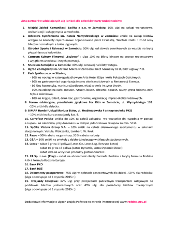 Lista partnerów udzielających ulg i zniżek dla członków Karty Dużej Rodziny: 1. Miejski Zakład Komunikacji Spółka z o.o. w Zamościu: 10% ulgi na usługi warsztatowe, wulkanizacji i usługę mycia samochodu. 2. Orkiestra Symfoniczna im. Karola Namysłowskiego w Zamościu: zniżki na zakup biletów wstępu na koncerty repertuarowe organizowane przez Orkiestrę. Wartość zniżki 5 zł od ceny biletów normalnych a także ulgowych. 3. Ośrodek Sportu i Rekreacji w Zamościu: 50% ulgi od stawek cennikowych za wejście na krytą pływalnię oraz lodowisko. 4. Centrum Kultury Filmowej „Stylowy” : ulga 10% na bilety kinowe na seanse repertuarowe z wyjątkiem wtorków i innych promocji. 5. Muzeum Zamojskie w Zamościu: 40% ulgi cenowej na bilety wstępu. 6. Ogród Zoologiczny im. Stefana Milera w Zamościu: bilet normalny 10 zł, bilet ulgowy 7 zł. 7. Park Spółka z o.o. w Sitańcu; - 10% na noclegi w czterogwiazdkowym Artis Hotel &Spa i Artis Pokojach Gościnnych, - 10% na gastronomię i organizację imprez okolicznościowych w Restauracji Esencja, - 10 %na kosmetykę, manicure/pedicure, wizaż w Artis Instytut Urody, - 10% na zabiegi na ciało, masaże, rytuały, basen, siłownia, squash, sauny, grota śnieżna, mini tężnia solankowa, - 10% na kręgle, bilard, drink-bar, gastronomię, organizację imprez okolicznościowych. 8. Forum edukacyjne, przedszkole językowe For Kids w Zamościu, ul. Wyszyńskiego 102: -20% zniżki dla dziecka. 9. BIMAR Handel-Usługi Mariusz Bizior, ul. Hrubieszowska 4 a (naprzeciwko PKS) - 10% zniżki na kurs prawa jazdy kat. B. 10. Carrefour Polska- zniżka do 10% za całość zakupów we wszystkie dni tygodnia w postaci e-kuponu na okaziciela, przy dokonaniu w sklepie jednorazowo zakupów za min. 50 zł. 11. Spółka Vistula Group S.A. – 10% zniżki na całość oferowanego asortymentu w salonach stacjonarnych: Vistula, Wólczanka, Lambert, W. Kruk. 12. Pawo – 50% rabatu na garnitury, 30 % rabatu na buty. 13. C&A – 10% zniżki na artykuły z działu dziecięcego w sklepach stacjonarnych. 14. Lotos – rabat 5 gr na 1 l paliwa (Lotos On, Lotos Lpg, Benzyna Lotos) rabat 10 gr na 1 l paliwa (Lotos Dynamic, Lotos Dynamic Diesel) rabat 20% na wszystkie produkty gastronomiczne. 15. P4 Sp. z o.o. (Play) – rabat na abonament oferty Formuła Rodzina z taryfą Formuła Rodzina 4.0+ i Formuła Rodzina Europa. 16. Bank PKO 17. Bank BOŚ 18. Dokumenty paszportowe- 75% ulgi w opłatach paszportowych dla dzieci , 50 % dla rodziców. (ulga obowiązuje od 1 stycznia 2015 r.) 19. Przejazdy kolejowe: 37% ulgi przy przejazdach publicznym transportem kolejowym na podstawie biletów jednorazowych oraz 49% ulgi dla posiadaczy biletów miesięcznych (ulga obowiązuje od 1 stycznia 2015 r.) Dodatkowe informacje o ulgach znajdą Państwo na stronie internetowej www.rodzina.gov.pl