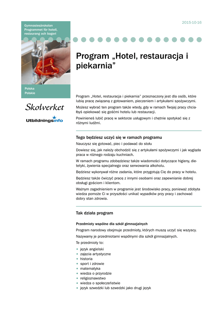 2015-10-16 Gymnasiesärskolan Programmet för hotell, restaurang och bageri Program „Hotel, restauracja i piekarnia” Polska Polskie Program „Hotel, restauracja i piekarnia” przeznaczony jest dla osób, które lubią pracę związaną z gotowaniem, pieczeniem i artykułami spożywczymi. Możesz wybrać ten program także wtedy, gdy w ramach Twojej pracy chciałbyś opiekować się gośćmi hotelu lub restauracji. Powinieneś lubić pracę w sektorze usługowym i chętnie spotykać się z różnymi ludźmi. Tego będziesz uczyć się w ramach programu Nauczysz się gotować, piec i podawać do stołu Dowiesz się, jak należy obchodzić się z artykułami spożywczymi i jak wygląda praca w różnego rodzaju kuchniach. W ramach programu zdobędziesz także wiadomości dotyczące higieny, dietetyki, żywienia specjalnego oraz serwowania alkoholu. Będziesz wykonywał różne zadania, które przygotują Cię do pracy w hotelu. Będziesz także ćwiczyć pracę z innymi osobami oraz zapewnianie dobrej obsługi gościom i klientom. Ważnym zagadnieniem w programie jest środowisko pracy, ponieważ zdobyta wiedza pomoże Ci w przyszłości unikać wypadków przy pracy i zachować dobry stan zdrowia. Tak działa program Przedmioty wspólne dla szkół gimnazjalnych Program narodowy obejmuje przedmioty, których muszą uczyć się wszyscy. Nazywamy je przedmiotami wspólnymi dla szkół gimnazjalnych. Te przedmioty to: • język angielski • zajęcia artystyczne • historia • sport i zdrowie • matematyka • wiedza o przyrodzie • religioznawstwo • wiedza o społeczeństwie • język szwedzki lub szwedzki jako drugi język Gymnasiesärskolan Programmet för hotell, restaurang och bageri Polska Polskie Wspólne przedmioty programowe W programie znajdują się przedmioty zawodowe lub przedmioty charakterystyczne, które określamy jako wspólne przedmioty programowe. Wszyscy uczniowie programu „Hotel, restauracja i piekarnia” muszą uczyć się tych przedmiotów, a są to: • piekarnia i cukiernia • hotel • wiedza o żywności i żywieniu • wiedza o posiłkach i gastronomii • serwis i obsługa. Pogłębienie programowe Będziesz uczyć się także innych przedmiotów, dzięki którym zdobędziesz dodatkową wiedzę w wybranej przez siebie dziedzinie. Przedmioty te określamy jako pogłębienie programowe. Ponieważ w ramach pogłębienia programowego różne szkoły oferują różne przedmioty, możesz skontaktować się ze szkołą, w której zamierzasz się uczyć i zapytać, co obejmuje pogłębienie programowe w tej szkole. Więcej o pogłębieniu programowym możesz przeczytać na stronie www. skolverket.se, w zakładce Przedszkole i szkoła (Förskola och skola). Indywidualny wybór Dokonujesz także indywidualnego wyboru. Możesz samemu wybrać kilka przedmiotów nieobjętych programem, których mogą uczyć się wszyscy uczniowie szkoły.. Plan przedmiotowy Dla każdego przedmiotu w szkole gimnazjalnej istnieje plan przedmiotowy z punktowanymi zajęciami. Jeżeli dasz sobie radę, to dyrektor może umożliwić Ci uczęszczanie na zajęcia i przedmioty wykładane w zwykłym gimnazjum.. W ten sposób w trakcie nauki będziesz mógł stawić czoła większym wyzwaniom. Oceny Po zakończeniu zajęć otrzymasz oceny. Nauczyciel oceni Twoje umiejętności i porówna je z wymogami dla ocen na poziomie A, C i E. Nauka w miejscu pracy Umiejętności nabyte w trakcie programu będziesz ćwiczyć i pogłębiać w miejscu pracy. Nazywamy to nauką w miejscu pracy. Gymnasiesärskolan Programmet för hotell, restaurang och bageri Polska Polskie Praca gimnazjalna Aby wykazać, że jesteś dobrze przygotowany do zadań zawodowych, których się uczyłeś, przygotujesz pracę gimnazjalną. Praca ta powinna odzwierciedlać Twoje całościowe wykształcenie, dlatego przygotujesz ją na zakończenie nauki. Indywidualny plan nauczania Masz indywidualny plan nauczania. Zawiera on informacje o zajęciach i przedmiotach, które obejmuje nauka w okresie gimnazjum. W indywidualnym planie nauczania powinny znaleźć się wszystkie decyzje dotyczące tego, czego będziesz się uczyć. Świadectwo ukończenia szkoły gimnazjalnej Opuszczając szkołę gimnazjalną po czterech latach otrzymasz świadectwo ukończenia szkoły gimnazjalnej, na którym będą wykazane umiejętności i doświadczenia zdobyte w trakcie nauki. Na świadectwie ukończenia szkoły gimnazjalnej widać, ile punktów zebrałeś w trakcie czterech lat nauki. Jeżeli uzyskane przez Ciebie na zajęciach oceny łącznie dają 2500 punktów, to zdobyłeś pełne wykształcenie gimnazjalne. Nauka w ramach programu przebiega w następujący sposób W ramach programu w sposób praktyczny i teoretyczny pracujesz nad różnymi zadaniami. Możesz pracować samodzielnie i wspólnie z innymi. Będziesz uczyć się, jak na różne sposoby można współpracować z innymi. Będziesz także ćwiczyć obsługiwanie klientów i gości w różnych sytuacjach. Praca w piekarni, restauracji i hotelu często wiąże się z zadaniami, które należy wykonać w ściśle określonym czasie. Niekiedy trzeba się spieszyć, np. w wypadku artykułów spożywczych, z którymi trzeba obchodzić się szczególnie ostrożnie. Innym razem może chodzić o klienta, który niecierpliwie czeka na posiłek lub pokój hotelowy. Dlatego w trakcie programu weźmiesz udział w ćwiczeniach, które przygotują Cię do takich zadań. Nauczysz się planować ii wykonywać zadania do końca. Będziesz ćwiczyć dyskutowanie, refleksję i wypowiadanie swoich opinii. Nauczysz się także opisywać, w jaki sposób wykonujesz swoje zadania.