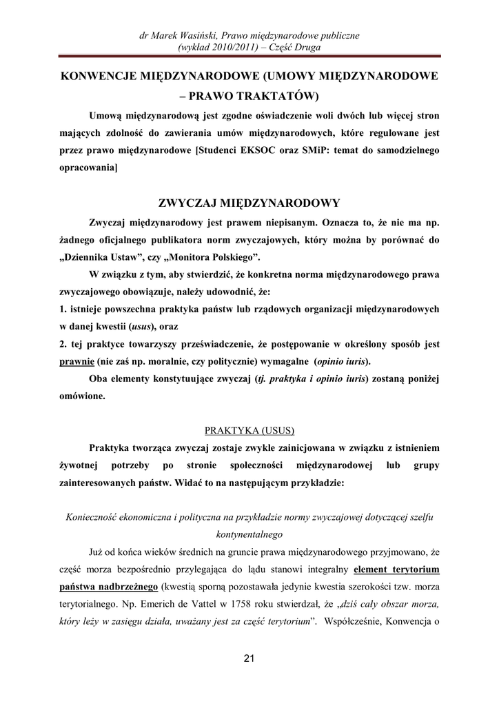 dr Marek Wasiński, Prawo międzynarodowe publiczne (wykład 2010/2011) – Część Druga KONWENCJE MIĘDZYNARODOWE (UMOWY MIĘDZYNARODOWE – PRAWO TRAKTATÓW) Umową międzynarodową jest zgodne oświadczenie woli dwóch lub więcej stron mających zdolność do zawierania umów międzynarodowych, które regulowane jest przez prawo międzynarodowe [Studenci EKSOC oraz SMiP: temat do samodzielnego opracowania] ZWYCZAJ MIĘDZYNARODOWY Zwyczaj międzynarodowy jest prawem niepisanym. Oznacza to, że nie ma np. żadnego oficjalnego publikatora norm zwyczajowych, który można by porównać do „Dziennika Ustaw”, czy „Monitora Polskiego”. W związku z tym, aby stwierdzić, że konkretna norma międzynarodowego prawa zwyczajowego obowiązuje, należy udowodnić, że: 1. istnieje powszechna praktyka państw lub rządowych organizacji międzynarodowych w danej kwestii (usus), oraz 2. tej praktyce towarzyszy przeświadczenie, że postępowanie w określony sposób jest prawnie (nie zaś np. moralnie, czy politycznie) wymagalne (opinio iuris). Oba elementy konstytuujące zwyczaj (tj. praktyka i opinio iuris) zostaną poniżej omówione. PRAKTYKA (USUS) Praktyka tworząca zwyczaj zostaje zwykle zainicjowana w związku z istnieniem żywotnej potrzeby po stronie społeczności międzynarodowej lub grupy zainteresowanych państw. Widać to na następującym przykładzie: Konieczność ekonomiczna i polityczna na przykładzie normy zwyczajowej dotyczącej szelfu kontynentalnego Już od końca wieków średnich na gruncie prawa międzynarodowego przyjmowano, że część morza bezpośrednio przylegająca do lądu stanowi integralny element terytorium państwa nadbrzeżnego (kwestią sporną pozostawała jedynie kwestia szerokości tzw. morza terytorialnego. Np. Emerich de Vattel w 1758 roku stwierdzał, że „dziś cały obszar morza, który leży w zasięgu działa, uważany jest za część terytorium”. Współcześnie, Konwencja o 21 dr Marek Wasiński, Prawo międzynarodowe publiczne (wykład 2010/2011) – Część Druga prawie morza z 1982 roku stanowi, że maksymalna dopuszczalna szerokość morza terytorialnego wynosi 12 mil morskich od tzw. linii podstawowej). Rozwój techniki uczynił aktualną kwestię suwerenności państwa nad obszarami podmorskimi (dno morza, wnętrze ziemi poniżej niego), które zawierają bogate złoża surowców naturalnych. Często dno morza ciągnie się od brzegu, na odległość mniej lub więcej znaczną, na głębokości do 200 m., po czym następuje gwałtowny spad. Tę powierzchnię podmorską między brzegiem a stokiem geologowie nazywają szelfem kontynentalnym (continental shelf). Bardzo często szerokość szelfu jest znacznie większa, niż 12 mil morskich. www.britannica.com Proklamacją prezydenta Trumana z dnia 28 września 1945 roku Stany Zjednoczone jednostronnie ogłosiły, że przyległy do ich terytorium lądowego szelf kontynentalny „należy do Stanów Zjednoczonych, podlegając ich orzecznictwu i władztwu”. Jako uzasadnienie podano, że wobec światowej potrzeby dostępu do nowych źródeł ropy naftowej i innych materiałów, należy popierać eksploatacje złóż podmorskich. Rozsądne ich używanie wówczas tylko będzie możliwe, gdy ustanowi się podmiot właściwy do rozstrzygania w przedmiocie sposobu eksploatacji. Kompetencję zaś taką najsłuszniej przyznać państwu nadbrzeżnemu, jako że szelf kontynentalny stanowi – pod względem geologicznym – przedłużenie terytorium lądowego państwa nadbrzeżnego. Podobne proklamacje wydały wkrótce inne państwa. Proklamacje te (czyli praktyka państw odzwierciedlająca ich przekonanie, co do konieczności przyznania państwom nadbrzeżnym pewnych uprawnień w odniesieniu do szelfu) stanowiły podstawę wykształcenia się zwyczaju międzynarodowego, zgodnie z którym państwo nadbrzeżne ma 22 dr Marek Wasiński, Prawo międzynarodowe publiczne (wykład 2010/2011) – Część Druga wyłączną kompetencję w zakresie eksploatacji zasobów naturalnych szelfu. Państwo nadbrzeżne nie ma obowiązku dzielenia się zasobami swego szelfu z państwami trzecimi. Współcześnie „szelf kontynentalny” definiowany jest przez art. 76 Konwencji o prawie morza z 1982 roku (definicja prawna jest znacznie „szersza” od definicji geologicznej. Wg definicji prawnej szelf kontynentalny obejmuje także zbocze [na powyższym rysunku: continental slope] oraz wzniesienie [na powyższym rysunku: continental rise]). I. Przejawami praktyki są: 1. Konkretne, fizyczne działania i zaniechania państw, np. Sprawa udzielania azylu dyplomatycznego w Chile w 1973 roku Aby ułatwić zrozumienie tego przykładu, wyjaśnijmy na wstępie, że teren misji dyplomatycznej stanowi terytorium państwa przyjmującego (nie zaś wysyłającego) i obowiązuje na nim prawo państwa przyjmującego. Błędem jest zatem stwierdzenie, że teren misji dyplomatycznej stanowi terytorium państwa wysyłającego, że ma charakter eksterytorialny. Pomieszczeniom misji dyplomatycznej przysługuje jednak przywilej nietykalności. Zgodnie bowiem z art. 22 Konwencji wiedeńskiej o stosunkach dyplomatycznych: „1. Pomieszczenia misji są nietykalne. Funkcjonariusze państwa przyjmującego nie mogą do nich wkraczać, chyba że uzyskają na to zgodę szefa misji [Oznacza to, że funkcjonariuszom państwa przyjmującego na teren misji dyplomatycznej wkraczać nie wolno bez zgody szefa misji nawet w przypadku pożaru, czy innego nagłego zdarzenia – dop. MW]. 2. Państwo przyjmujące ma szczególny obowiązek przedsięwzięcia wszelkich stosownych kroków dla ochrony pomieszczeń misji przed jakimkolwiek wtargnięciem lub szkodą oraz zapobieżenia jakiemukolwiek zakłóceniu spokoju misji lub uchybieniu jej godności.” Załóżmy teraz, że badamy, czy istnieje norma zwyczajowego prawa międzynarodowego pozwalająca na udzielanie azylu dyplomatycznego (tzn. czy prawo międzynarodowe pozwala członkom misji dyplomaty