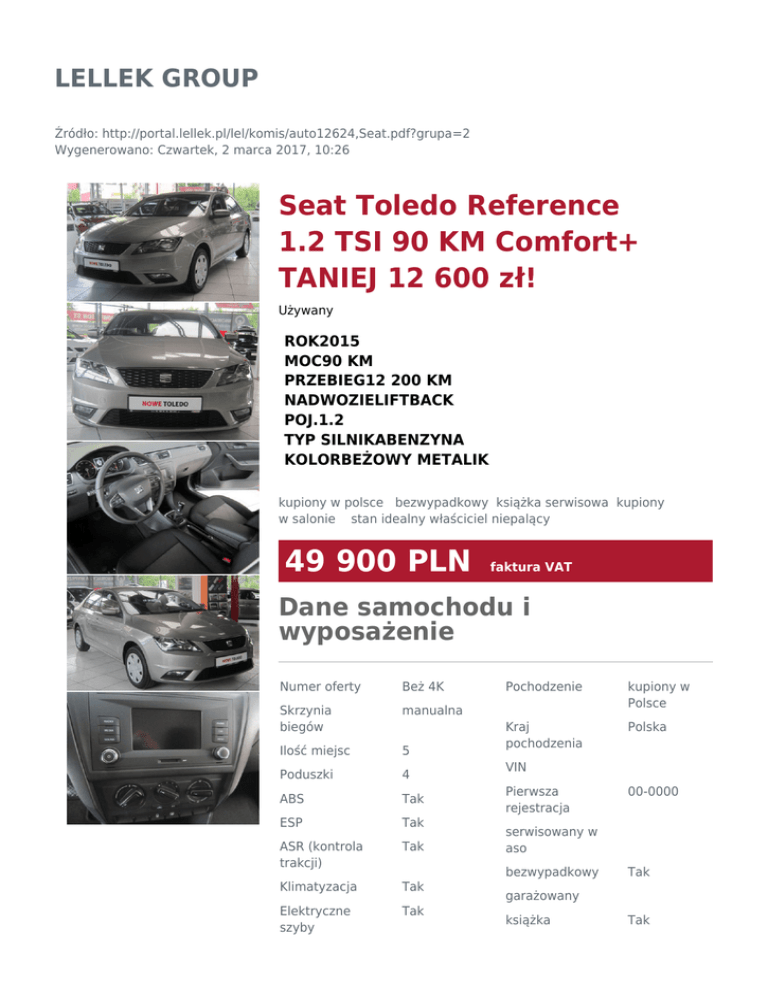 LELLEK GROUP Źródło: http://portal.lellek.pl/lel/komis/auto12624,Seat.pdf?grupa=2 Wygenerowano: Czwartek, 2 marca 2017, 10:26 Seat Toledo Reference 1.2 TSI 90 KM Comfort+ TANIEJ 12 600 zł! Używany ROK2015 MOC90 KM PRZEBIEG12 200 KM NADWOZIELIFTBACK POJ.1.2 TYP SILNIKABENZYNA KOLORBEŻOWY METALIK kupiony w polsce bezwypadkowy książka serwisowa kupiony w salonie stan idealny właściciel niepalący 49 900 PLN faktura VAT Dane samochodu i wyposażenie Numer oferty Beż 4K Skrzynia biegów manualna Ilość miejsc 5 Poduszki 4 ABS Tak ESP Tak ASR (kontrola trakcji) Tak Klimatyzacja Tak Elektryczne szyby Tak Pochodzenie kupiony w Polsce Kraj pochodzenia Polska VIN Pierwsza rejestracja 00-0000 serwisowany w aso bezwypadkowy Tak garażowany książka Tak serwisowa Elektryczne lusterka Tak Wspomaganie kierownicy Tak kupiony w salonie Komputer Tak tunning Radioodtwarza cz Tak homologacja Immobilizer Tak Centralny zamek Tak Światła przeciwmgieln e Tak Czujniki parkowania Tak Kierownica wielofunkcyjna Tak Tempomat Tak Bluetooth Tak Alufelgi Tak Miejsce postoju AUTO CENTRUM NYSA I właściciel Tak stan idealny Tak właściciel niepalący Tak Opis dodatkowy 4 LATA GWARANCJI SEAT - Data I rejestracji - kwiecień 2016! SAMOCHÓD DOSTĘPNY:"OD RĘKI" Wyposażenie dodatkowe: - Pakiet COMFORT+ dla wersji Reference: Czujniki parkowania z tyłu; Media System Colour: 5-calowy kolorowy ekran dotykowy, Radio, Złącza USB, SD, Aux-in, 6 głośników, Bluetooth; Pakiet Comfort Drive (Tempomat, System wykrywania zmęczenia, przednie światła przeciwmgielne z funkcją doświetlenia zakrętów); Wielofunkcyjna skórzana kierownica i gałka zmiany biegów; Elektryczne sterowane szyby z tyłu - Pakiet schowków: Podłokietnik z przodu i z tyłu, siatka z oczkami do mocowania w bagażniku, wieszaki w bagażniku, boczne schowki w bagażniku - Centralny zagłówek z tyłu - Wycieraczka tylnej szyby - Hamulce tarczowe z tyłu - Lakier metalizowany Wyposażenie standardowe wersji REFERENCE: ABS + migające światła „stopu” ESC, EBA, system kontroli ciśnienia powietrza w oponach ze wskaźnikiem ostrzegawczym Poduszka powietrzna kierowcy Asystent Podjazdu Poduszka powietrzna pasażera + poduszka boczna z przodu + system dezaktywacji poduszki pasażera + system przypominający o zapięciu pasów (kierowcy i pasażera) Kurtyna boczna Zaczepy iSOFIX do mocowania fotelika z Top Tether (górny pasek mocujący) 15-calowe felgi stalowe Urban 21/1 Pełnowymiarowe, 15-calowe koło zapasowe (dostępne tylko z 15-calowymi felgami stalowymi) Elektrycznie sterowane i podgrzewane lusterka Zawieszenie typu COMFORT Światła do jazdy dziennej Elektrycznie sterowane szyby boczne z przodu Komputer pokładowy Centralny zamek ze zdalnym sterowaniem Kierownica wielofunkcyjna Fotel kierowcy z regulacją wysokości Składana, dzielona tylna kanapa SPRZEDAŻ POJAZDU FAKTURĄ VAT 23% - MOŻLIWOŚĆ LEASINGU Do każdego samochodu oferujemy Państwu bardzo korzystne formy FINANSOWANIA (kredyt, leasing) oraz możliwość UBEZPIECZENIA samochodu na preferencyjnych warunkach Informacja nie stanowi oferty w rozumieniu art. 66 Kodeksu Cywilnego. Podane dane mają charakter wyłącznie informacyjny. Pełna informacja dostępna jest u handlowca. Sprzedający nie odpowiada za ewentualne błędy lub nieaktualność ogłoszenia. Nota prawna Informacja nie stanowi oferty w rozumieniu art. 66 Kodeksu Cywilnego. Podane dane mają charakter wyłącznie informacyjny. Pełna informacja dostępna jest u handlowca. Sprzedający nie odpowiada za ewentualne błędy lub nieaktualność ogłoszenia. Handlowiec Paweł Bąk +48 77 433 22 21 zapytaj mobile +48 601 758 748 Charakterystyka spalania cykl miejski 6.6 l/100km cykl pozamiejski 4.6 l/100km cykl mieszany 5.4 l/100km emisja CO2 107 g/km Gwarancja Gwarancja dostępna Ubezpieczenie Ubezpieczenie dostępne Kredyt Kredyt dostępny Zeskanuj kod, aby zobaczyć ofertę online
