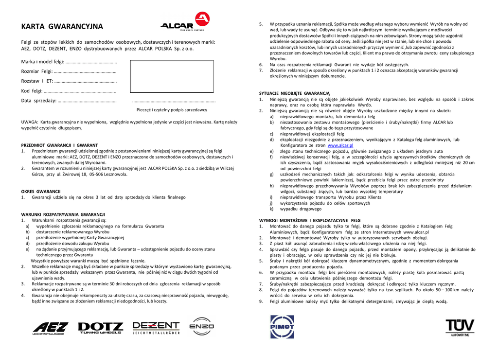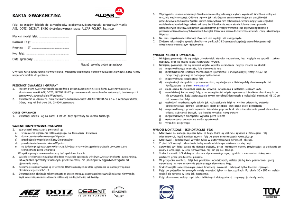 5. KARTA GWARANCYJNA Felgi ze stopów lekkich do samochodów osobowych, dostawczych i terenowych marki: AEZ, DOTZ, DEZENT, ENZO dystrybuowanych przez ALCAR POLSKA Sp. z o.o. Marka i model felgi: …………………………………… 6. 7. Rozmiar Felgi: …………………………………………… W przypadku uznania reklamacji, Spółka może według własnego wyboru wymienić Wyrób na wolny od wad, lub wady te usunąć. Odbywa się to w jak najkrótszym terminie wynikającym z możliwości produkcyjnych dostawców Spółki i innych ciążących na nim zobowiązań. Strony mogą także uzgodnić udzielenie odpowiedniego rabatu od ceny. Jeśli Spółka nie jest w stanie, lub nie chce z powodu uzasadnionych kosztów, lub innych uzasadnionych przyczyn wymienić ,lub zapewnić zgodności z przeznaczeniem dowolnych towarów lub części, Klient ma prawo do otrzymania zwrotu ceny zakupionego Wyrobu. Na czas rozpatrzenia reklamacji Gwarant nie wydaje kół zastępczych. Złożenie reklamacji w sposób określony w punktach 1 i 2 oznacza akceptację warunków gwarancji określonych w niniejszym dokumencie. Rozstaw i ET: …………………………………………… Kod felgi: ………………………………………………….. Data sprzedaży: ………………………………………… ………………………………………………………….. Pieczęć i czytelny podpis sprzedawcy UWAGA: Karta gwarancyjna nie wypełniona, względnie wypełniona jedynie w części jest nieważna. Kartę należy wypełnić czytelnie długopisem. PRZEDMIOT GWARANCJI I GWARANT 1. Przedmiotem gwarancji udzielonej zgodnie z postanowieniami niniejszej karty gwarancyjnej są felgi aluminiowe marki: AEZ, DOTZ, DEZENT i ENZO przeznaczone do samochodów osobowych, dostawczych i terenowych, zwanych dalej Wyrobami. 2. Gwarantem w rozumieniu niniejszej karty gwarancyjnej jest ALCAR POLSKA Sp. z o.o. z siedzibą w Wilczej Górze, przy ul. Żwirowej 18, 05-506 Lesznowola. OKRES GWARANCJI 1. Gwarancji udziela się na okres 3 lat od daty sprzedaży do klienta finalnego WARUNKI ROZPATRYWANIA GWARANCJI 1. Warunkami rozpatrzenia gwarancji są: a) wypełnienie zgłoszenia reklamacyjnego na formularzu Gwaranta b) dostarczenie reklamowanego Wyrobu c) przedłożenie wypełnionej Karty Gwarancyjnej d) przedłożenie dowodu zakupu Wyrobu e) na żądanie przyjmującego reklamację, lub Gwaranta – udostępnienie pojazdu do oceny stanu technicznego przez Gwaranta Wszystkie powyższe warunki muszą być spełnione łącznie. 2. Wszelkie reklamacje mogą być składane w punkcie sprzedaży w którym wystawiono kartę gwarancyjną, lub w punkcie sprzedaży wskazanym przez Gwaranta, nie później niż w ciągu dwóch tygodni od ujawnienia wady. 3. Reklamacje rozpatrywane są w terminie 30 dni roboczych od dnia zgłoszenia reklamacji w sposób określony w punktach 1 i 2. 4. Gwarancja nie obejmuje rekompensaty za utratę czasu, za czasową niesprawność pojazdu, niewygodę, bądź inne związane ze złożeniem reklamacji niedogodności, lub koszty. SYTUACJE NIEOBJĘTE GWARANCJĄ 1. Niniejszą gwarancją nie są objęte jakiekolwiek Wyroby naprawiane, bez względu na sposób i zakres naprawy, oraz na osobę która naprawiała Wyrób. 2. Niniejszą gwarancją nie są również objęte Wyroby uszkodzone między innymi na skutek: a) nieprawidłowego montażu, lub demontażu felg b) niezastosowania zestawu montażowego (pierścienie i śruby/nakrętki) firmy ALCAR lub fabrycznego, gdy felgi są do tego przystosowane c) nieprawidłowej eksploatacji felg d) eksploatacji niezgodnie z przeznaczeniem, wynikającym z Katalogu felg aluminiowych, lub Konfiguratora ze stron www.alcar.pl e) złego stanu technicznego pojazdu, głównie związanego z układem jezdnym auta f) niewłaściwej konserwacji felg, a w szczególności użycia agresywnych środków chemicznych do ich czyszczenia, bądź zastosowania myjek wysokociśnieniowych z odległości mniejszej niż 20 cm od powierzchni felgi g) uszkodzeń mechanicznych takich jak: odkształcenia felgi w wyniku uderzenia, obtarcia powierzchniowe powłoki lakierniczej, bądź przebicia felgi przez ostre przedmioty h) nieprawidłowego przechowywania Wyrobów poprzez brak ich zabezpieczenia przed działaniem wilgoci, substancji żrących, lub bardzo wysokiej temperatury i) nieprawidłowego transportu Wyrobu przez Klienta j) wykorzystania pojazdu do celów sportowych k) wypadku drogowego WYMOGI MONTAŻOWE I EKSPLOATACYJNE FELG 1. Montować do danego pojazdu tylko te felgi, które są dobrane zgodnie z Katalogiem Felg Aluminiowych, bądź Konfiguratorem felg ze stron Internetowych www.alcar.pl 2. Montować i demontować Wyroby tylko w autoryzowanych serwisach obsługi. 3. Z piast kół usunąć zabrudzenia i rdzę w celu właściwego ułożenia na niej felgi. 4. Sprawdzić czy felga pasuje do danego pojazdu, przed montażem opony, przykręcając ją delikatnie do piasty i obracając, w celu sprawdzenia czy nic jej nie blokuje. 5. Śruby i nakrętki kół dokręcać kluczem dynamometrycznym, zgodnie z momentem dokręcania podanym przez producenta pojazdu. 6. W przypadku montażu felgi bez pierścieni montażowych, należy piastę koła posmarować pastą ceramiczną w celu ułatwienia późniejszego demontażu felgi. 7. Śruby/nakrętki zabezpieczające przed kradzieżą dokręcać i odkręcać tylko kluczem ręcznym. 8. Felgi do pojazdów terenowych należy wyważać tylko na tzw. szpilkach. Po około 50 – 100 km należy wrócić do serwisu w celu ich dokręcenia. 9. Felgi aluminiowe należy myć tylko delikatnymi detergentami, zmywając je ciepłą wodą.