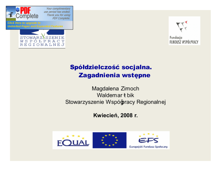Spółdzielczość socjalna. Zagadnienia wstępne Magdalena Zimoch Waldemar Żbik Stowarzyszenie Współpracy Regionalnej Kwiecień, 2008 r. Plan prezentacji 1. Definicja spółdzielni 2. Spółdzielnia socjalna podmiotem ekonomii społecznej 3. Preferencje przyznane spółdzielniom socjalnym 4. Praktyka spółdzielczości socjalnej 5. Zestawienie przydatnych linków i aktów prawnych 1. Definicja spółdzielni • Spółdzielnia jest dobrowolnym zrzeszeniem nieograniczonej liczby osób (z wyjątkiem spółdzielni socjalnych!!!), o zmiennym składzie osobowym i zmiennym funduszu udziałowym, które w interesie swoich członków prowadzi wspólną działalność gospodarczą (prawo spółdzielcze) • Spółdzielnia może prowadzić działalność społeczną i oświatowo-kulturalną na rzecz swoich członków i ich środowiska. 1. Definicja spółdzielni c.d. Co wynika z zaprezentowanej definicji: • Spółdzielnia jest dobrowolnym zrzeszeniem ludzi (a nie kapitału) • Skład osobowy spółdzielni może ulegać zmianom, a co za tym idzie zmienny jest także fundusz udziałowy (Uwaga: W spółdzielni socjalnej liczba członków nie może być mniejsza niż 5 osób!!!) • Spółdzielnia prowadzi działalność gospodarczą w interesie swoich członków 1. Definicja spółdzielni -spółdzielnia socjalna • Przedmiotem działalności spółdzielni socjalnej jest prowadzenie wspólnego przedsiębiorstwa w oparciu o osobistą pracę członków • Spółdzielnia socjalna ma osobowość prawną, działalność gospodarczą prowadzi spółdzielnia a nie jej członkowie • Spółdzielnia socjalna jest szczególnym rodzajem spółdzielni pracy 1. Definicja spółdzielni -spółdzielnia socjalna • Spółdzielnia socjalna działa na rzecz społecznej i zawodowej reintegracji jej członków • Należy przez to rozumieć działania mające na celu odbudowanie i podtrzymanie umiejętności uczestniczenia w życiu społeczności lokalnej i pełnienia ról społecznych w miejscu pracy, zamieszkania lub pobytu, oraz odbudowanie i podtrzymanie zdolności do samodzielnego świadczenia pracy na rynku pracy 1. Definicja spółdzielni -spółdzielnia socjalna Wnioski: • Spółdzielnia socjalna jest podmiotem ekonomii społecznej – prowadzi działalność łączącą cele gospodarcze i społeczne • Obowiązkiem spółdzielni jest zapewnienie pracy członkom, a obowiązkiem członków jest praca w spółdzielni 1. Definicja spółdzielni -spółdzielnia socjalna Członkowie spółdzielni tworzą dla siebie miejsca pracy, zapieniają dochód sobie i swoim rodzinom, tworzą podmiot, za który są odpowiedzialni, od którego zależy przyszłość każdego z nich. W tym celu muszą ze sobą współpracować, ucząc się podtrzymywania więzi międzyludzkich, odnajdywania się w rolach społecznych 1. Definicja spółdzielni -spółdzielnia socjalna Teoria, czyli założenia do ustawy o spółdzielniach socjalnych Spółdzielczość socjalna • jest elementem polityki rządu zmierzającej do ograniczenia zjawiska marginalizacji i wykluczenia społecznego • ma za zadanie m.in. umożliwić osobom bezrobotnym aktywizację zawodową poprzez prowadzenie wspólnego przedsiębiorstwa 1. Definicja spółdzielni -spółdzielnia socjalna Spółdzielczość socjalna : • realizuje zasadę „praca zamiast zasiłku”, wprowadzającą skuteczny mechanizm aktywizacji zawodowej oraz reintegracji zawodowej dla tych, którzy są zagrożeni wykluczeniem z rynku pracy Na podstawie uzasadnienia do ustawy o spółdzielniach socjalnych 2. Spółdzielnia socjalna podmiotem ekonomii społecznej Spółdzielnia socjalna realizuje model działania, który przyczynia się nie tylko do osiągnięcia korzyści ekonomicznych, ale także podtrzymuje i rozwija więzi społeczne. Spółdzielnie socjalne są tzw. firmami społecznymi czyli podmiotami gospodarczymi o rynkowej orientacji, które równocześnie respektują specyficzne potrzeby osób o słabej zatrudnialności i niskich kwalifikacjach, tworząc szereg form tymczasowego i stałego zatrudnienia. 2. Spółdzielnia socjalna podmiotem ekonomii społecznej Idea spółdzielczości socjalnej Działalność gospodarcza Osoby marginalizowane na rynku pracy Spółdzielnia socjalna Inne działania spółdzielni np. w sferze zadań publicznych Reintegracja zawodowa i społeczna 3. Preferencje przyznane spółdzielniom socjalnym Dwie gwarancje i kilka możliwości Gwarancje: zwolnienie spółdzielni z opłat za rejestrację spółdzielni w KRS-ie i Monitorze Sądowym i Gospodarczym, zwolnienie z podatku dochodowego od osób prawnych dochodów wydatkowanych w roku podatkowym na cele społecznej i zawodowej reintegracji członków spółdzielni /w część nie zaliczonej do kosztów uzyskania przychodów/ 3. Preferencje przyznane spółdzielniom socjalnym Możliwości • dotacja na rozpoczęcie działalności gospodarczej w formie spółdzielni socjalnej /źródło, zasady, wymagania/ 3. Preferencje przyznane spółdzielniom socjalnym Możliwości Refundacja składek ZUS /kiedy, w jakim urzędzie, jakie wymagania, dla kogo?/ 3. Preferencje przyznane spółdzielniom socjalnym Możliwości • udział spółdzielni w otwartych konkursach ofert na realizację zadań publicznych /na jakich zasadach, praktyka/ 3. Preferencje przyznane spółdzielniom socjalnym Możliwości • wsparcie w ramach Ośrodków Wsparcia Spółdzielczości Socjalnej /na co, dla kogo, kiedy?/ 4. Praktyka spółdzielczości socjalnej w Polsce Wybrane dane: W okresie 2005 – 2006 powstało około 70 spółdzielni socjalnych. Pod koniec 2007 r. zarejestrowanych już było 139 spółdzielni socjalnych, z czego najwięcej spółdzielni powstało w województwie śląskim (24), wielkopolskim (20), warmińsko – mazurskim (14), a najmniej w województwie kujawsko – pomorskim, świętokrzyskim (po 1) oraz podlaskim (2). 4. Praktyka spółdzielczości socjalnej w Polsce Podejmowane przez spółdzielnie rodzaje dział