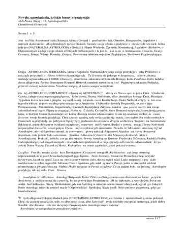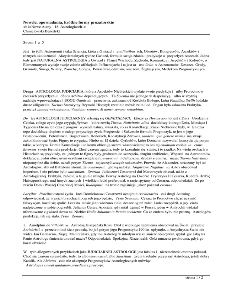 Nowele, opowiadania, krótkie formy prozatorskie <h1>Nowe Ateny - 18. Astrologia</h1> Chmielowski Benedykt Strona 1 z 5 Jest to Filia Astronomii i taka Sciencja, która z Gwiazd i qualitatibus ich, Obrotów, Kongressów, Aspektów i różnych okoliczności Akcydentalnych tychże Gwiazd, formule swoje zdania i predykcje o przyszłych rzeczach. Jedna tedy jest NATURALNA ASTROLOGIA z Gwiazd i Planet Wschodu, Zachodu, Koniunkcyj, Aspektów i Kolorów, o Elementarnych wydaje swoje zdanie affekcjach, Influencjach; i ta jest in usu licito u Astronomów. Deszcze, Grady, Grzmoty, Śniegi, Wiatry, Posuchy, Gorąca, Powietrzną odmianę oraczom, Żeglującym, Medykom Prognostykująca. Druga ASTROLOGIA JUDICIARIA, która z Aspektów Niebieskich wydaje swoje predykcje i niby Proroctwo o rzeczach przyszłych a libera Arbitrio dependujących. Ta Scientia nie jednego w desperacyą, albo w zbytnią nadzieję wprowadzająca i BOGU Omniscio przeciwna, zakazana od Kościoła Bożego, która Fatalibus Stellis ludzkie dusze alligowała. Tacitus Starożytny Rzymski Historyk rzetelnie mówi: że ta i od Pogan była zakazana Praktyka, przecież zawsze wskrzeszona. Vetabitur semper, & tamen semper retinebitur. Do tej ASTROLOGII JUDICIARNEY referują się GENETHLIACI, którzy ex Horoscopo, to jest z Dnia Urodzenia Człeka, całego życia jego erygują figuras, które zowią Thema, Nativitatis, alias dociekłszy którego Dnia, Miesiąca i Tygodnia kto na ten czas z progów wyszedł natury, uważała, co za Konstellacje, Znaki Niebieskie były, w ten czas tego dociekłszy, dopiero o całego przyszłego życia Progressie i Sukcessie formułą Prognostyk, to jest o jego Postanowieniu, Potomstwie, Bogactwach, Honorach, Konstytucji Zdrowia, tandem quo genere mortis ma swoje zakonkludować życie. Figury te erygując, Niebo na 12 dzielą Cyrkułów, które Domami nazywała;, konsyderują potym takie, w którym Domie Konstelacje i co komu obiecują swemi własnościami; to oni tej enuntiant osobie, in cuius favorem swoje formułą predykcje. Choć czasem zgadną, tedy to kazualnie się stanie, i to rzadko: Na wielu osobach w Historiach są przykłady, że jednym te figury były gradusem do szczęścia, drugim szubienicą. Wsparci na Astronomów deklaracyi, jedni obiecanym oszukani szczęściem, evaserunt infelicissimi, drudzy e contra, mając Thema Nativitatis niepomyślne dla siebie, uznali potym Thema najszczęśliwszych sukcessów. Prawda, że Alexander, straszony był od Astrologów, aby od Babylonii stronił, że contempsit, głową nałożył. Augustowi Nigidius ex Astris obiecował imperium, i nie próżne było vaticinium. Spurina Juliuszowi Cesarzowi dni Marcowych obiecał, także z Astrologicznej Praktyki, zabicie, a te go nie minęło. Pewny Astrolog na Dworze Fryderyka II Cesarza, Rudolfa Hrabię Habszpurskiego, nad innych zacnych i wielkich ludzi preferował, o rację spytany od Cesarza, odpowiedział: Że po ześciu Domu Waszej Cesarskiej Mości, Rudolphus na tronie zajaśnieje, jakoż pokazał eventus. Largilus Procilus ostatni życia kres Domicianowi Cesarzowi oznajmił; Aschletarius zaś drugi Astrolog odpowiedział, że w psich brzuchach pogrzeb jego będzie, Teste Svetonio. Cesarz to Proroctwo chcąc uczynić fałszywym, kazał się spalić. Lecz na stosie jeno włożono ciało, deszcz ogień zalał, Ludzi rozpędził, a psy ciało nadpieczone w sobie pogrzebli. Julianus Cesarz Apostata, gdy miał zginąć w Persyi, jeden w Antyochii widział uformowane z gwiazd słowa na Niebie: Hodie Julianus in Persia occidetur. Co że cudem było, nie próżną Astrologów predykcją, tak się stało. Teste Zonara. 1. Arnolphus de Villa-Nova Astrolog Hiszpański Roku 1564 z wielkiego zaćmienia obiecował na Świat przyście Antichristi, a przecie minął się z prawdą, bo już potym jego Prognostyku 190 lat upłynęło, a Antychrysta Świat nie widzi. Jan Galleacius, Xiążę Mediolański, gdy mu Astrolog w młodym wieku śmierć obiecywał, spytał go: Jaką też Panie Astrologu śmiercią umrzeć macie? Odpowiedział: Spokojną. Xiążę rzekł: Otóż umrzesz gwałtowną, gdyż go kazał obwiesić. W tych allegowanych przykładach jaka JUDICJARNEJ ASTROLOGII jest falsitas i nierzetelność eventus pokazał. Choć się czasem sprawdziło, tedy. to albo mero casui, albo Sanctitati życia trzebaby przypisać Astrologa, jeżeli dobry Katolik. Ale Alciatus cale nie akceptuje Prognostyków Astrologicznych mówiąc: Astrologus caveat quidquam praedicere praeceps, strona 1 / 2 Nowele, opowiadania, krótkie formy prozatorskie <h1>Nowe Ateny - 18. Astrologia</h1> Chmielowski Benedykt Nam cadit impostor, dum super Astra volat. To jest: Niech bez rozmysłu wieszczków Astrolog nie kleci, Bo latając po Niebach, stamtąd na łeb zleci. Do ASTROLOGII należą ANNI CLIMACTERICl, Lata podejźrzane,.jaką nie Fortunności pachnące notą i przywarą, które są jedne HEBDOMATICI, to jest Posiódme, po siedm liczb mające. Drugie ENNEATICI, dziewiąte, alias po 9 liczb mające. W samej rzeczy nie co innego znaczą, tylko albo Siódmy, albo Dziewiąty rok Wieku ludzkiego; to jest, że jednemu Człekowi co lat 7 Wieku upłynie, jakieś Metamorphosim, albo Crisim cierpieć musi. Drugiego co lat 9 ubieży życia, także podobnej nieszczęśliwości jakiej na sobie uzna próbę. A najwięcej takich, którym liczba Siódma jest pro periodo, za kres i metę, gdyż to Numerus Mysteriosus, Numerus Sanctus, bo Siódmego dnia P. BÓG requievit ab opere; Siedm słów na Krzyżu wyrzekł CHRYSTUS, Siedm Sakramentów, Siedm dni w tygodniu; Siedm Planet; w Dni 70 Pocieszyciel dusz Duch na świat zesłany, w tyleż dni dana Lex od BOGA Mojżeszowi. Sam wiek ludzki wszystko z siódmej gradatim składa się liczby, i niby siedm ma gradusów, jako świadczy Hypocrates Medyk, bo do lat siedmiu Człek jest PUER dziecię, do drugich siedmiu lat, to jest do czternastu ADOLESCENS, PUBES, wyrostek; do trzecich siedmiu lat, alias do roku 21 JUVENIS, Mło