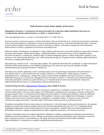 echo www.roedl.pl Rzeczpospolita z 24.09.2014 Podwykonawca może żądać zapłaty od inwestora Odstąpienie od umowy z wykonawcą nie może prowadzić do wyłączenia odpowiedzialności inwestora za wynagrodzenie należne podwykonawcy za roboty w ramach umowy. Tak uznał Sąd Najwyższy w wyroku z 16 kwietnia 2014 r. (V CSK 296/13). Inwestor zawarł z wykonawcą umowę o roboty budowlane, która przewidywała m.in. możliwość powierzenia wykonania części robót podwykonawcy. Wykonawca zawarł z podwykonawcą umowę o wykonanie określonych robót, a inwestor wyraził zgodę na piśmie. Podwykonawca wystawił wykonawcy faktury, wykonawca uregulował część należności. Podwykonawca wniósł o zasądzenie od inwestora pozostałej kwoty. Nakazem zapłaty sąd okręgowy uwzględnił w całości żądanie podwykonawcy (powoda), jednak po rozpoznaniu zarzutów inwestora (pozwanego), uchylił nakaz zapłaty i oddalił powództwo. Powoływał się przy tym na odstąpienia przez inwestora od umowy z wykonawcą. Zdaniem sądu, na skutek odstąpienia umowa o roboty budowlane wygasła ex tunc zarówno co do zobowiązania głównego, jak i zobowiązań akcesoryjnych. Wygasła również solidarna odpowiedzialność inwestora za zapłatę podwykonawcy. Sąd apelacyjny zmienił wyrok – utrzymał nakaz zapłaty. Nie podzielił stanowiska SO i podkreślił, że odpowiedzialność inwestora wobec podwykonawcy ma charakter gwarancyjny. Nie może jej więc niweczyć upadek stosunku zobowiązaniowego łączącego inwestora i wykonawcę. Sąd Najwyższy uchylił zaskarżony wyrok i przekazał sprawę SA do ponownego rozpoznania. SN potwierdził, że rozwiązanie umowy o roboty budowlane nie zwalnia wykonawcy z obowiązków wypływających z umowy o podwykonawstwo. Analogicznie, zdaniem SN, należy oceniać skutki odstąpienia inwestora od umowy o roboty budowlane łączącej go z wykonawcą. Odstąpienie przez inwestora od umowy z wykonawcą nie uchyla obowiązku rozliczenia pomiędzy wykonawcą i podwykonawcą, a w konsekwencji nie może też prowadzić do wyłączenia odpowiedzialności inwestora za wynagrodzenie należne podwykonawcy. Vanina Prokop-Sawicka, radca prawny Warszawa, biurze Rödl & Partner Umowa o roboty budowlane to jedna z umów nazwanych, uregulowana w kodeksie cywilnym (art. 647 i nast. k.c.). Przez zawarcie takiej umowy inwestor zobowiązuje się do dokonania wymaganych przez przepisy czynności związanych z przygotowaniem robót, w szczególności do przekazania terenu budowy i dostarczenia projektu, a także do odebrania obiektu i zapłaty umówionego wynagrodzenia. Obowiązkiem wykonawcy jest oddanie przewidzianego w umowie obiektu, który musi zostać wykonany zgodnie z projektem i z zasadami wiedzy. W umowie strony (inwestor i wykonawca) mogą przewidzieć, że pewien zakres robót może zostać powierzony podwykonawcom. W praktyce dochodziło do niewywiązywania się wykonawców z ich zobowiązań wobec podwykonawców, do regulacji kodeksowej został wprowadzony przepis, który miał ochronić podwykonawców (art. 6471 k.c.). Regulacja miała zapobiegać niepłaceniu za pracę podwykonawców (zazwyczaj małych i średnich firm) oraz miała umożliwiać im dochodzenie roszczeń o zapłatę wynagrodzenia nie tylko względem wykonawcy, ale również inwestora. Przyjęcie konstrukcji ustawowej odpowiedzialności solidarnej za zapłatę wynagrodzenia należnego podwykonawcy nakłada na inwestora dodatkowe ryzyko. Dlatego ustawodawca wprowadził przesłankę zgody inwestora na zawarcie przez wykonawcę umowy z podwykonawcą. Od zgody inwestora uzależnione jest powstanie solidarnej odpowiedzialności z wykonawcą za zapłatę wynagrodzenia podwykonawcy echo informuje Państwa o wizerunku Rödl & Partner w mediach. W Polsce osobą odpowiedzialną za echo jest Radosław Cichoń Rödl & Partner ul. Sienna 73, 00-833 Warszawa, tel. +48 22 696 28 00 E-mail: [email protected] (wyrok SN z 9 kwietnia 2008 r., V CSK 492/07). Zgoda ta może zostać wyrażona w różny sposób: czynny (wyraźna pisemna bądź ustna akceptacja) bądź bierny. Skuteczność zgody wyrażonej w sposób czynny zależna jest m.in. od tego, czy inwestor wiedział: - kto będzie podwykonawcą oraz - jaka jest treść zawartej z podwykonawcą umowy o roboty budowlane (uchwała SN (7) z 29 kwietnia 2008 r.; wyrok SN z 26 czerwca 2008 r., II CSK 80/08; wyrok SN z 11 grudnia 2008 r. IV CSK 323/08; III CZP 6/08; wyrok SN z 4 lutego 2011 r. III CSK 152/10). Natomiast w przypadku zgody wyrażonej w sposób bierny jej skuteczność uzależniona jest m.in. od spełnienia przesłanek wskazanych w art. 6471 § 2 k.c., tj.: - przedstawienia inwestorowi umowy z podwykonawcą lub jej projektu wraz z częścią dokumentacji dotyczącą robót określonych w umowie lub w projekcie oraz - bezskutecznego upływu 14-dniowego terminu na wyrażenie na piśmie sprzeciwu lub zastrzeżeń (wyrok SA w Białymstoku z 9 kwietnia 2014 r., I ACa 898/13). Koniecznym warunkiem powstania obowiązku zapłaty wynagrodzenia przez inwestora jest wykonanie robót przez podwykonawcę, przez co należy rozumieć zrealizowanie części obiektu stanowiącego przedmiot świadczenia wykonawcy na podstawie umowy z inwestorem. Okolicznością usprawiedliwiającą odpowiedzialność solidarną inwestora i wykonawcy jest więc spełnienie części świadczenia wykonawcy na rzecz inwestora, co następuje kosztem podwykonawcy, który nie otrzymuje przysługującego mu wynagrodzenia od wykonawcy (wyrok SN z 17 października 2008 r., I CSK 106/08; wyrok SA w Szczecinie z 10 kwietnia 2014 r., I ACa 30/14). Odpowiedzialność inwestora, powstała w następstwie wyrażenia przez niego zgody na zawarcie umowy podwykonawczej, ma charakter dodatkowej gwarancji ex lege uzyskania wynagrodzenia przez podwykonawcę (wyrok SN z 5 września 2012 r., IV CSK 91/11; wyrok SA w Katowicach z 27 lutego 2014 r., V ACa 764/13; wyrok SA z 27 lutego 2014 r., I ACa 467/13). W orzecznict