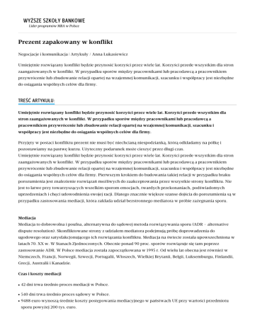WYŻSZE SZKOŁY BANKOWE Lider programów MBA w Polsce Prezent zapakowany w konflikt Negocjacje i komunikacja | Artykuły / Anna Łukasiewicz Umiejętnie rozwiązany konflikt będzie przynosić korzyści przez wiele lat. Korzyści przede wszystkim dla stron zaangażowanych w konflikt. W przypadku sporów między pracownikami lub pracodawcą a pracownikiem przywrócenie lub zbudowanie relacji opartej na wzajemnej komunikacji, szacunku i współpracy jest niezbędne do osiągania wspólnych celów dla firmy. TREŚĆ ARTYKUŁU: Umiejętnie rozwiązany konflikt będzie przynosić korzyści przez wiele lat. Korzyści przede wszystkim dla stron zaangażowanych w konflikt. W przypadku sporów między pracownikami lub pracodawcą a pracownikiem przywrócenie lub zbudowanie relacji opartej na wzajemnej komunikacji, szacunku i współpracy jest niezbędne do osiągania wspólnych celów dla firmy. Przyjęty w postaci konfliktu prezent nie musi być niechcianą niespodzianką, którą odkładamy na półkę i pozostawiamy na pastwę kurzu. Użyteczny podarunek może cieszyć przez długi czas. Umiejętnie rozwiązany konflikt będzie przynosić korzyści przez wiele lat. Korzyści przede wszystkim dla stron zaangażowanych w konflikt. W przypadku sporów między pracownikami lub pracodawcą a pracownikiem przywrócenie lub zbudowanie relacji opartej na wzajemnej komunikacji, szacunku i współpracy jest niezbędne do osiągania wspólnych celów dla firmy. Pierwszym krokiem do budowania takiej relacji w przypadku braku porozumienia jest znalezienie rozwiązań możliwych do zaakceptowania przez wszystkie strony konfliktu. Nie jest to łatwe przy towarzyszących wszelkim sporom emocjach, twardych przekonaniach, podświadomych uprzedzeniach i chęci udowodnienia swojej racji. Dlatego znacznie większe szanse dojścia do porozumienia są w przypadku zastosowania mediacji, która zakłada udział bezstronnego mediatora w próbie zażegnania sporu. Mediacja Mediacja to dobrowolna i poufna, alternatywna do sądowej metoda rozwiązywania sporu (ADR – alternative dispute resolution). Skonfliktowane strony z udziałem mediatora podejmują próbę doprowadzenia do ugodowego oraz satysfakcjonującego ich rozwiązania konfliktu. Mediacja na świecie została upowszechniona w latach 70. XX w. W Stanach Zjednoczonych. Obecnie ponad 90 proc. sporów rozwiązuje się tam poprzez zastosowanie ADR. W Polsce mediacja została zapoczątkowana w 1995 r. Od wielu lat obecna jest również w Niemczech, Francji, Norwegii, Szwecji, Portugalii, Włoszech, Wielkiej Brytanii, Belgii, Luksemburgu, Finlandii, Grecji, Australii i Kanadzie. Czas i koszty mediacji ● 42 dni trwa średnio proces mediacji w Polsce. ● 540 dni trwa średnio proces sądowy w Polsce. ● 9488 euro wynoszą średnie koszty postępowania mediacyjnego w państwach UE przy wartości przedmiotu sporu powyżej 200 tys. euro. ● 34 385 euro wynoszą średnie koszty postępowania sądowego w państwach UE przy wartości przedmiotu sporu powyżej 200 tys. euro. Główne zasady mediacji: ● Dobrowolna – odbywa się tylko wtedy, gdy wszystkie strony wyrażą zgodę na udział w mediacji. ● Akceptowalna – odbywa się tylko wtedy, gdy strony akceptują zasady i procedury postępowania mediacyjnego oraz osobę mediatora. ● Poufna – mediator oraz strony nie ujawnią charakteru ani żadnych szczegółów mediacji bez zgody wszystkich zaangażowanych w nią stron. ● Bezstronna – mediator nie staje po żadnej ze stron. Nie ocenia i nie wskazuje, kto ma rację. ● Neutralna – mediator jest całkowicie neutralny wobec przedmiotu sporu. Główne kroki mediacji: 1. Podjęcie decyzji i zgłoszenie się do mediatora 2. Zgoda wszystkich stron na mediację 3. Indywidualne spotkania mediatora ze stronami 4. Wspólne spotkanie/spotkania stron i mediatora a) Określenie zasad mediacji b) Określenie przedmiotu sporu c) Omówienie przyczyn zaistniałego konfliktu d) Nazwanie problemów oraz towarzyszących im emocji e) Szukanie wszelkich możliwych rozwiązań sytuacji f) Konstruowanie rozwiązania satysfakcjonującego wszystkie strony konfliktu g) Decyzja o ugodzie lub braku ugody bądź kontynuacji mediacji na kolejnym spotkaniu 5. Podpisanie ugody, jeśli została zawarta 6. Sporządzenie protokołu z mediacji Przedsiębiorcy wybierają mediację zamiast sądu ze względu na: ● oszczędność kosztów → 85 proc. ● oszczędność czasu członków zarządu, kluczowego personelu i prawników → 80 proc. ● szybkie rezultaty → 78 proc. ● zachowanie dobrych, partnerskich stosunków → 72 proc. ● większą satysfakcję stron → 70‒75 proc. ● poufność → 72 proc. Rola mediatora Mediator jest osobą wspierająca i moderującą przebieg mediacji. Łagodzi powstające napięcia i pomaga we wzajemnym zrozumieniu problemu oraz wypracowaniu kompromisu. Nie ma kompetencji do podejmowania decyzji merytorycznych. Nie powinien również osądzać i wskazywać, kto ma rację. Jego zadaniem jest pomoc w dobrowolnym osiągnięciu porozumienia przez strony. Zbudowanie atmosfery wzajemnego szacunku i bezpieczeństwa. Strony przed przystąpieniem do mediacji powinny zaakceptować osobę mediatora. W przeciwnym razie rozpoczęcie mediacji z tym mediatorem nie ma sensu i należy wybrać innego, który wzbudzi zaufanie. Osoba pełniąca tę funkcję powinna posiadać dużo tolerancji, dystansu, zrozumienia i szacunku. Potrafić słuchać, wyciągać rzeczywiste wnioski, trafnie zadawać pytania i pomoc uczestnikom mediacji znaleźć pierwszą nić porozumienia. Rola stron Skonfliktowane osoby – czyli strony sporu ‒ patrzą wyłącznie ze swojego punktu widzenia. Dostrzegają swoje potrzeby i oczekiwania. Zazwyczaj nie wierzą, że konflikt można rozwiązać ugodowo. Nie wyobrażają sobie żadnego pójścia na kompromis, a już tym bardziej przyznania się do błędu. Dla nich sytuacja jest oczywista – mają rację. Dlatego trudno jest o konsensus, tym 