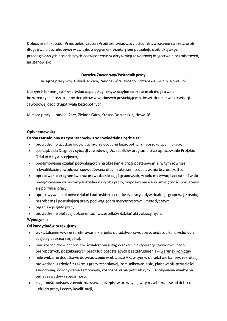 Dolnośląski Inkubator Przedsiębiorczości i Arbitrażu świadczący usługi aktywizacyjne na rzecz osób długotrwale bezrobotnych w związku z wygranym przetargiem poszukuje osób aktywnych i przedsiębiorczych posiadających doświadczenie w aktywizacji zawodowej długotrwale bezrobotnych, na stanowisko: Doradca Zawodowy/Pośrednik pracy Miejsce pracy woj. Lubuskie: Żary, Zielona Góra, Krosno Odrzańskie, Gubin, Nowa Sól Naszym Klientem jest firma świadcząca usługi aktywizacyjne na rzecz osób długotrwale bezrobotnych. Poszukujemy doradców zawodowych posiadających doświadczenie w aktywizacji zawodowej osób długotrwale bezrobotnych. Miejsce pracy: lubuskie, Żary, Zielona Góra, Krosno Odrzańskie, Nowa Sól Opis stanowiska Osoba zatrudniona na tym stanowisku odpowiedzialna będzie za: prowadzenie spotkań indywidualnych z osobami bezrobotnymi i poszukującymi pracy, sporządzania Diagnozy sytuacji zawodowej Uczestników programu oraz opracowanie Projektu Działań Aktywizacyjnych, podejmowanie działań pozwalających na określenie drogi postępowania, w tym również rekwalifikację zawodową, spowodowaną długim okresem pozostawania bez pracy, itp., opracowanie programów oraz prowadzenie zajęć grupowych, w celu motywacji uczestników do podejmowania wzmożonych działań na rynku pracy, wyposażenia ich w umiejętności poruszania się po rynku pracy, opracowywanie planów działań i autorskich scenariuszy pracy indywidualnej i grupowej z osobą bezrobotną i poszukującą pracy pod względem merytorycznym i metodycznym, organizacja giełd pracy, prowadzenie bieżącej dokumentacji Uczestników działań aktywizacyjnych. Wymagania Od kandydatów oczekujemy: wykształcenie wyższe (preferowane kierunki: doradztwo zawodowe, pedagogika, psychologia, socjologia, praca socjalna), min. roczne doświadczenie w świadczeniu usług w zakresie aktywizacji zawodowej osób bezrobotnych, poszukujących pracy lub pozostających bez zatrudnienia – warunek koniczny mile widziane dodatkowe doświadczenie w obszarze HR, w tym w doradztwie kariery, rekrutacji, prowadzeniu szkoleń z zakresu pracy zespołowej, komunikowania się, planowania przyszłości zawodowej, dokonywania samooceny, rozpoznawania potrzeb rynku, zdobywania wiedzy na temat zawodów i specjalności, znajomość podstaw zawodoznawstwa, przepisów prawnych, w tym zwłaszcza zasad doboru ludzi do pracy i oceny kwalifikacji, znajomość przepisów ustawy o promocji zatrudnienia i instytucjach rynku pracy, umiejętność prowadzenia rozmów i nastawienie na chęć pomocy ludziom przez dłuższy okres czasu, umiejętności organizacyjne, wysoki poziom odpowiedzialności za wykonywane zadania, czynne prawo jazdy kat. B. Nasz Klient oferuje: pracę w oparciu o umowę o pracę, atrakcyjne warunki zatrudnienia (stawkę podstawową wraz z premią uzależnioną od osiągniętych rezultatów), niezbędne narzędzia pracy, bogaty pakiet socjalny (kartę MultiSport, opiekę medyczną, ubezpieczenie na życie) dużą swobodę działań i partnerską atmosferę pracy, możliwość pracy przy innowacyjnym programie działań aktywizacyjnych dla osób długotrwale bezrobotnych. Aplikacje prosimy przesyłać na adres: [email protected] Prosimy o załączenie klauzuli: „Wyrażam zgodę na przetwarzanie moich danych osobowych, udostępnionych w złożonych przeze mnie dokumentach w ofercie pracy dla potrzeb niezbędnych do realizacji procesu rekrutacji, zgodnie z ustawą z dnia 29 sierpnia 1997 r. o ochronie danych osobowych (t. j. Dz. U. z 2014 r. , poz.1182, 1662)”.