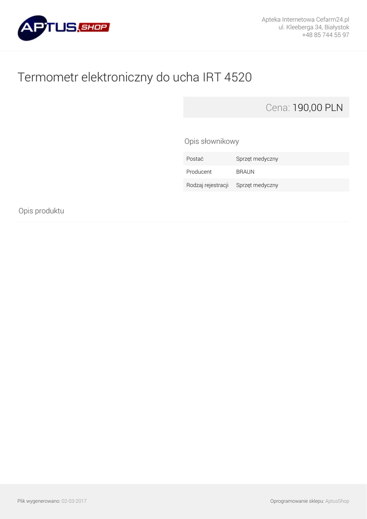 Apteka Internetowa Cefarm24.pl ul. Kleeberga 34, Białystok +48 85 744 55 97 Termometr elektroniczny do ucha IRT 4520 Cena: 190,00 PLN Opis słownikowy Postać Sprzęt medyczny Producent BRAUN Rodzaj rejestracji Sprzęt medyczny Opis produktu Plik wygenerowano: 02-03-2017 Powered by TCPDF (www.tcpdf.org) Oprogramowanie sklepu: AptusShop