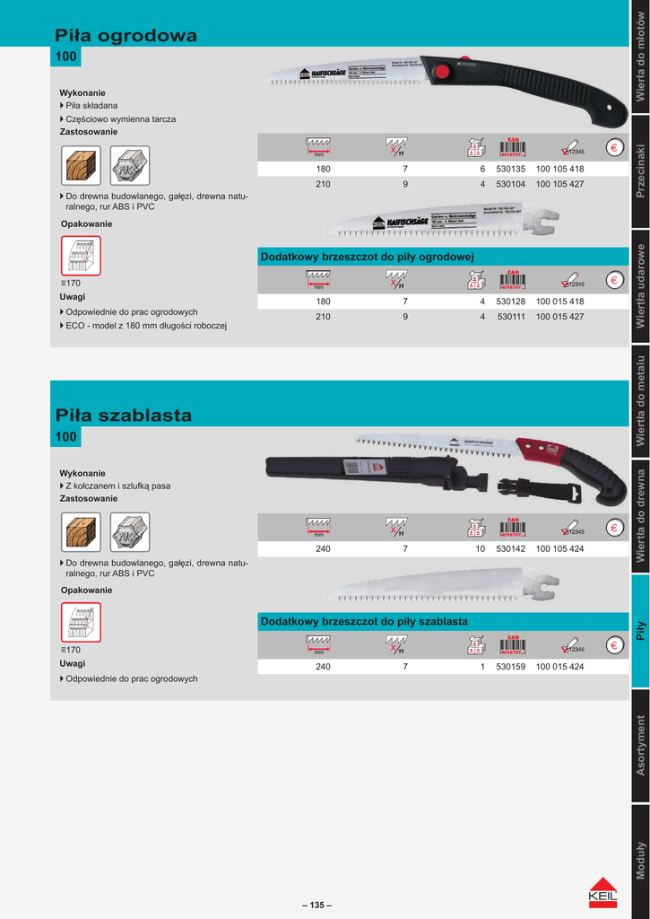 Wierła do młotów Piła ogrodowa 100 Wykonanie ``Piła`składana ``Częściowo`wymienna`tarcza Zastosowanie 180 7 6 530135 100`105`418 210 9 4 530104 100`105`427 ``Do`drewna`budowlanego,`gałęzi,`drewna`naturalnego,`rur`ABS`i`PVC Przecinaki Infobox_Ausfueh Dodatkowy brzeszczot do piły ogrodowej ≡1̀70` ``ECO`-`model`z`180`mm`długości`roboczej 180 7 4 530128 100`015`418 210 9 4 530111 100`015`427 240 7 10 530142 100`105`424 1 530159 100`015`424 Wiertła do metalu ``Odpowiednie`do`prac`ogrodowych Piła szablasta 100 ``Do`drewna`budowlanego,`gałęzi,`drewna`naturalnego,`rur`ABS`i`PVC Opakowanie Piły Dodatkowy brzeszczot do piły szablasta ≡1̀70` Uwagi 240 7 Asortyment ``Odpowiednie`do`prac`ogrodowych Moduły Infobox_Ausfueh Wykonanie ``Z`kołczanem`i`szlufką`pasa Zastosowanie Wiertła do drewna Uwagi Wiertła udarowe Opakowanie – 135 –