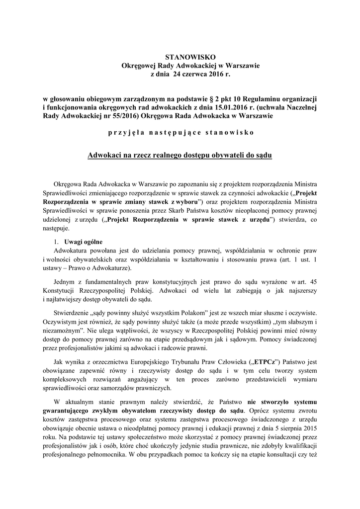 STANOWISKO Okręgowej Rady Adwokackiej w Warszawie z dnia 24 czerwca 2016 r. w głosowaniu obiegowym zarządzonym na podstawie § 2 pkt 10 Regulaminu organizacji i funkcjonowania okręgowych rad adwokackich z dnia 15.01.2016 r. (uchwała Naczelnej Rady Adwokackiej nr 55/2016) Okręgowa Rada Adwokacka w Warszawie przyjęła następujące stanowisko Adwokaci na rzecz realnego dostępu obywateli do sądu Okręgowa Rada Adwokacka w Warszawie po zapoznaniu się z projektem rozporządzenia Ministra Sprawiedliwości zmieniającego rozporządzenie w sprawie stawek za czynności adwokackie („Projekt Rozporządzenia w sprawie zmiany stawek z wyboru”) oraz projektem rozporządzenia Ministra Sprawiedliwości w sprawie ponoszenia przez Skarb Państwa kosztów nieopłaconej pomocy prawnej udzielonej z urzędu („Projekt Rozporządzenia w sprawie stawek z urzędu”) stwierdza, co następuje. 1. Uwagi ogólne Adwokatura powołana jest do udzielania pomocy prawnej, współdziałania w ochronie praw i wolności obywatelskich oraz współdziałania w kształtowaniu i stosowaniu prawa (art. 1 ust. 1 ustawy – Prawo o Adwokaturze). Jednym z fundamentalnych praw konstytucyjnych jest prawo do sądu wyrażone w art. 45 Konstytucji Rzeczypospolitej Polskiej. Adwokaci od wielu lat zabiegają o jak najszerszy i najłatwiejszy dostęp obywateli do sądu. Stwierdzenie „sądy powinny służyć wszystkim Polakom” jest ze wszech miar słuszne i oczywiste. Oczywistym jest również, że sądy powinny służyć także (a może przede wszystkim) „tym słabszym i niezamożnym”. Nie ulega wątpliwości, że wszyscy w Rzeczpospolitej Polskiej powinni mieć równy dostęp do pomocy prawnej zarówno na etapie przedsądowym jak i sądowym. Pomocy świadczonej przez profesjonalistów jakimi są adwokaci i radcowie prawni. Jak wynika z orzecznictwa Europejskiego Trybunału Praw Człowieka („ETPCz”) Państwo jest obowiązane zapewnić równy i rzeczywisty dostęp do sądu i w tym celu tworzy system kompleksowych rozwiązań angażujący w ten proces zarówno przedstawicieli wymiaru sprawiedliwości oraz samorządów prawniczych. W aktualnym stanie prawnym należy stwierdzić, że Państwo nie stworzyło systemu gwarantującego zwykłym obywatelom rzeczywisty dostęp do sądu. Oprócz systemu zwrotu kosztów zastępstwa procesowego oraz systemu zastępstwa procesowego świadczonego z urzędu obowiązuje obecnie ustawa o nieodpłatnej pomocy prawnej i edukacji prawnej z dnia 5 sierpnia 2015 roku. Na podstawie tej ustawy społeczeństwo może skorzystać z pomocy prawnej świadczonej przez profesjonalistów jak i osób, które choć ukończyły jedynie studia prawnicze, nie zdobyły kwalifikacji profesjonalnego pełnomocnika. W obu przypadkach pomoc ta kończy się na etapie konsultacji czy też napisania krótkiego pisma. Na tę pomoc Rząd w najbliższych latach ma zamiar przeznaczyć ponad 1 miliard złotych. Jednocześnie w Polsce funkcjonują jedne z najwyższych, jeśli nie najwyższe, opłaty sądowe w Europie1. Przykładowo, jeżeli strona chce dochodzić odszkodowania w kwocie 20.000 zł poniesionego na skutek czyjegoś zaniedbania (np. zalanie mieszkania) uiścić musi opłatę sądową w wysokości 1.000 zł. Z obowiązku ponoszenia tych kosztów może zwolnić sąd po analizie sytuacji majątkowej uczestnika postępowania. Jak często się zdarza, osoba zarabiająca 2.000 zł i posiadająca niewielkie mieszkanie odziedziczone po rodzicu nie zostanie zwolniona od opłaty wynoszącej 1000 zł. Przyjmuje się bowiem (wbrew orzecznictwu organów międzynarodowych, w tym Europejskiego Trybunału Praw Człowieka – „ETPCz”) niewłaściwe stanowisko, że przygotowując się do procesu obowiązkiem strony było zgromadzenie odpowiednich środków, w tym poprzez spieniężenie swojego majątku. Mimo możliwości uzyskania przedsądowej pomocy prawnej na proces sądowy już obywatela nie stać. Oprócz polskiej Konstytucji prawo do sądu jest również gwarantowane w art. 6 Konwencji o Ochronie Praw Człowieka i Podstawowych Wolności. ETPCz wielokrotnie jasno stwierdzał, że jednym z warunków dostępu do sądu, w tym do rzetelnego procesu jest zagwarantowanie mechanizmu rzetelnej oceny stanu majątkowego strony postępowania i takiego miarkowania opłaty sądowej, aby nie ograniczała ona prawa do sądu. Tymczasem w wielu sprawach rozpatrywanych przez ETPCz przeciwko Polsce Trybunał stwierdzał, że koszty sądowe w Polsce są nieadekwatnie wysokie w stosunku do przedmiotów i okoliczności sprawy.2 Dotyczy to również podmiotów prowadzących działalność gospodarczą.3 Jak stwierdził ETPCz w jednym ze swoich orzeczeń: „Opłata sądowa nałożona na strony postępowania cywilnego stanowi ograniczenie, które [może] naruszyć samą istotę przysługującego skarżącym prawa dostępu do sądu gwarantowanego przez art. 6 ust. 1 Konwencji. [...] Wysokość opłat sądowych oceniana w okolicznościach danej sprawy, włącznie z możliwością pokrycia ich przez skarżącego oraz z etapem postępowania, na jakim ograniczenie takie jest nakładane, są czynnikami o zasadniczym znaczeniu dla rozstrzygnięcia, czy danej osobie przysługiwało prawo dostępu do sądu.”4 Jednym z elementów realizacji rzeczywistego dostępu obywatela do sądu są przepisy regulujące stawki za czynności adwokackie i radcowskie w sprawach tak z urzędu jak i z wyboru. Obowiązujące obecnie przepisy prawa są na tyle skomplikowane że to właśnie udział pełnomocników profesjonalnych gwarantuje realny, materialny dostęp do sądu rozumiany jako możliwość faktycznej obrony swoich interesów przed powołanym do tego organem państwowym. Przykładowo sama procedura karna była nowelizowana w przeciągu bieżącego roku kilkukrotnie. Zmiana stawek dokonana w 2015 r. była, jak należy rozumieć, próbą wyjścia naprzeciw realiom rynkowym, odpowiedzią na pytanie, dlaczego stawki te nie wzrosły od 13 lat, chociaż ju